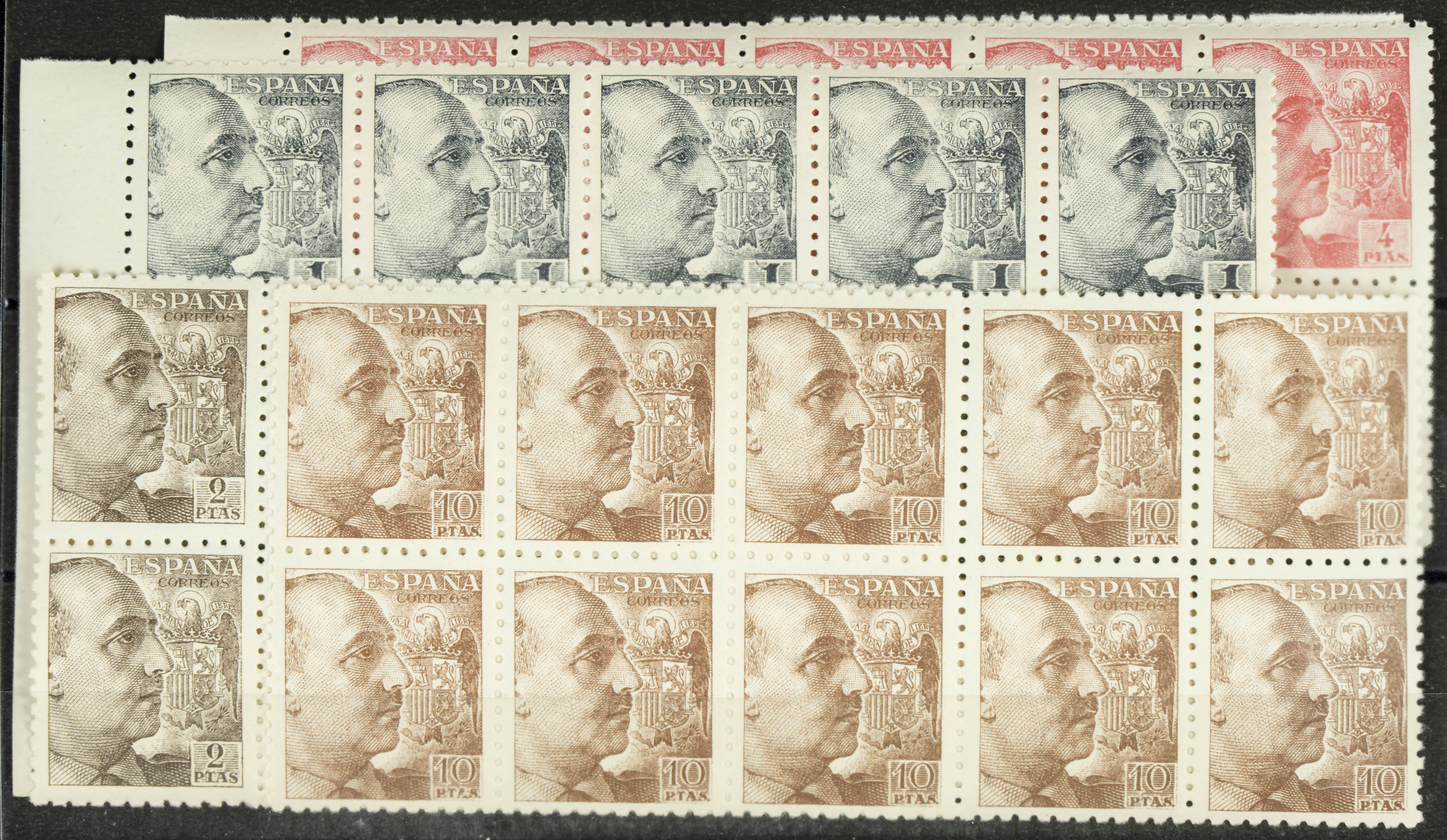 ★★ 930, 932/33, 935(10). 1940. 1 pt slate, 2 pt chestnut, 4 pt rose, and 10 pt chestnut, ten stamps of each, in blocks. FRANCO (coarse perforation) (excellent centering). TO BE EXAMINED. Edifil 2026: 820 Euros