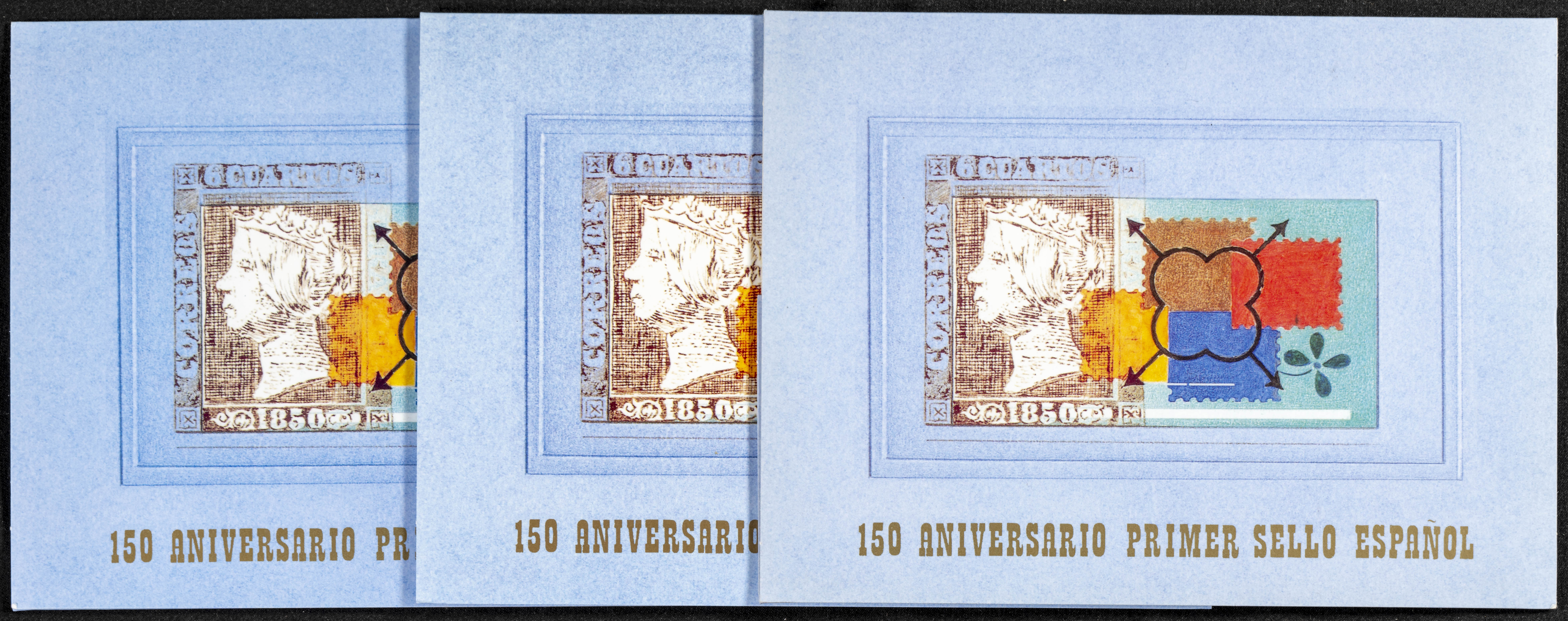 ★★ 3711AC. 2000. Three folders commemorating the 150th Anniversary of the Spanish Stamp. Magnificent. Edifil 2026: 300 Euros