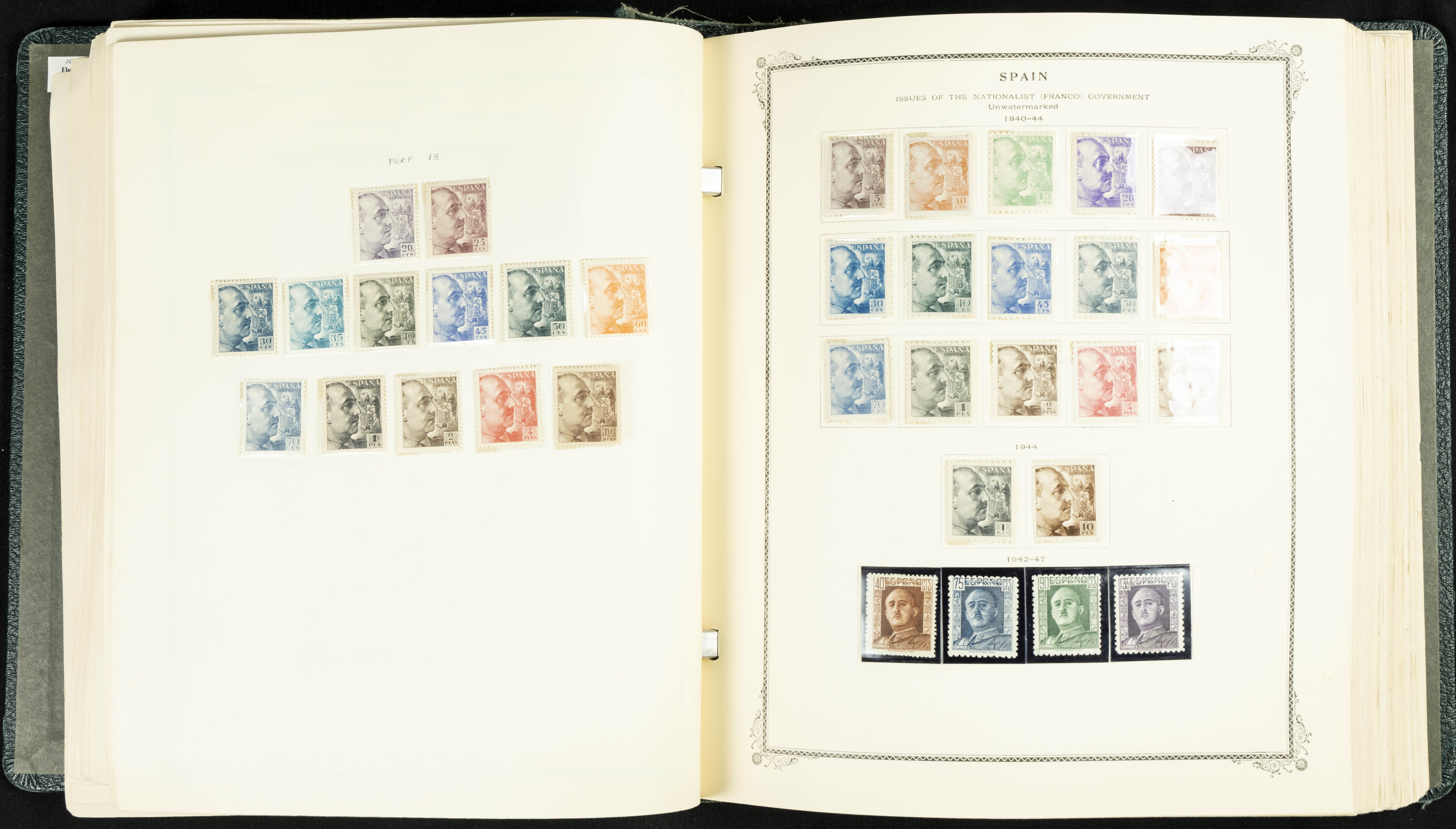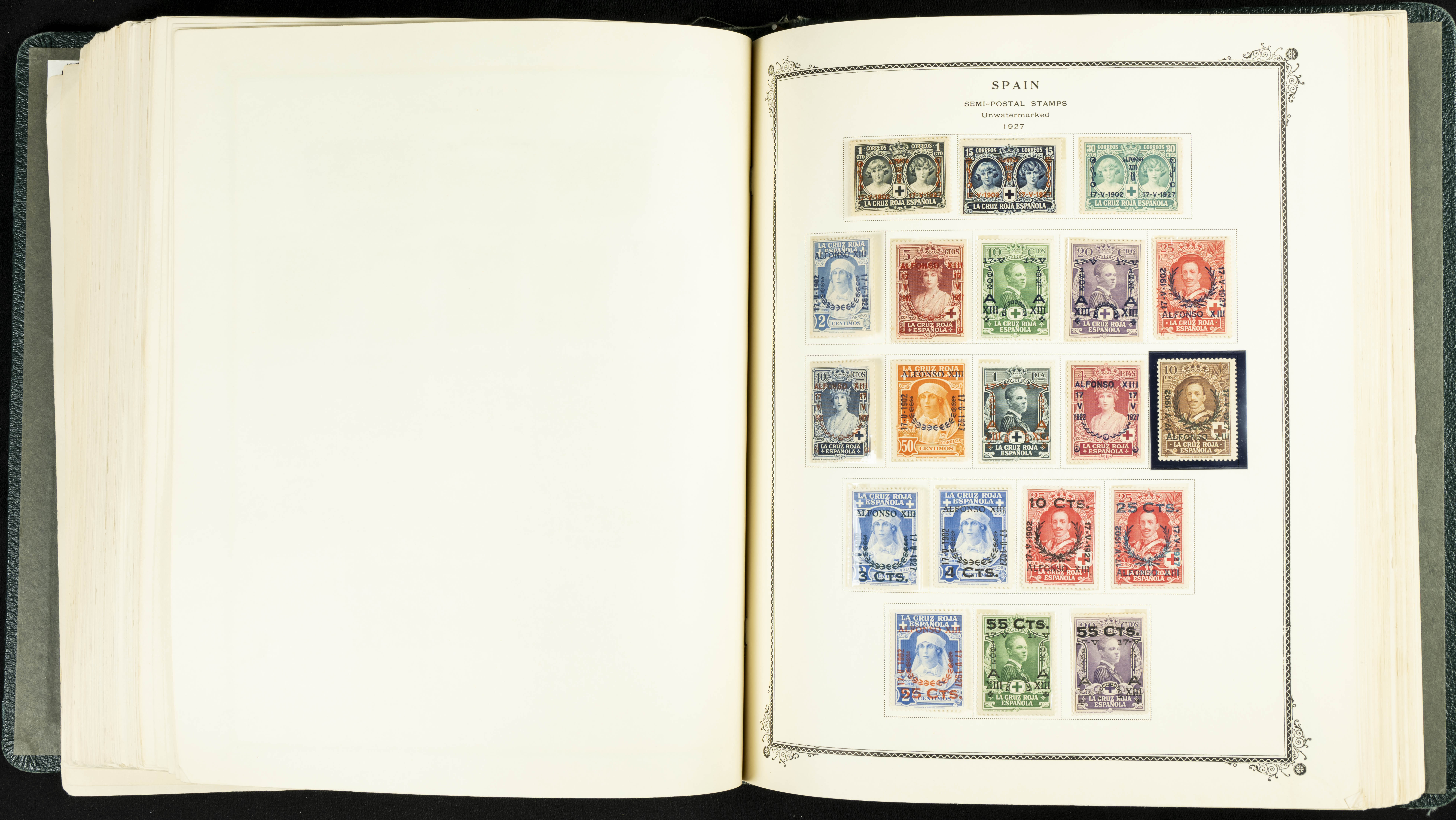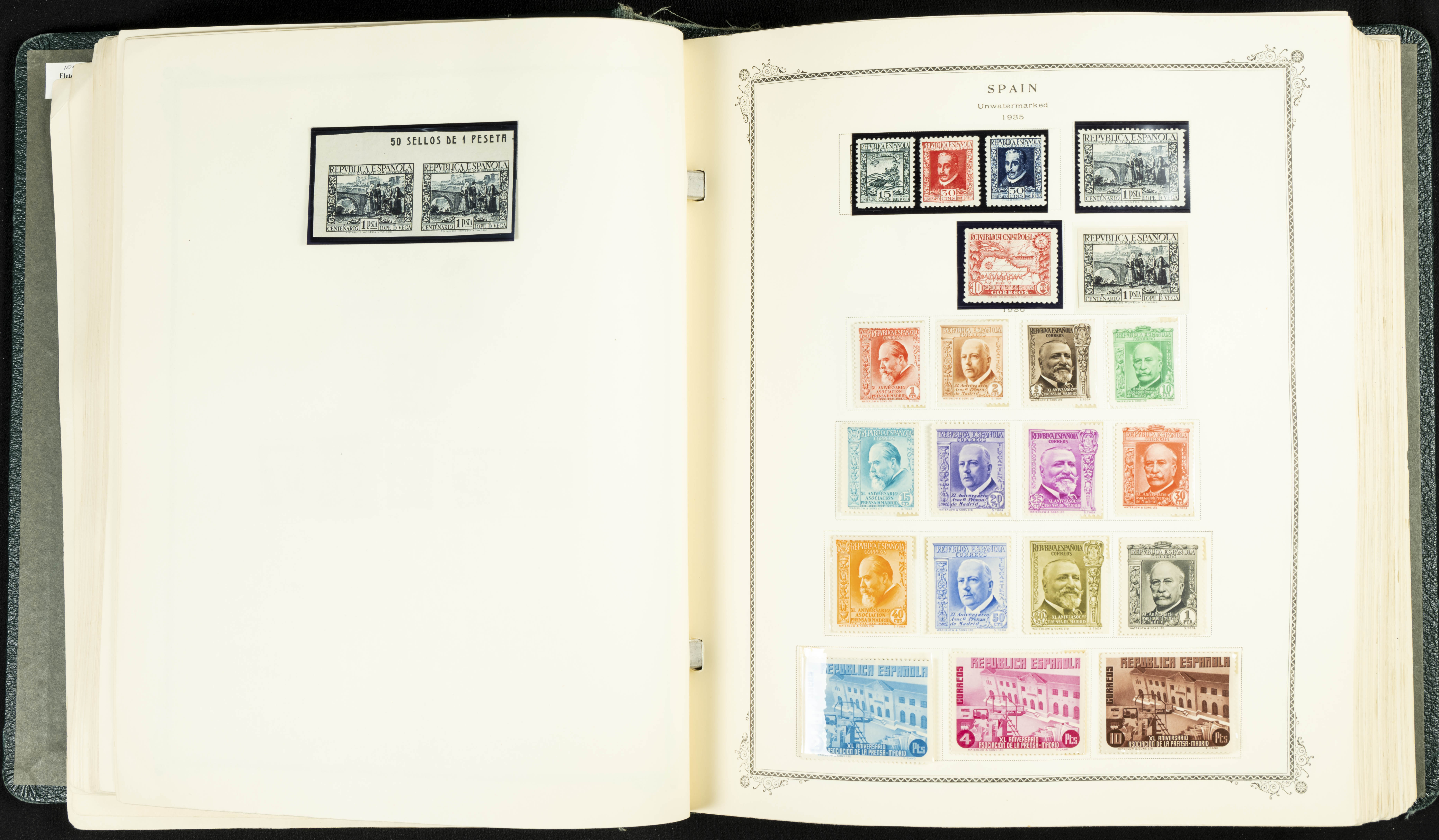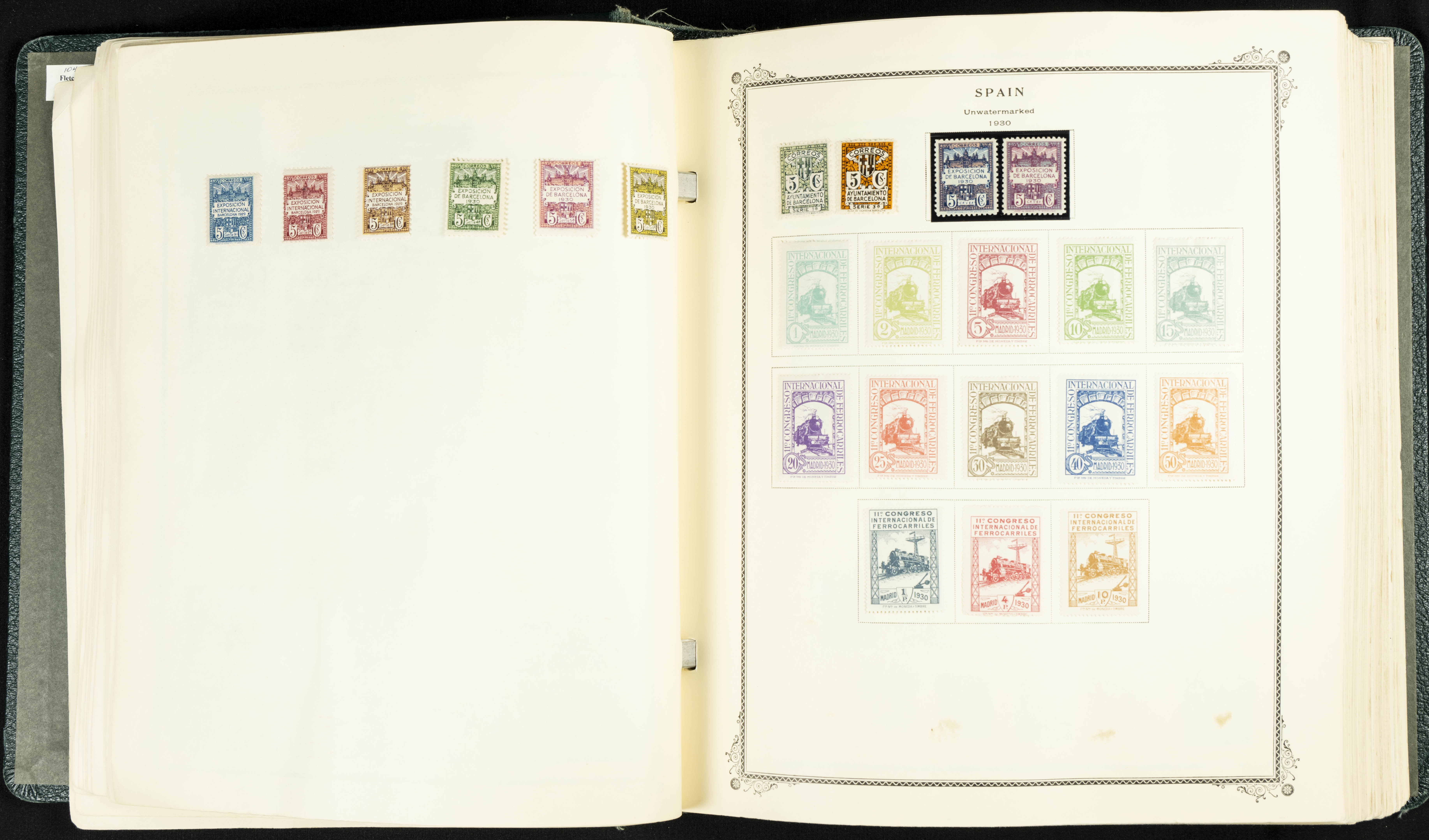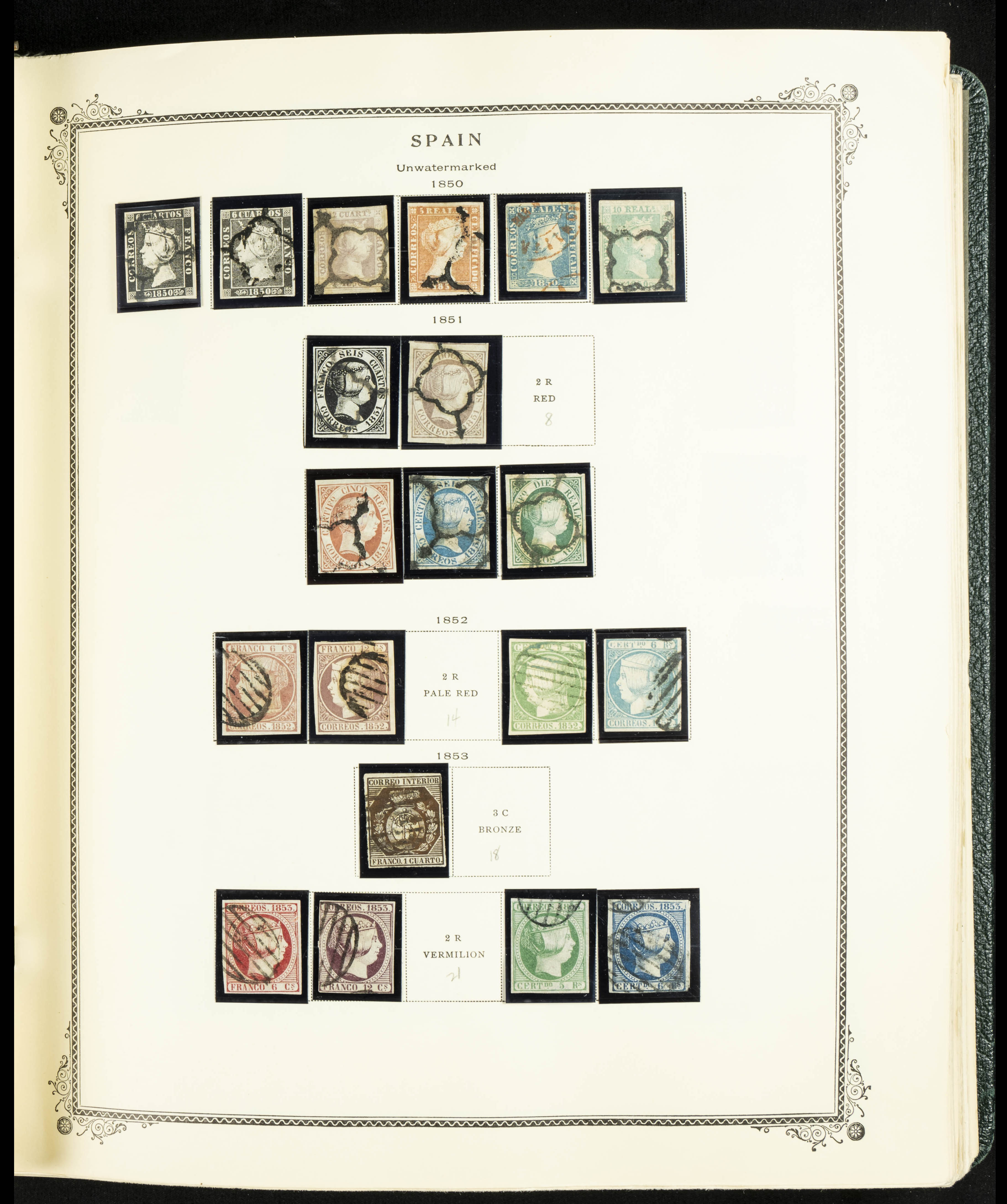 ★/(1850ca). A very interesting collection between 1850 and 1974, in mint and used coins. The classic part is very well represented, and most of the coins are used, including a complete series from 1850, 1851, 1852, and 1853, missing the 2 reales, 2 cuartos (green), and 1 real (blue) coins from 1854. Also included are most of the 19 cuartos, 4 pesetas from Amadeo and the First Republic, and most of the coins from 1876 to 1889. From 1901 onwards, everything is mint, including series such as Cadet, Quixote, Medallion, UPU, Red Cross (all of them), Railways, Montserrat (duplicate with A000000), Personalities, Militia, Granada, Franco (all of them), Pilar, "Falla and Zuloaga", Centenary, etc. It includes numerous varieties, imperforate, color changes, and some Patriotic Issues. EXTREMELY HIGH CATALOG VALUE. MUST BE EXAMINED.