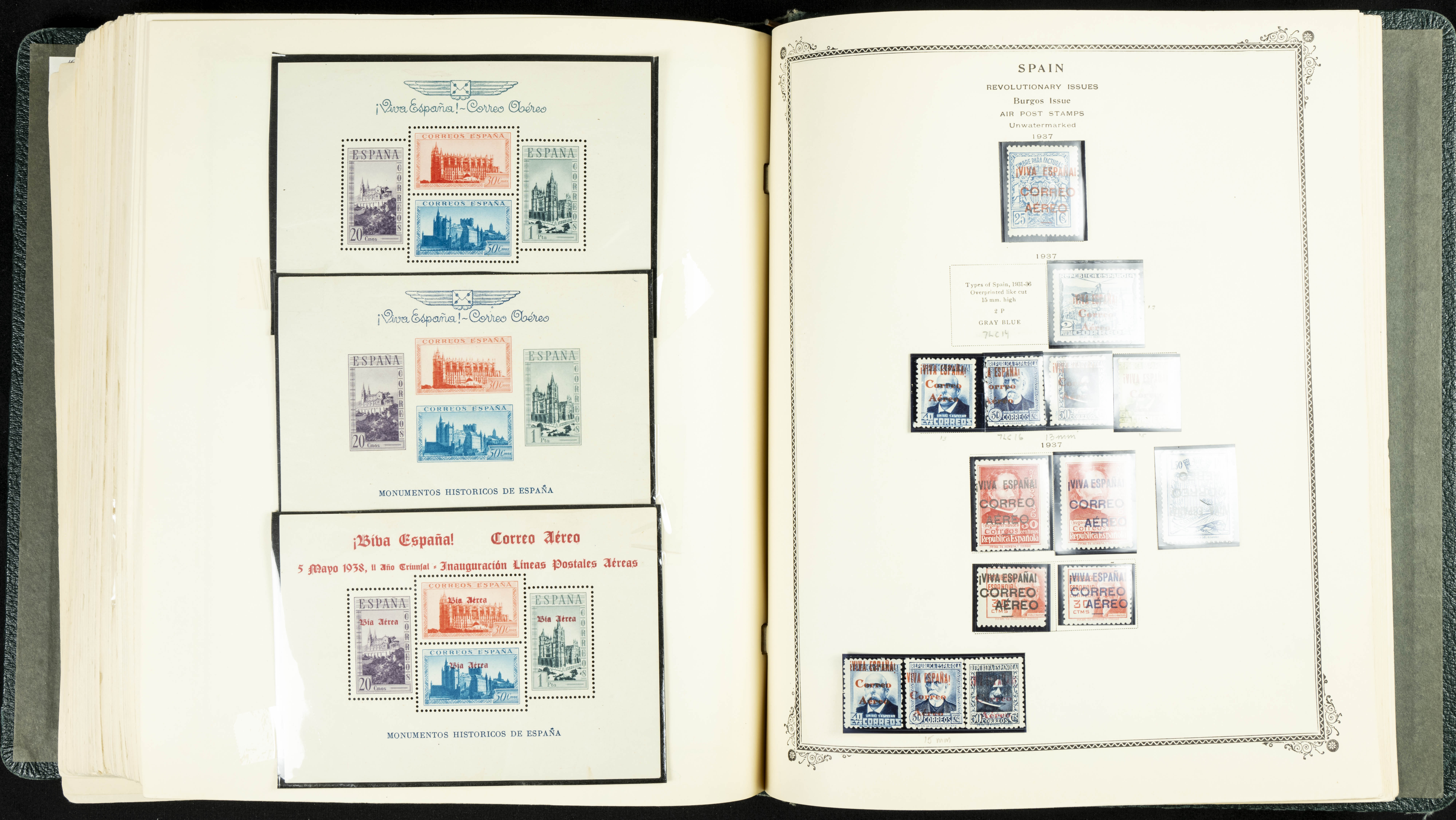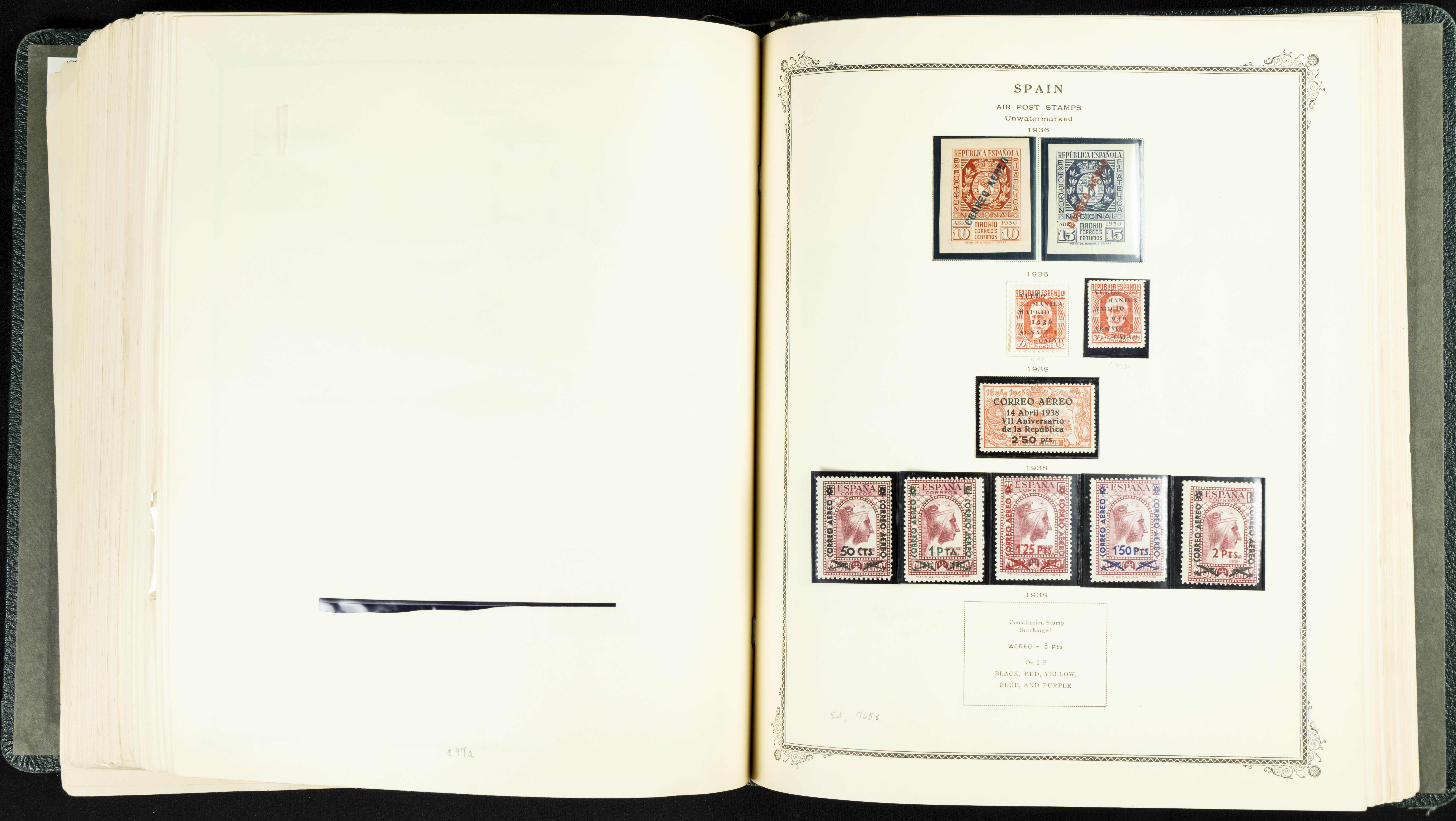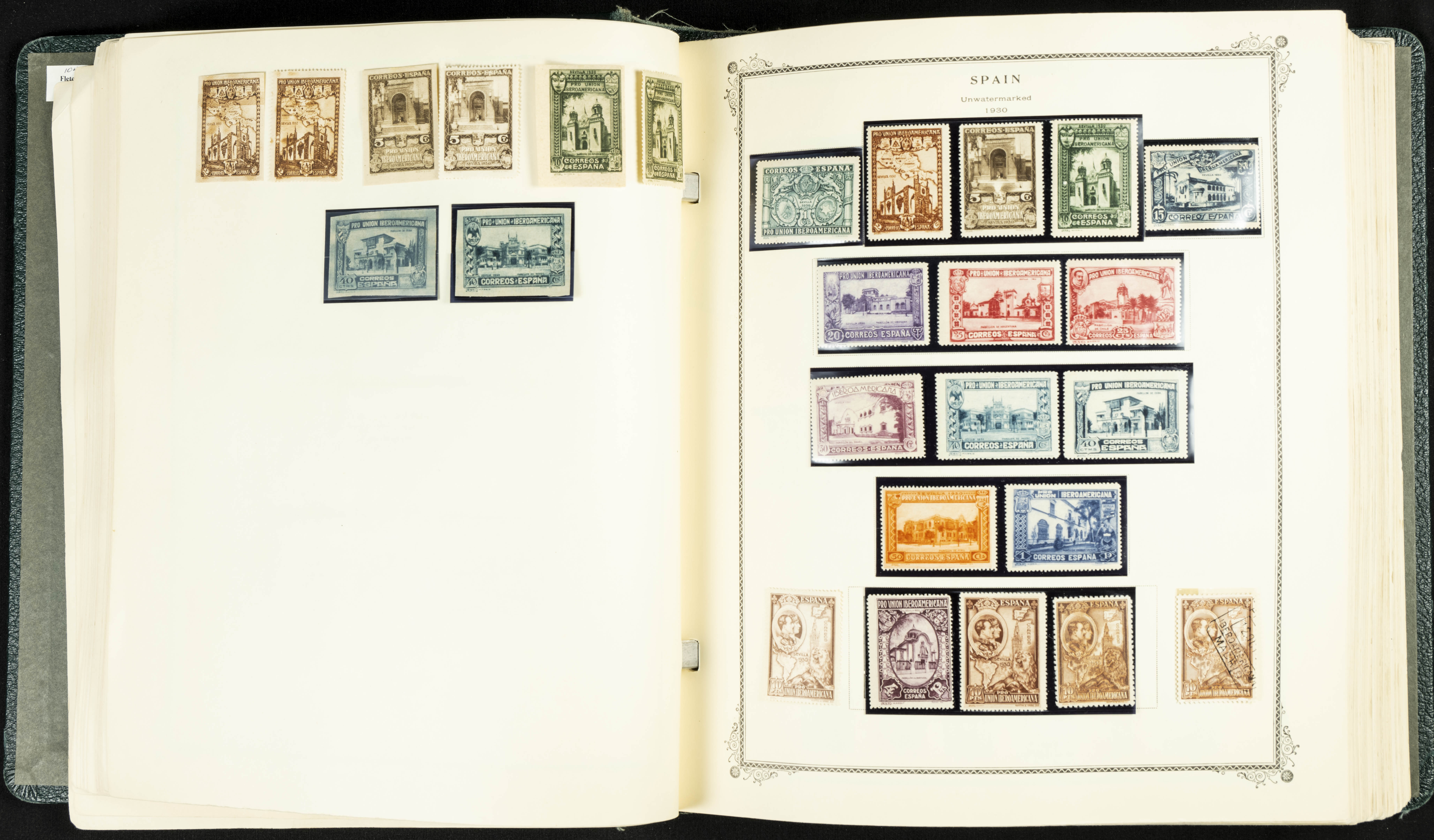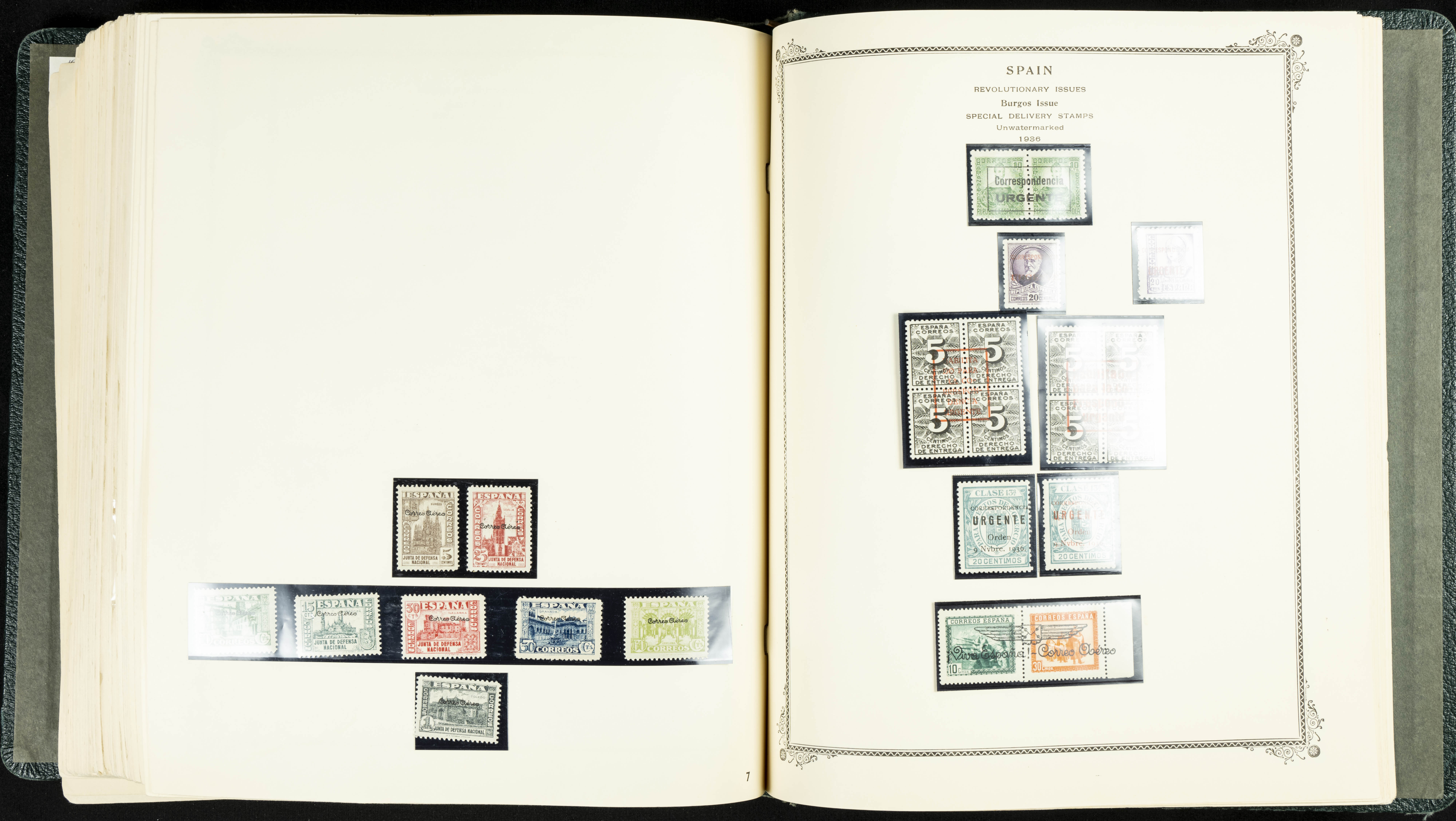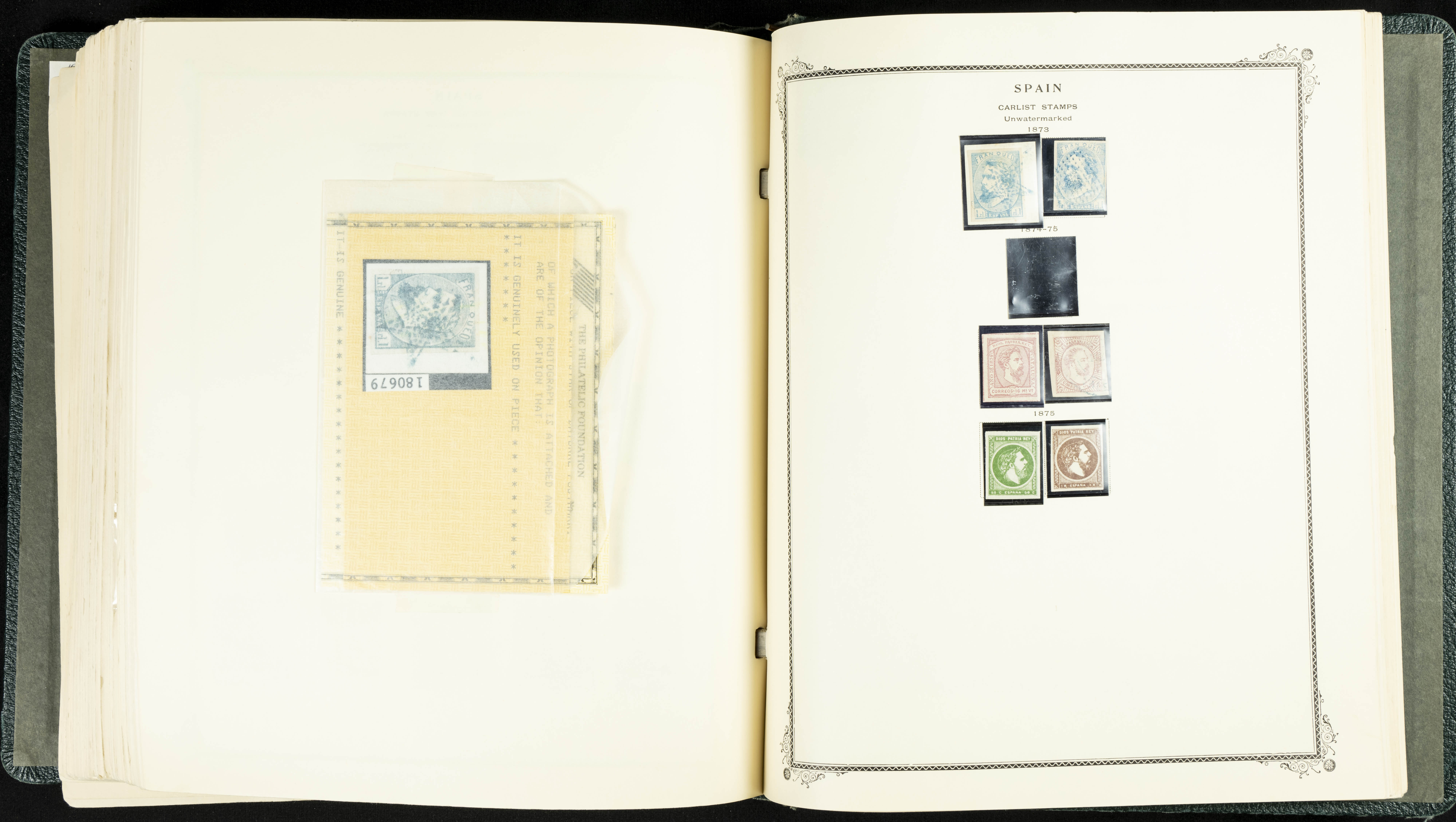 ★/(1850ca). A very interesting collection between 1850 and 1974, in mint and used coins. The classic part is very well represented, and most of the coins are used, including a complete series from 1850, 1851, 1852, and 1853, missing the 2 reales, 2 cuartos (green), and 1 real (blue) coins from 1854. Also included are most of the 19 cuartos, 4 pesetas from Amadeo and the First Republic, and most of the coins from 1876 to 1889. From 1901 onwards, everything is mint, including series such as Cadet, Quixote, Medallion, UPU, Red Cross (all of them), Railways, Montserrat (duplicate with A000000), Personalities, Militia, Granada, Franco (all of them), Pilar, "Falla and Zuloaga", Centenary, etc. It includes numerous varieties, imperforate, color changes, and some Patriotic Issues. EXTREMELY HIGH CATALOG VALUE. MUST BE EXAMINED.