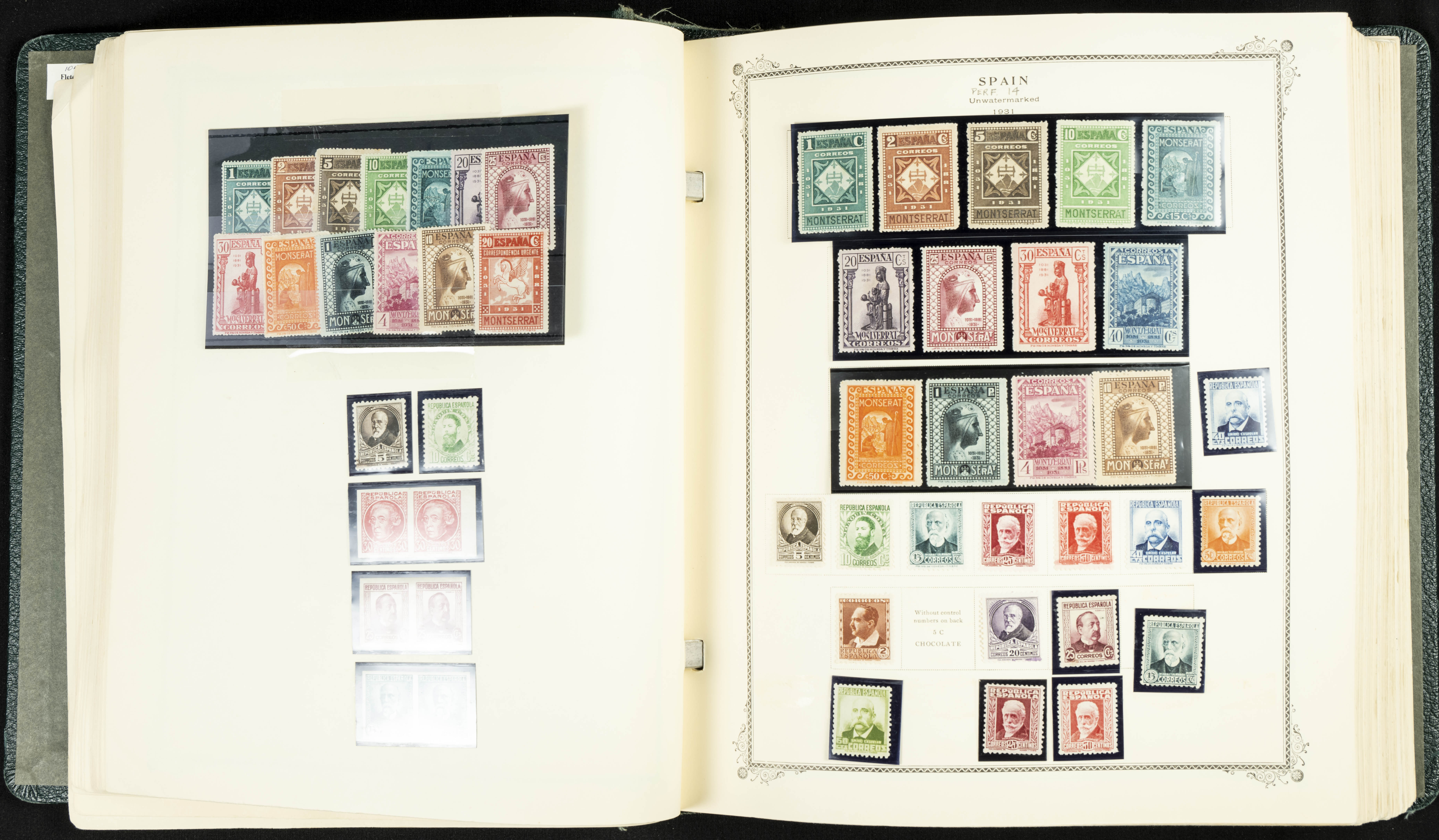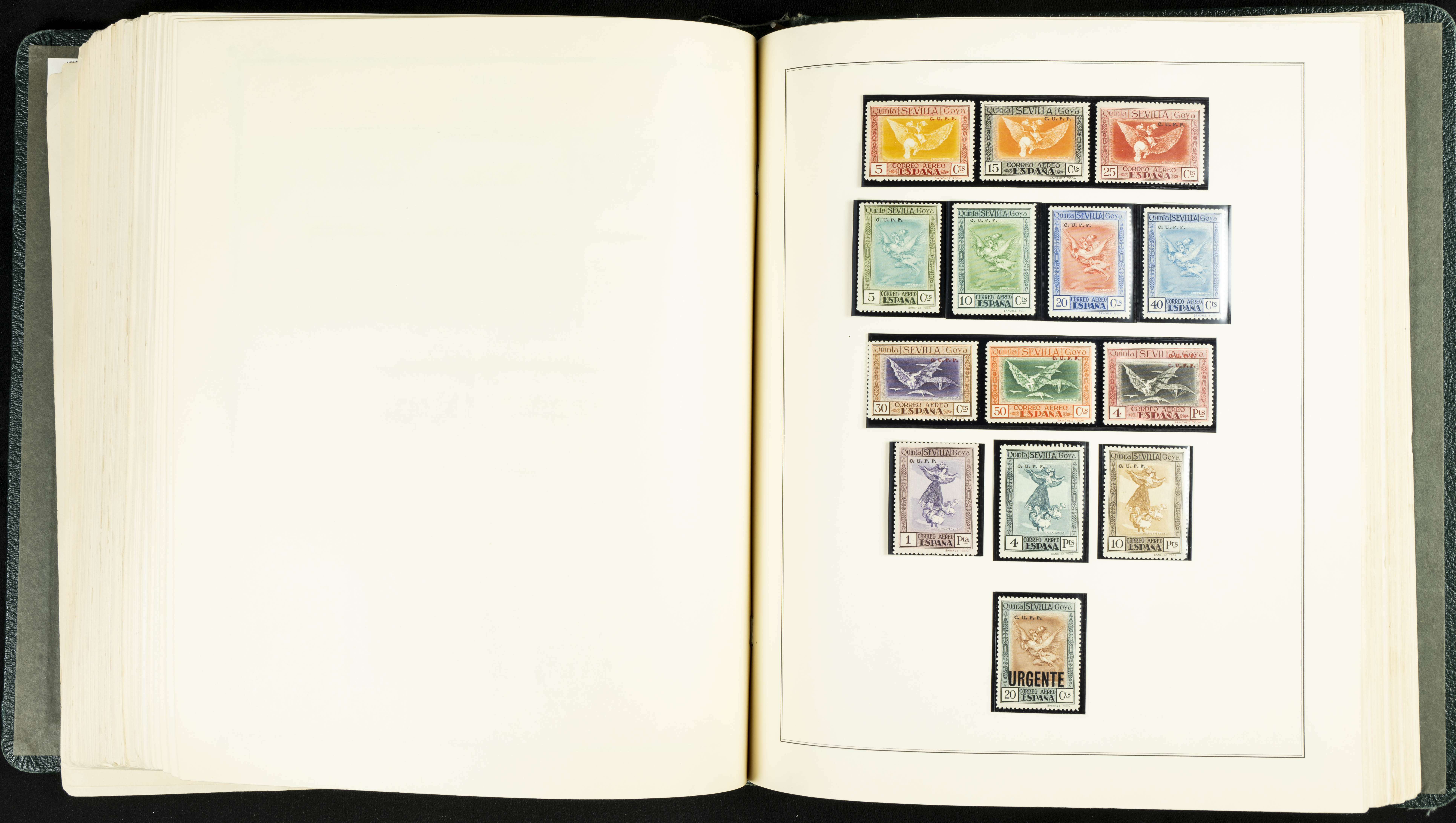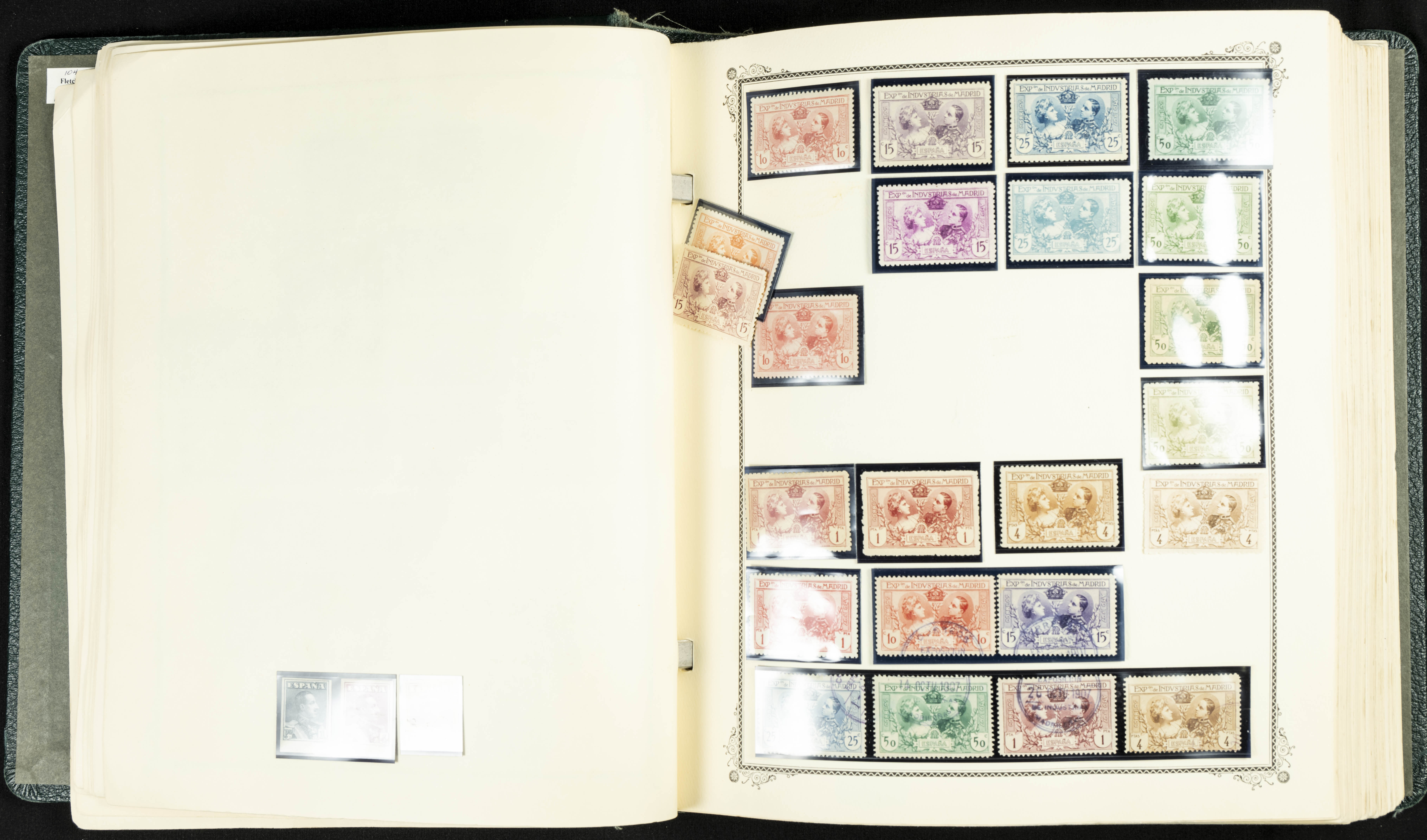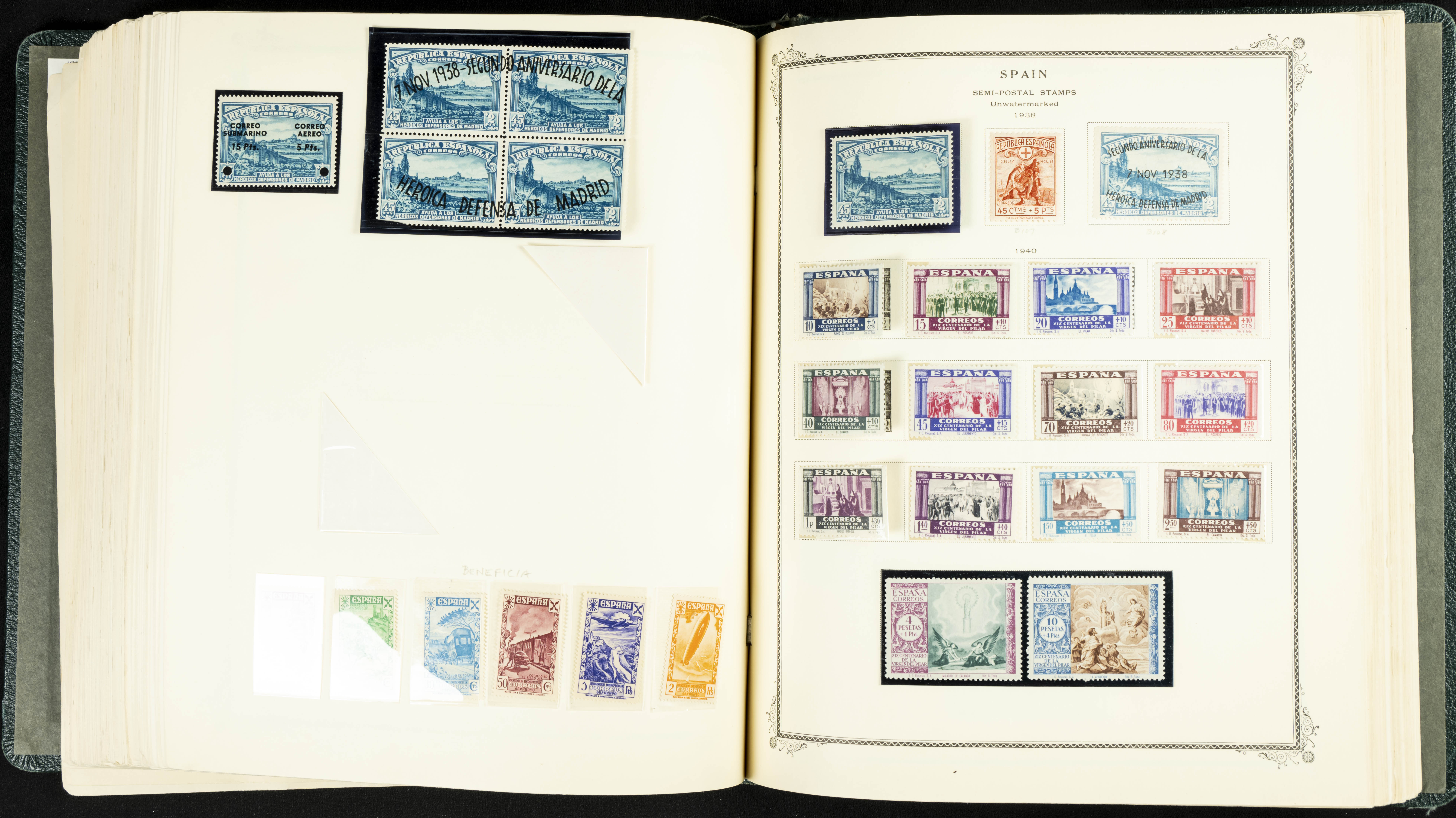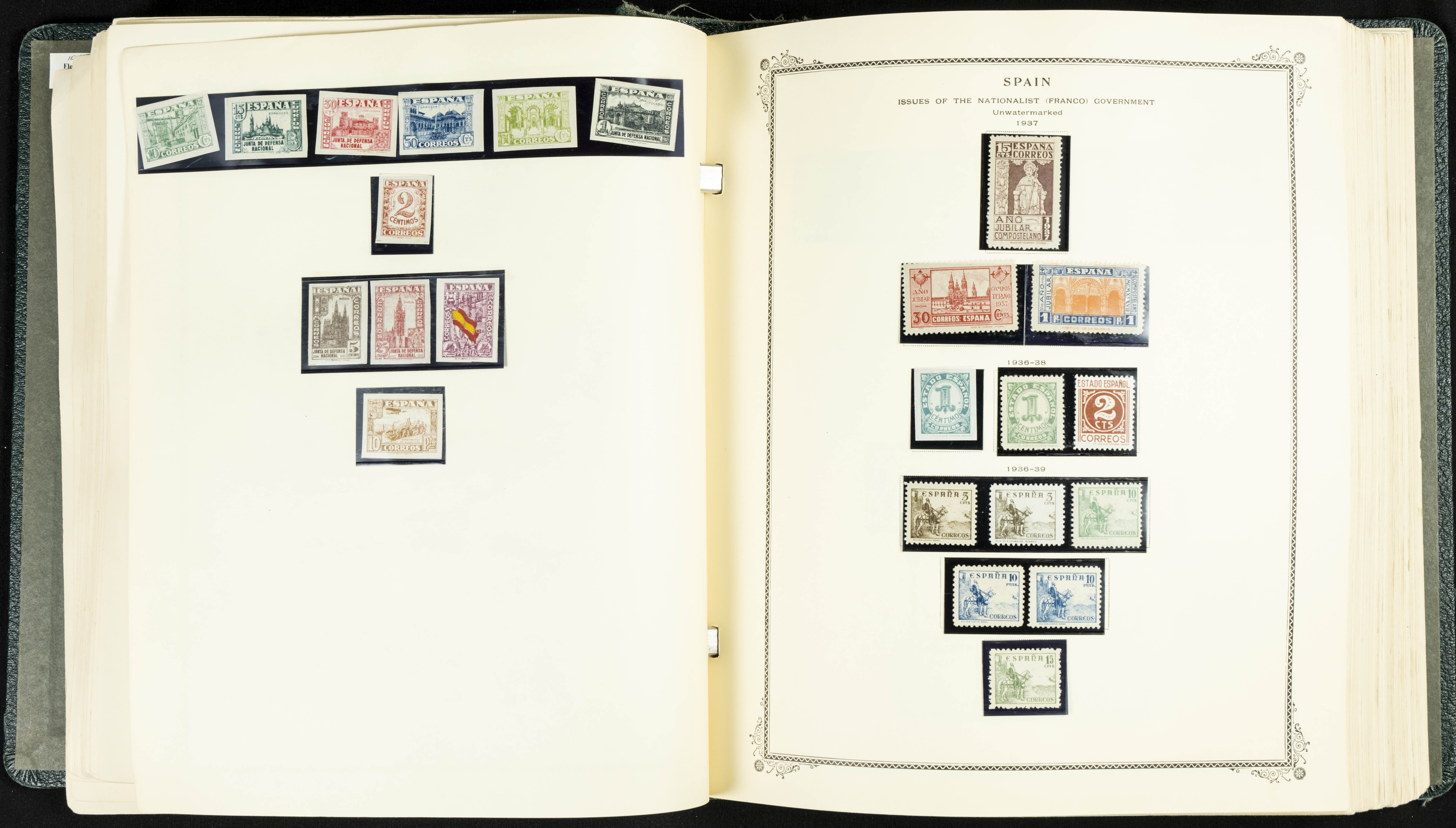 ★/(1850ca). A very interesting collection between 1850 and 1974, in mint and used coins. The classic part is very well represented, and most of the coins are used, including a complete series from 1850, 1851, 1852, and 1853, missing the 2 reales, 2 cuartos (green), and 1 real (blue) coins from 1854. Also included are most of the 19 cuartos, 4 pesetas from Amadeo and the First Republic, and most of the coins from 1876 to 1889. From 1901 onwards, everything is mint, including series such as Cadet, Quixote, Medallion, UPU, Red Cross (all of them), Railways, Montserrat (duplicate with A000000), Personalities, Militia, Granada, Franco (all of them), Pilar, "Falla and Zuloaga", Centenary, etc. It includes numerous varieties, imperforate, color changes, and some Patriotic Issues. EXTREMELY HIGH CATALOG VALUE. MUST BE EXAMINED.