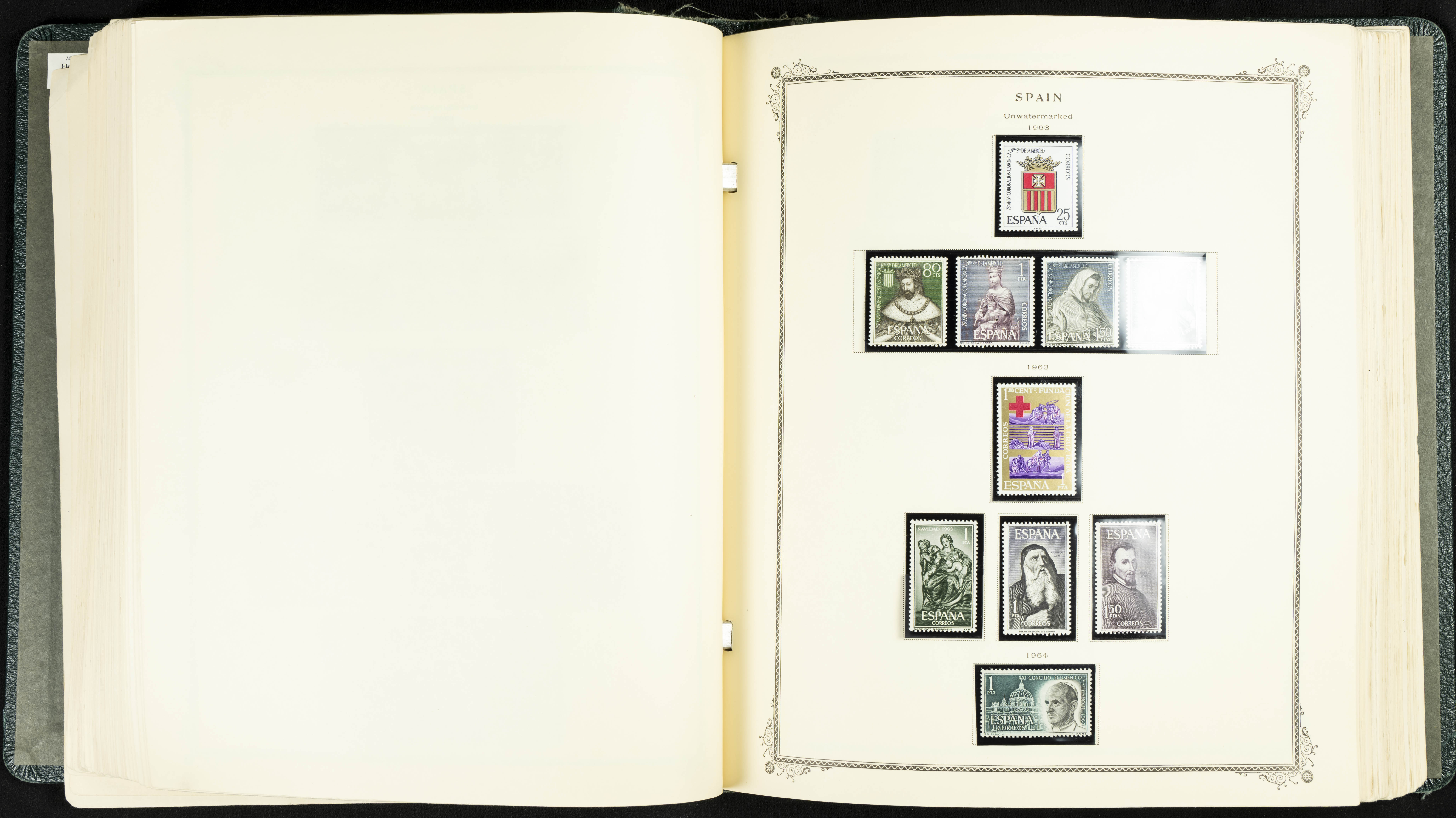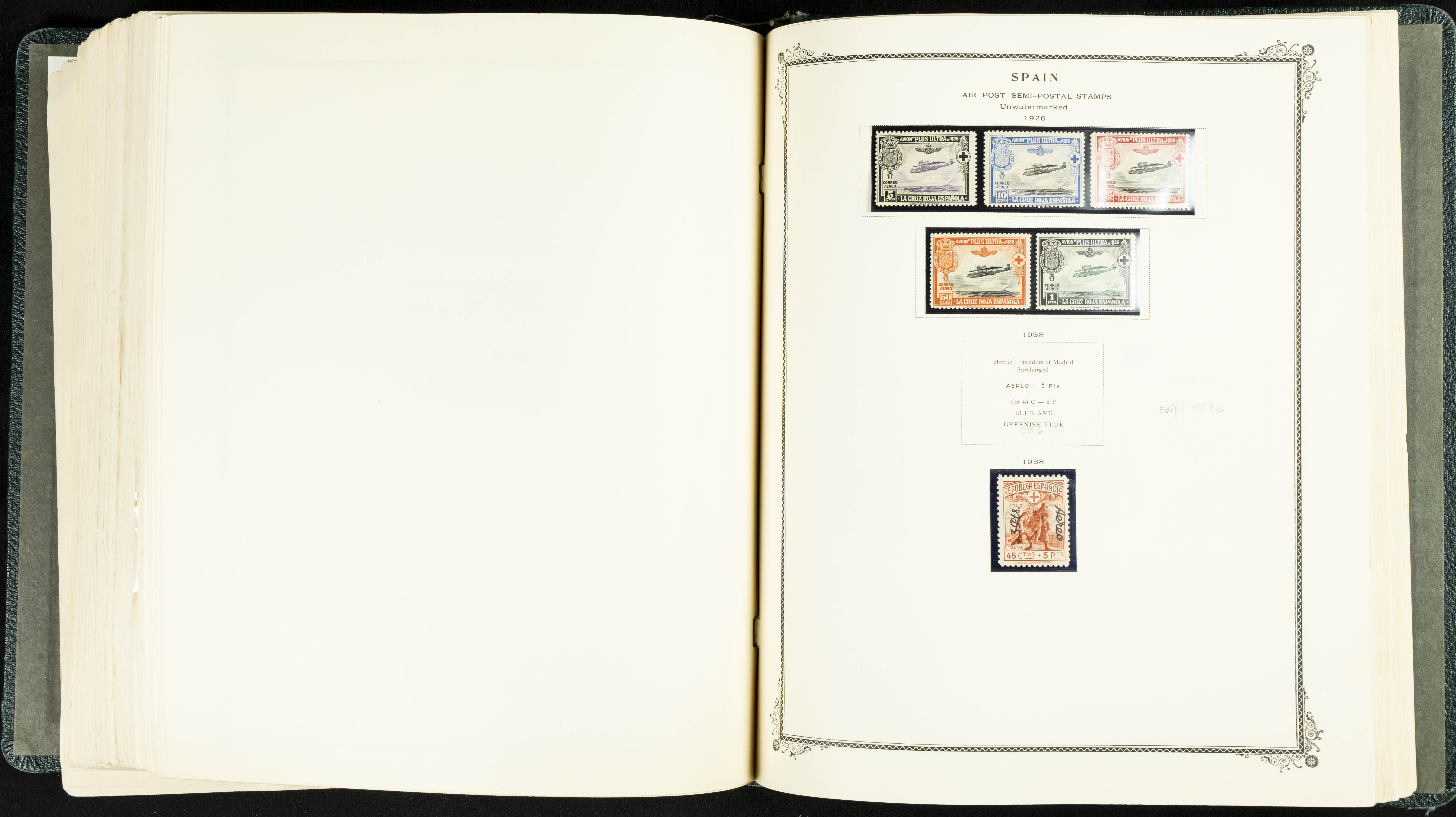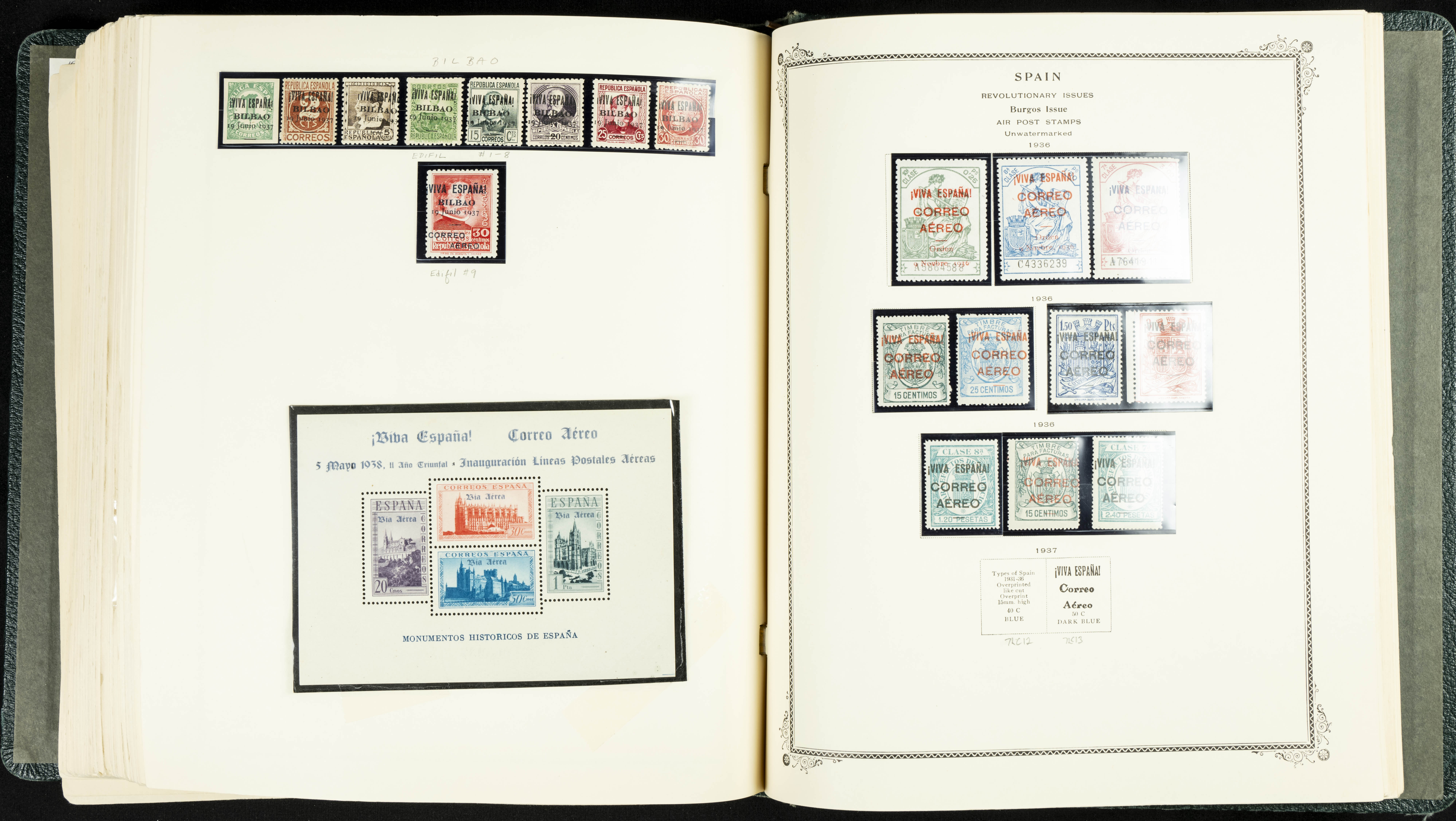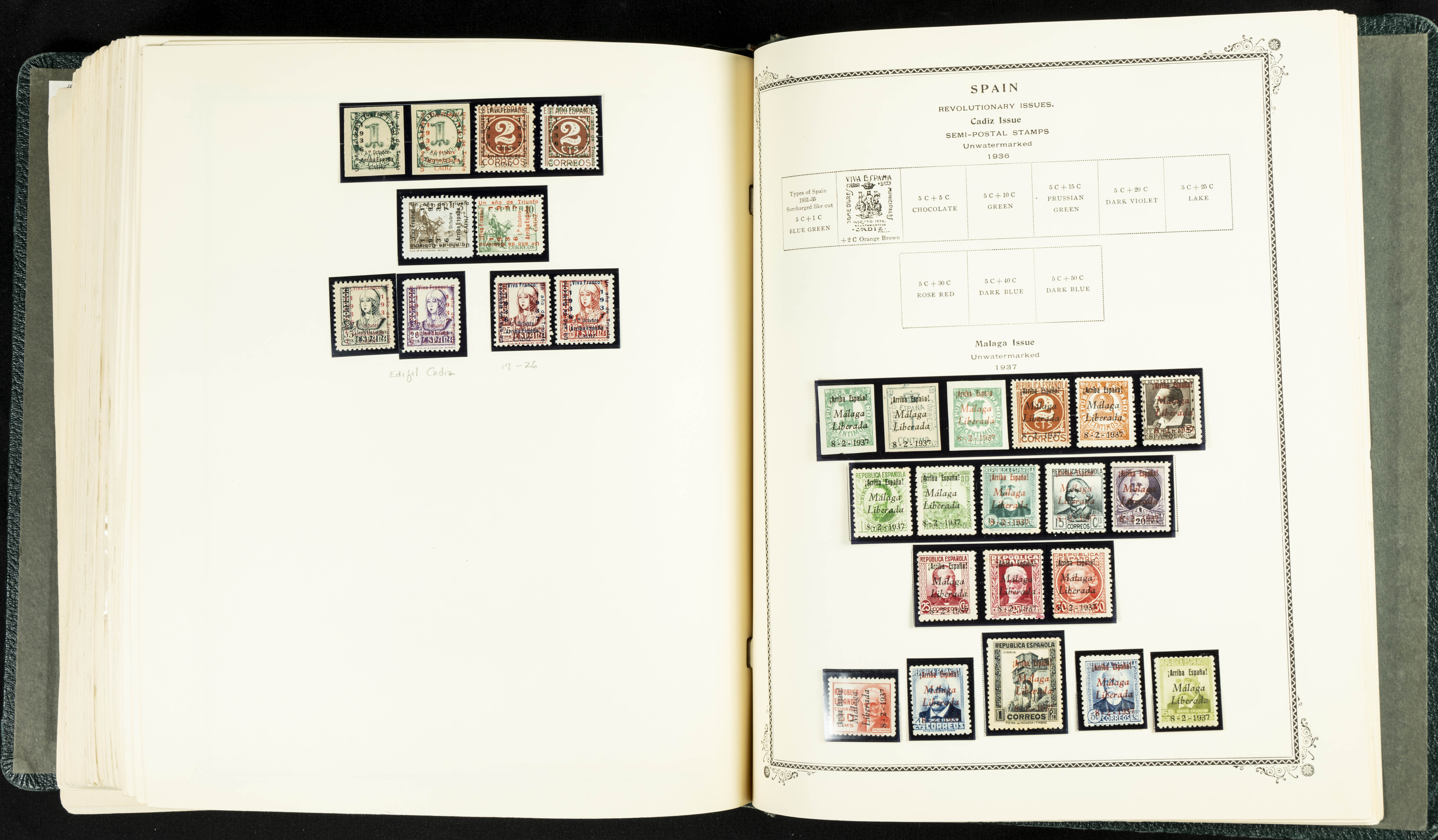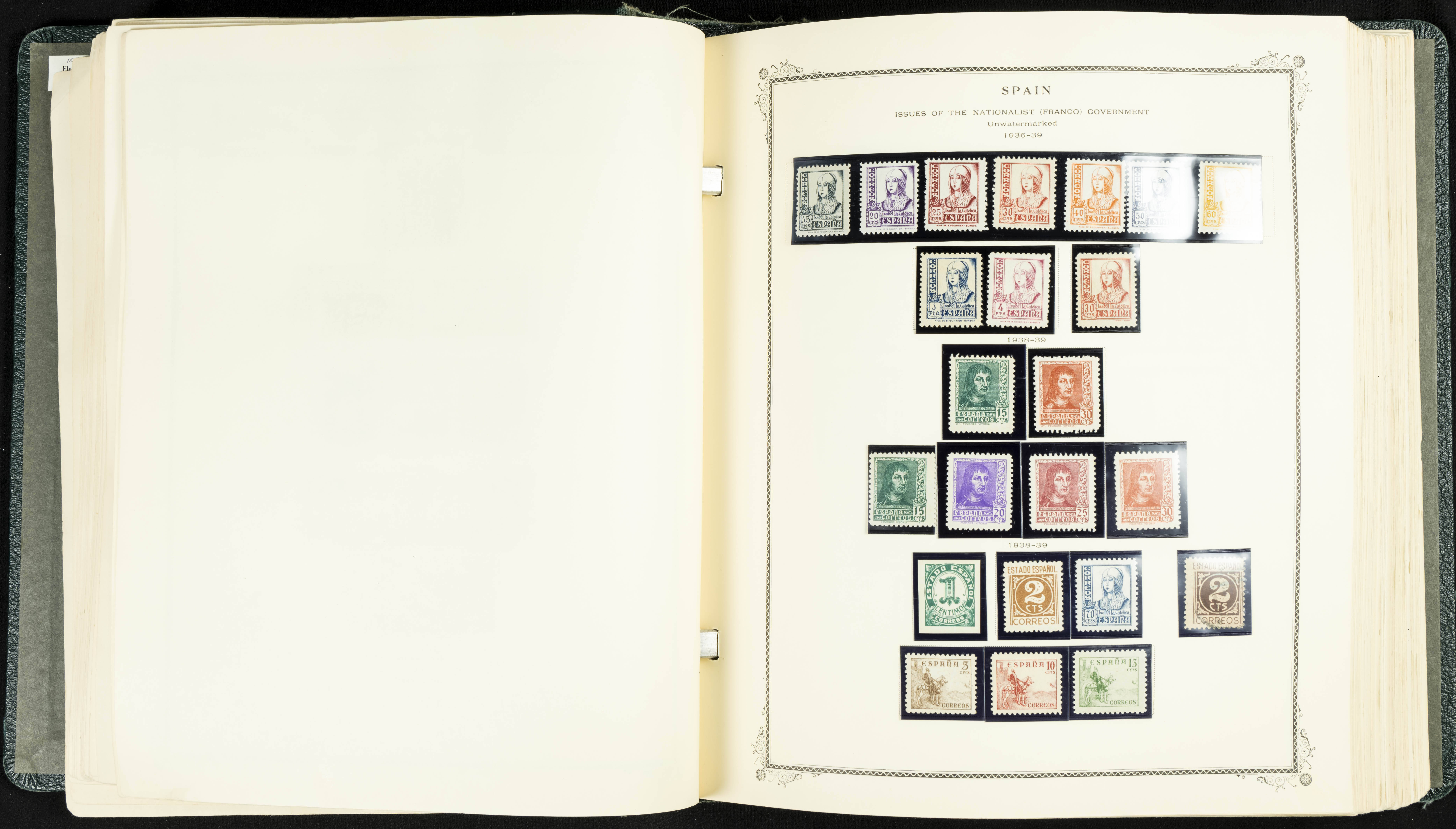★/(1850ca). A very interesting collection between 1850 and 1974, in mint and used coins. The classic part is very well represented, and most of the coins are used, including a complete series from 1850, 1851, 1852, and 1853, missing the 2 reales, 2 cuartos (green), and 1 real (blue) coins from 1854. Also included are most of the 19 cuartos, 4 pesetas from Amadeo and the First Republic, and most of the coins from 1876 to 1889. From 1901 onwards, everything is mint, including series such as Cadet, Quixote, Medallion, UPU, Red Cross (all of them), Railways, Montserrat (duplicate with A000000), Personalities, Militia, Granada, Franco (all of them), Pilar, "Falla and Zuloaga", Centenary, etc. It includes numerous varieties, imperforate, color changes, and some Patriotic Issues. EXTREMELY HIGH CATALOG VALUE. MUST BE EXAMINED.