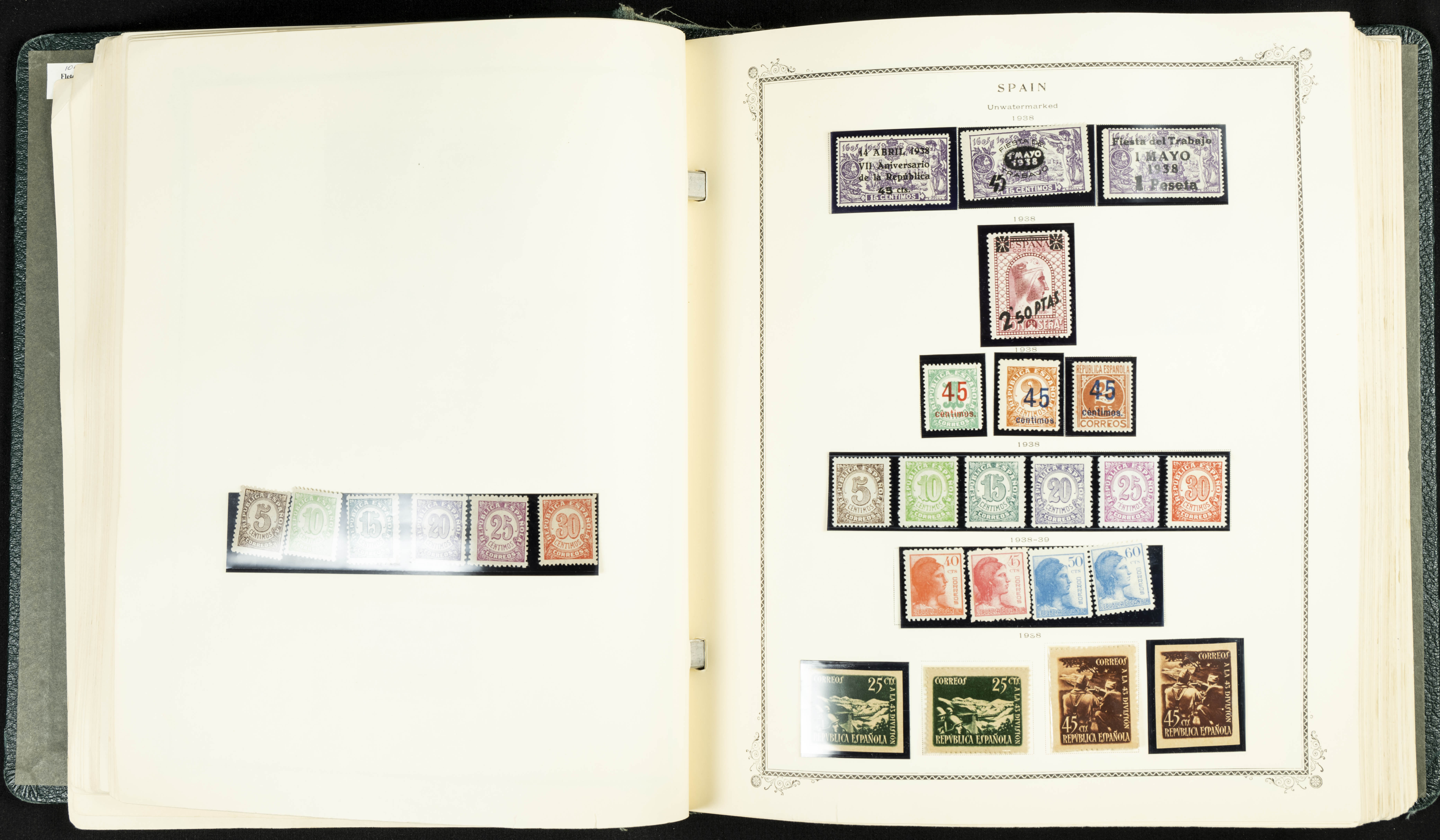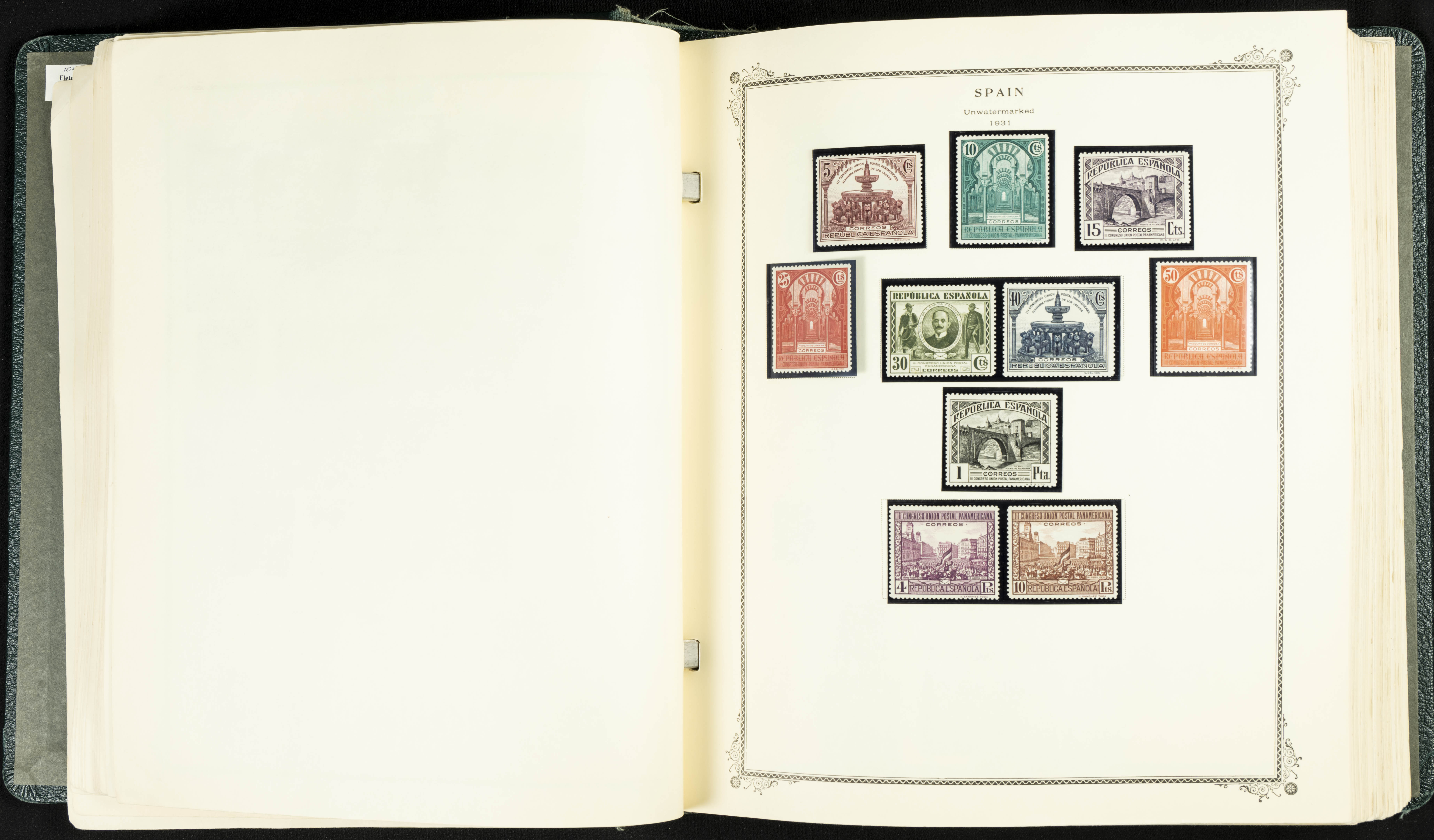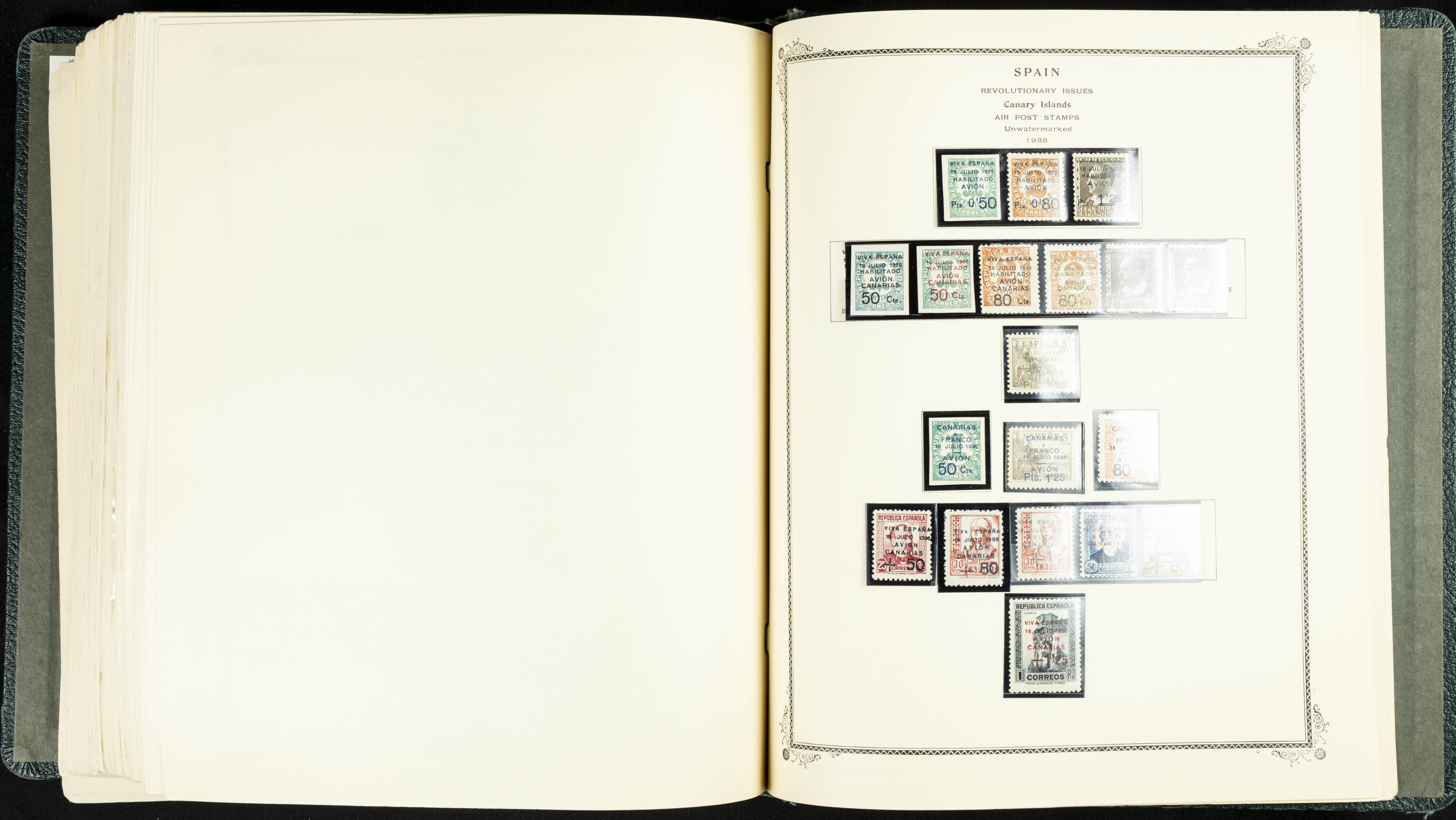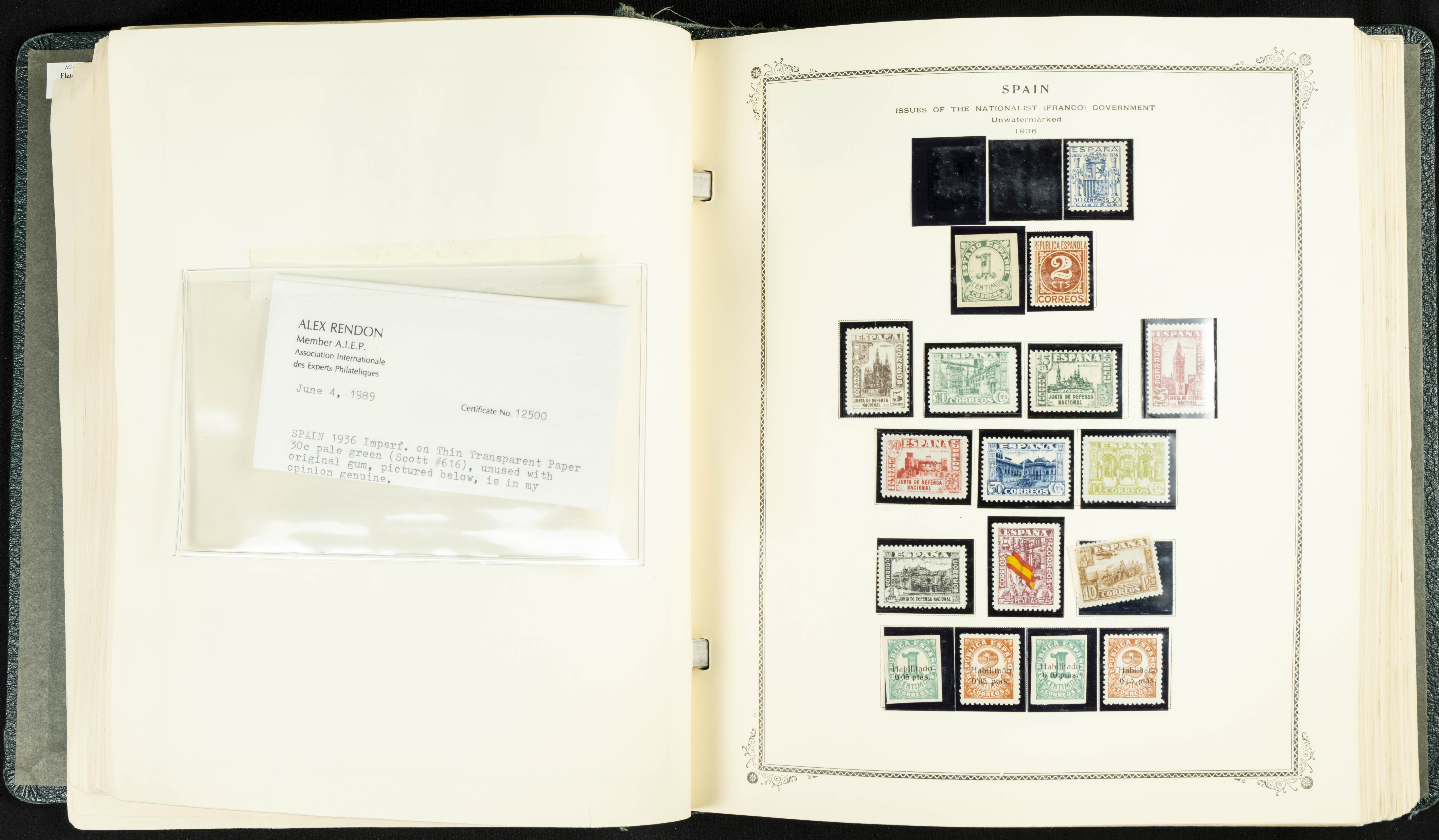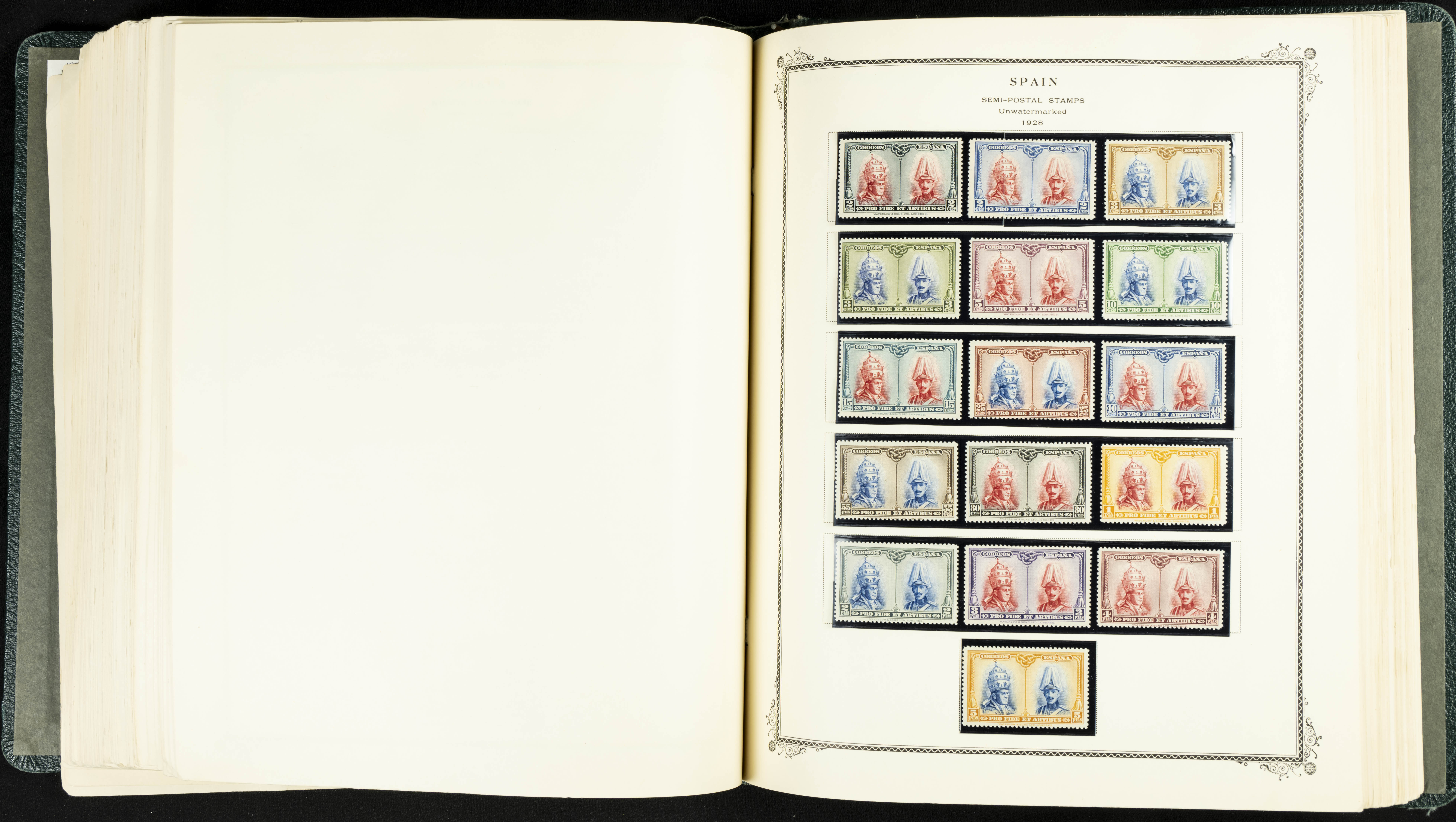 ★/(1850ca). A very interesting collection between 1850 and 1974, in mint and used coins. The classic part is very well represented, and most of the coins are used, including a complete series from 1850, 1851, 1852, and 1853, missing the 2 reales, 2 cuartos (green), and 1 real (blue) coins from 1854. Also included are most of the 19 cuartos, 4 pesetas from Amadeo and the First Republic, and most of the coins from 1876 to 1889. From 1901 onwards, everything is mint, including series such as Cadet, Quixote, Medallion, UPU, Red Cross (all of them), Railways, Montserrat (duplicate with A000000), Personalities, Militia, Granada, Franco (all of them), Pilar, "Falla and Zuloaga", Centenary, etc. It includes numerous varieties, imperforate, color changes, and some Patriotic Issues. EXTREMELY HIGH CATALOG VALUE. MUST BE EXAMINED.