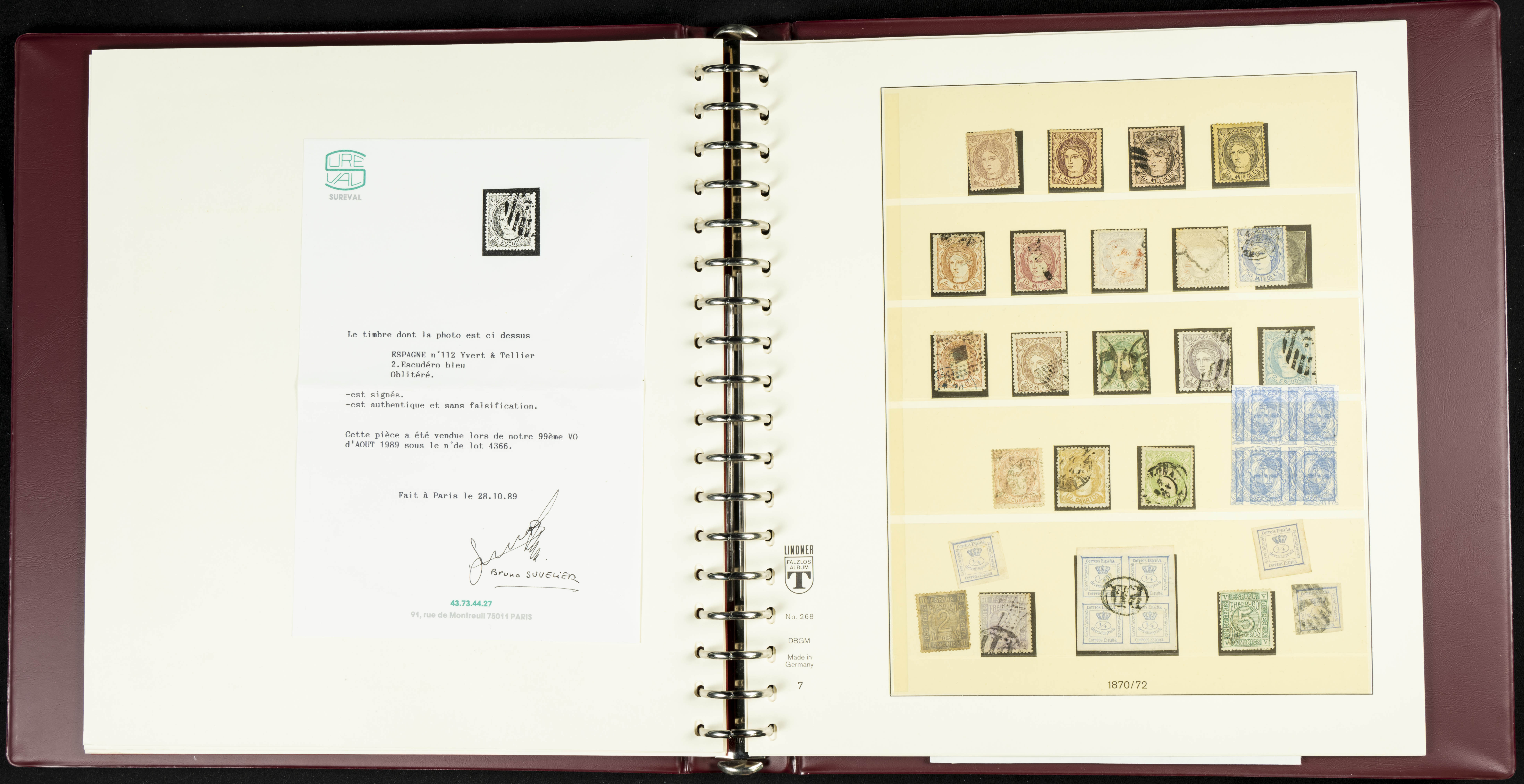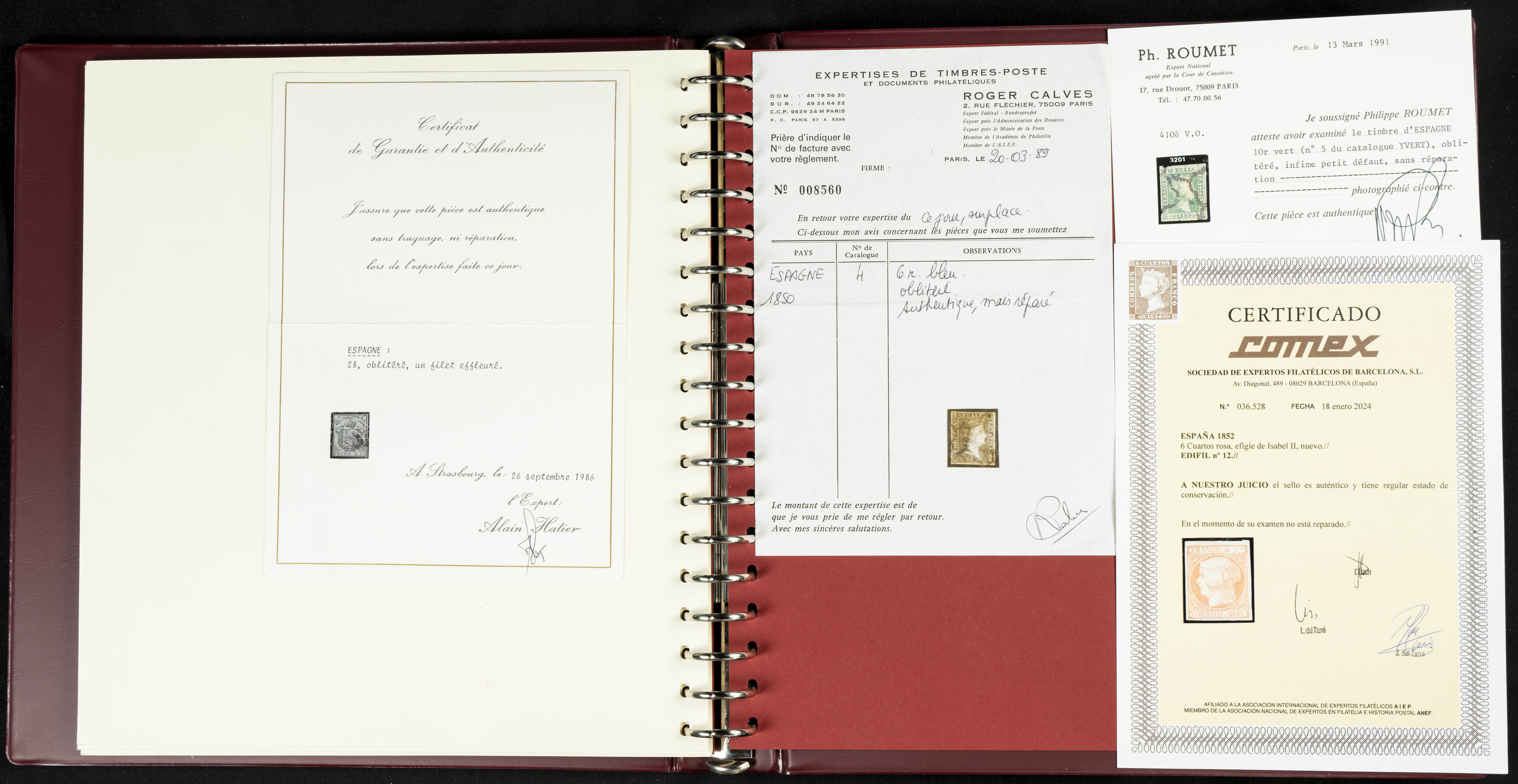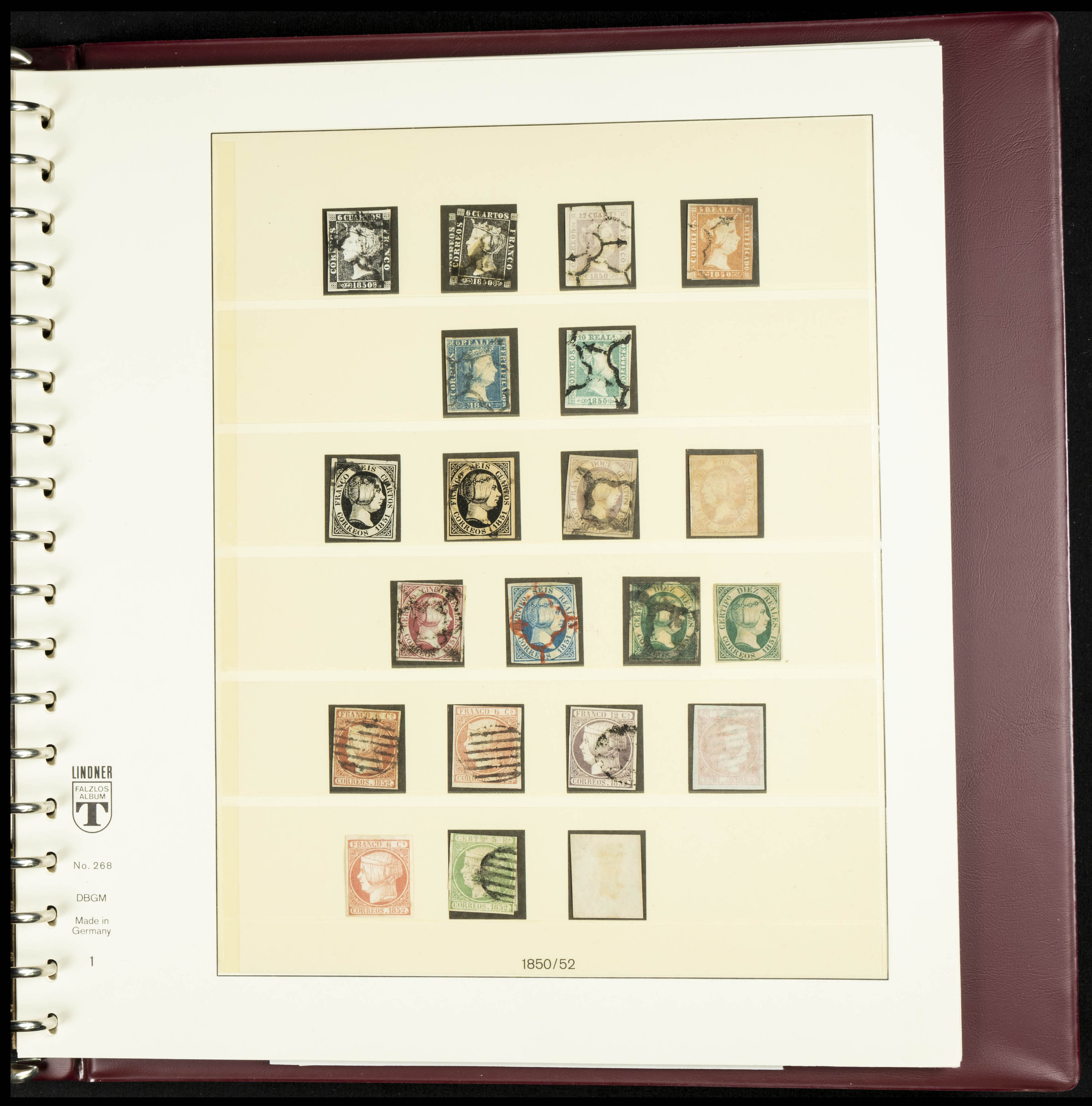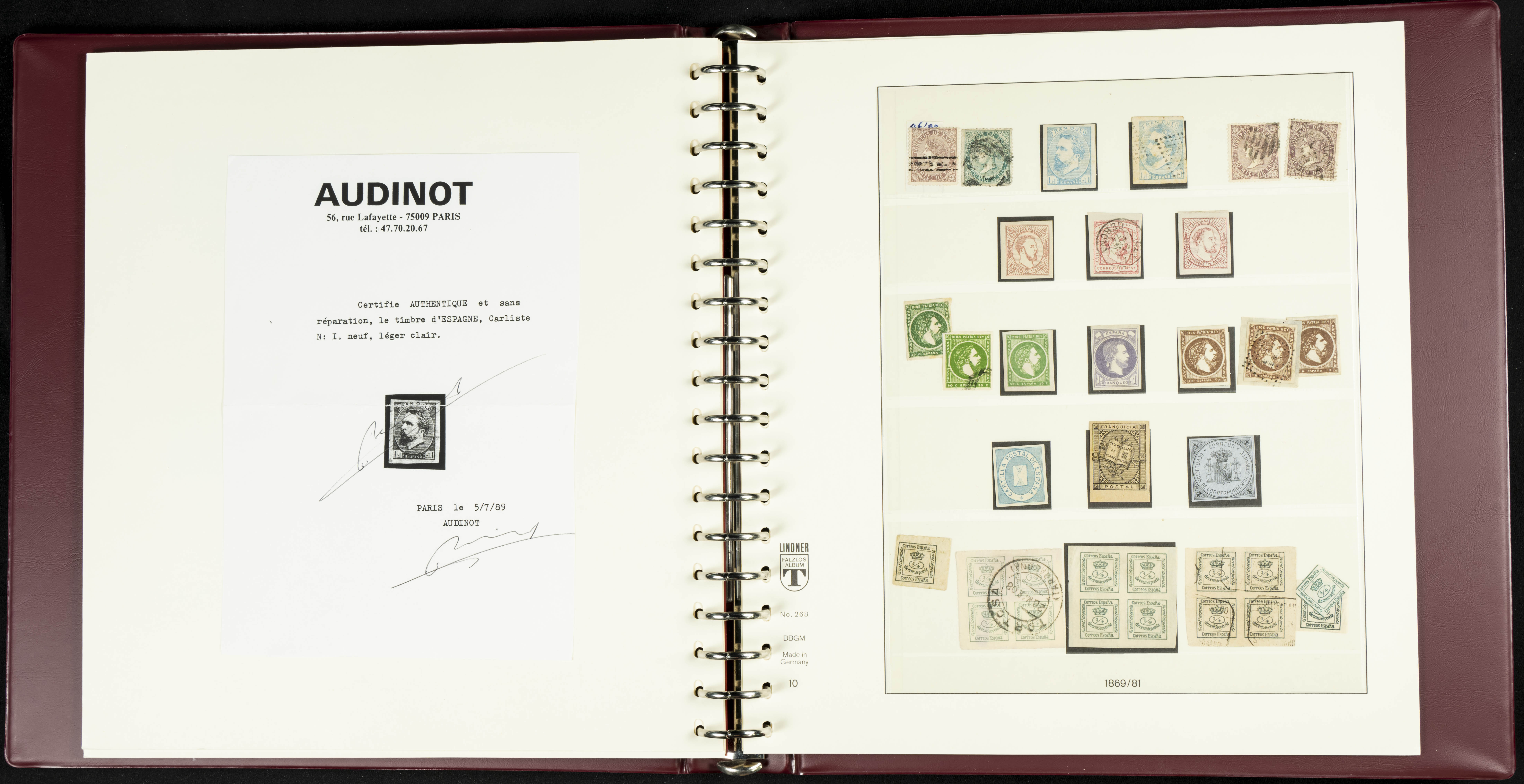 (★)/(1850ca). A very interesting collection of classic stamps from between 1850 and 1882, mostly mint and used, including the 6 reales and 10 reales of 1850, the 10 reales of 1851 (mint), the 2 cuartos and 1 real of 1854, the 19 cuartos of 1860, 1862 (mint), 1864 (mint), 1865 (perforated and imperforate), 1866, 1867, and 1868, the 2 escudos and 1600 mils of Matrona, and most of the key values of subsequent issues. It also includes some forgeries, several duplicates (some with special postmarks), and some varieties. Extremely high catalog value. Examine the collection closely.