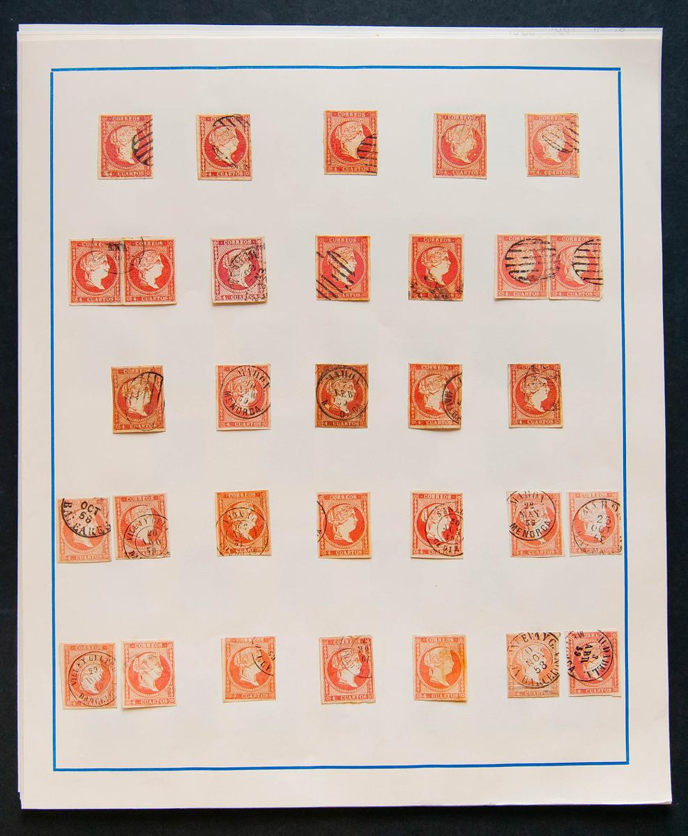 (1855ca). Set of hundreds of 4- cuartos stamps from issues of 1855, 1860, 1862, 1864, 1866 and 1867 with various postmarks, mostly wagon wheels and dates, includes 50 thousandths and 10 ct stamps from later issues. TO EXAMINE.