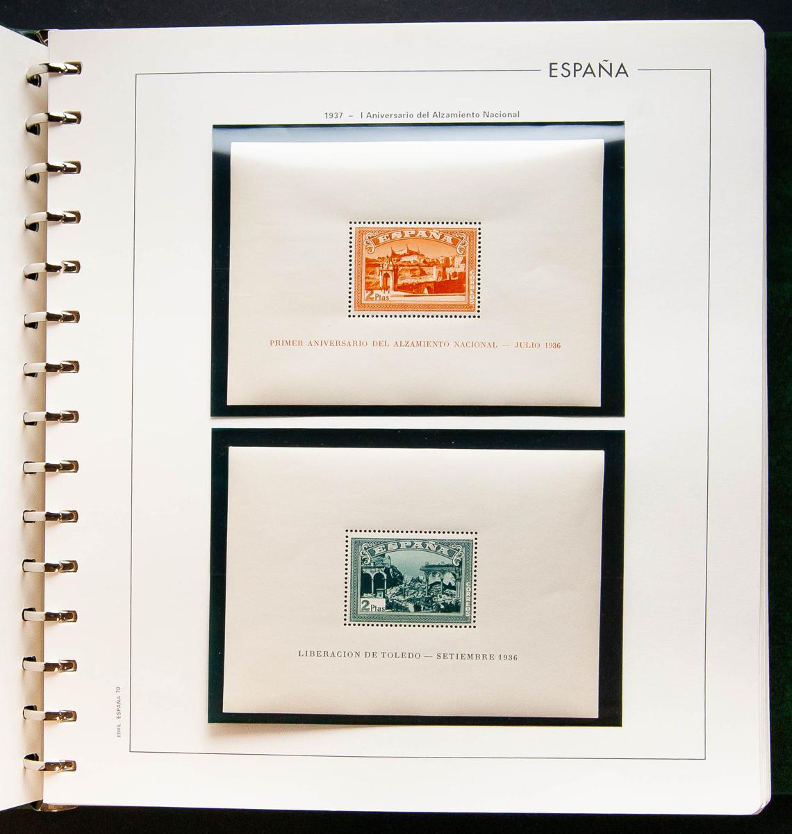 ★★(1937ca). Very complete collection between 1937 and 1975, again without affixes (mounted in albums), the complete series or important stamps are missing, but it includes block sheets of Toledo, "Army and Navy" and Lepanto (notched), Monuments (not notched), as well as all the average value series such as Autogiro, Año Santo, Milenario de Castilla, Personages, Franco (1949), Caudillo a Canarias Terrestre and "Legazpi y Sorolla" (used), complete from 1954 and with very good quality in general. TO EXAMINE. Building 2022: Edifil Euros