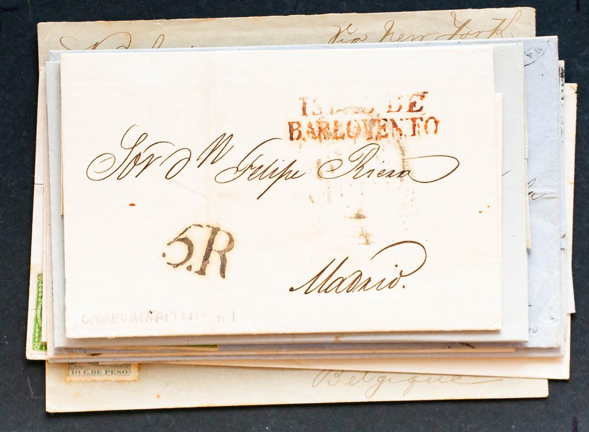 (1827ca). Interesting set of eight letters from Cuba circulated between 1827 and 1896, one marked ISLAS DE / BARLOVENTO, four franked with 1 real green, one with ½ real blue, one with French mark COLONIES / ART 13 and one with 10 Pelón cents. TO EXAMINE