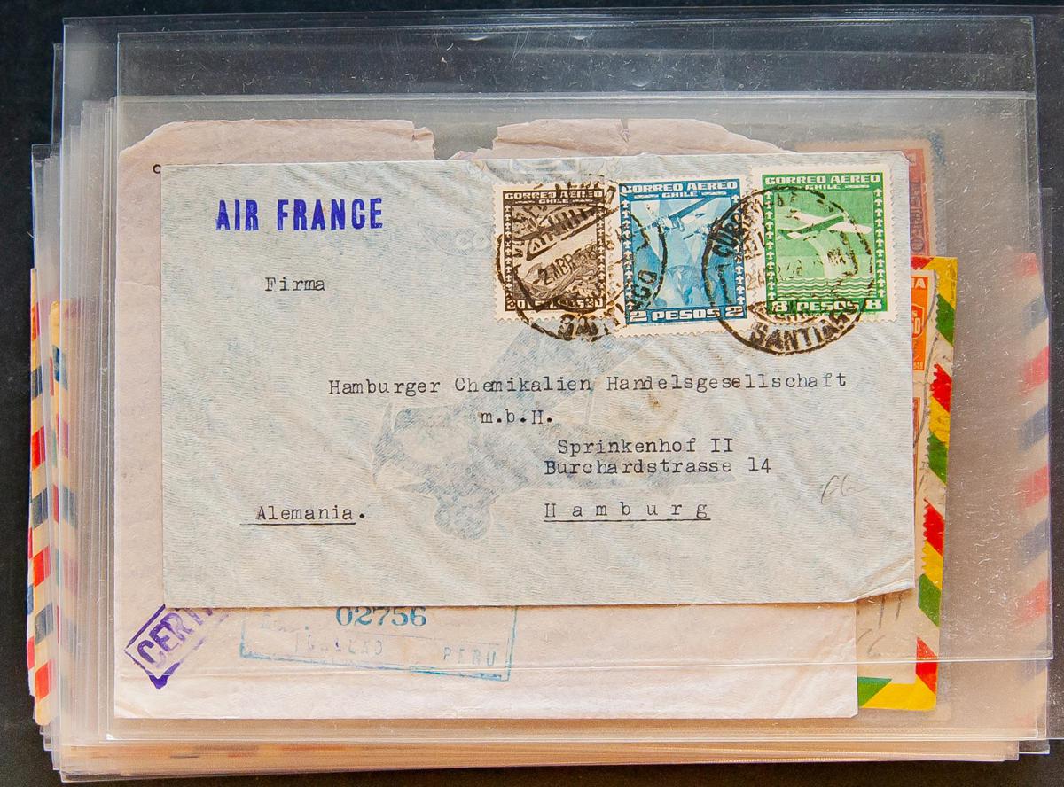 English (1930ca). Interesting set of more than one hundred and twenty letters circulated from Bolivia, Chile and Peru between 1930 and 1965, with some interesting pieces of air mail, most via Panagra and Air France, including some Postal Stationery Cards from the beginning of the 20th century. TO EXAMINE.