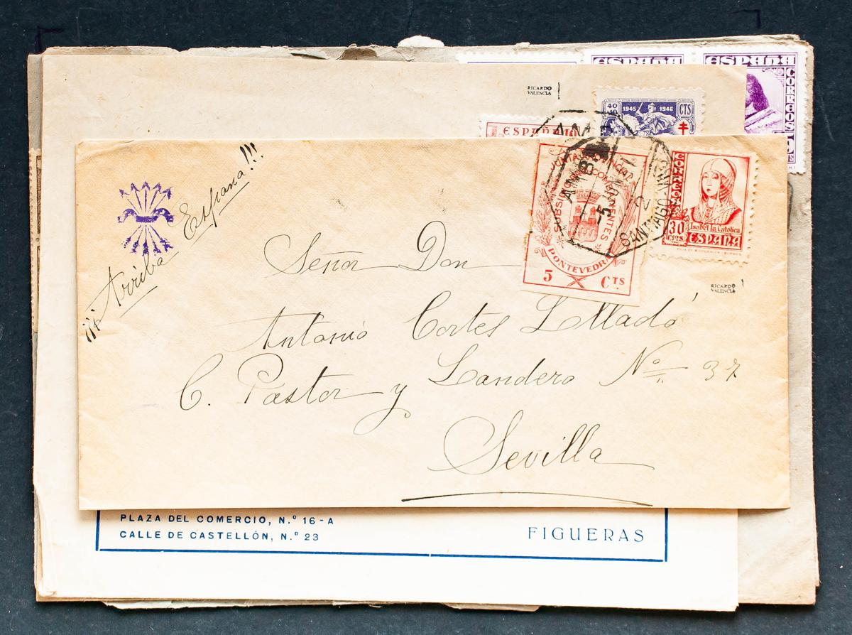 (1937ca). Set of four letters circulated between 1937 and 1950, with different postage and traveling postmarks, one with Benéfico de la Junta Provincial de Pontevedra. TO EXAMINE.