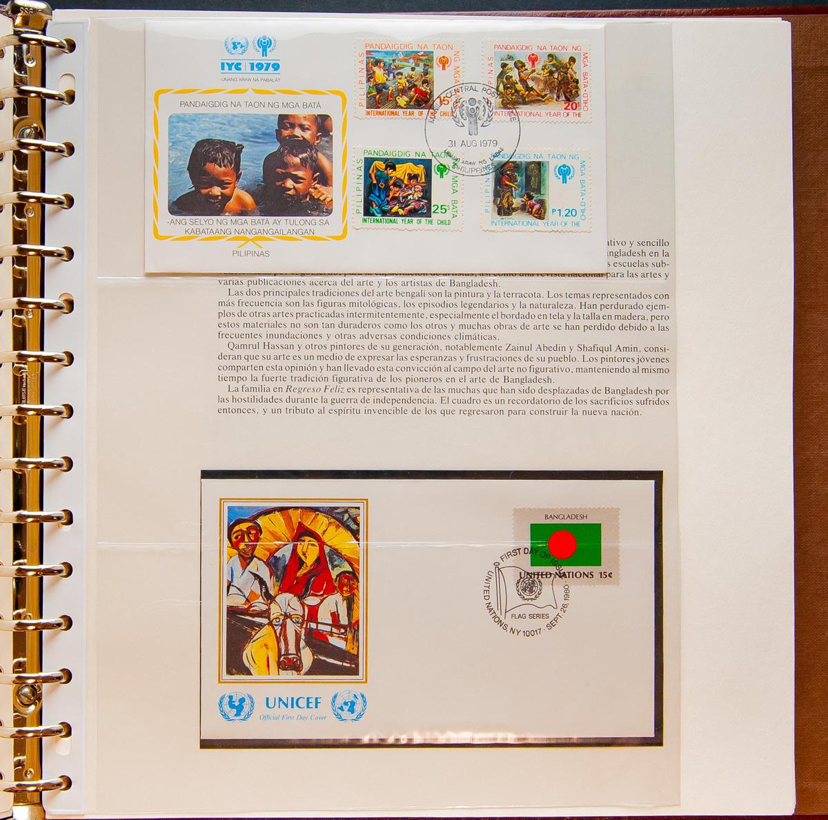 (1980ca). UNICEF themed collection complete with First Day boosters from the United Nations Flags series with descriptions of each booster. TO EXAMINE.