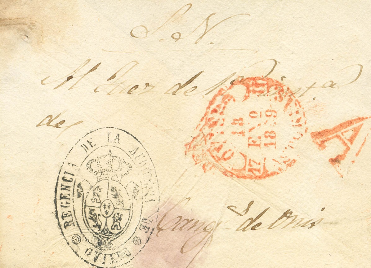 1. 1850. 6 cuartos black (I-10). Postmark "A", red fertilizer stamp from Oviedo. MAGNIFICENT AND EXTRAORDINARILY RARE. Cert. GRAUS. (Pre-philatelic letter included for mark comparison).