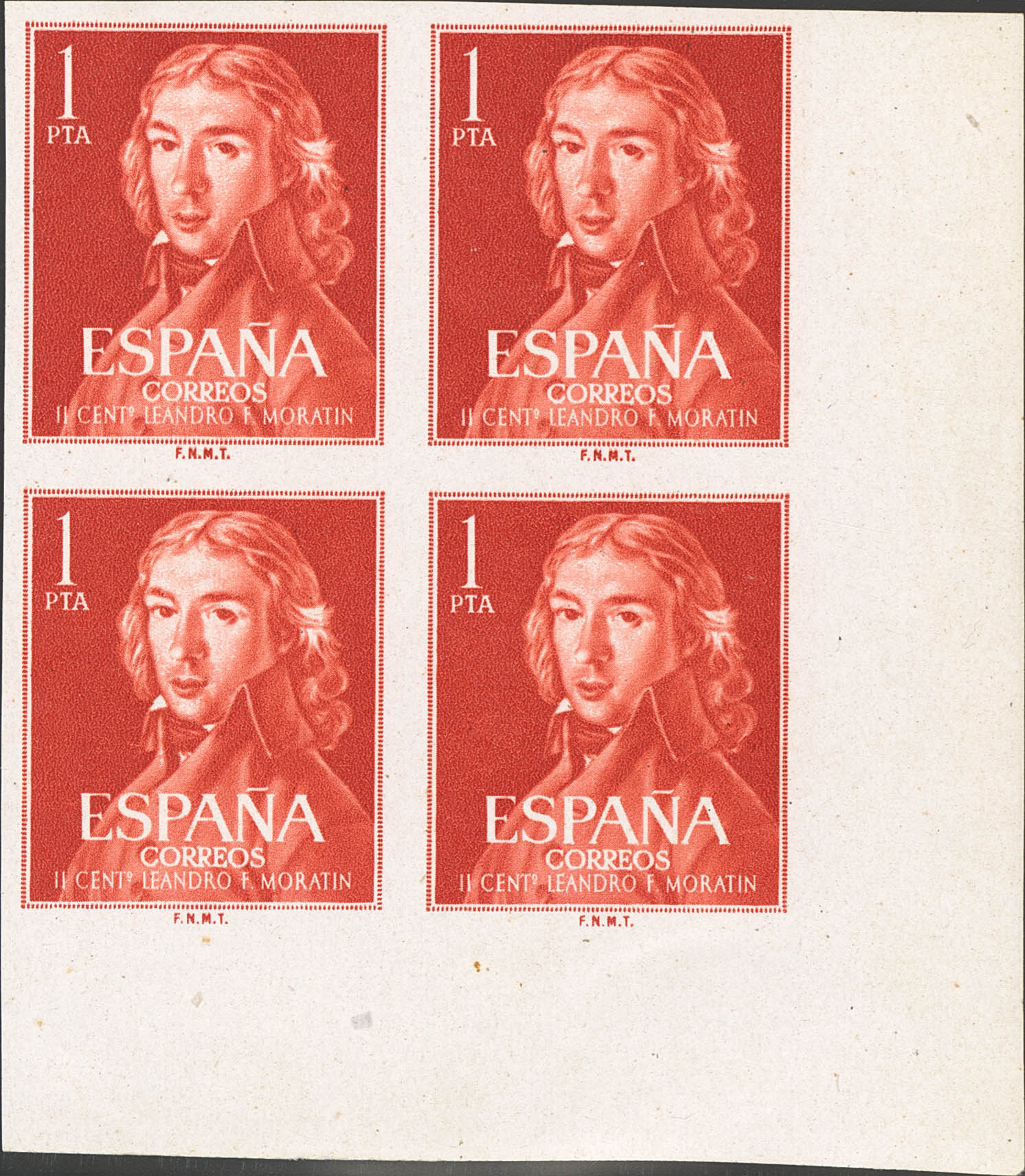 ★★ 1328s(4). 1961. 1 pt. red-orange, block of four, sheet corner. INFERTAPED. MAGNIFICENT AND RARE, A PIECE OF ENORMOUS SPECTACULARITY. Edifil 2026: 1,200 Euros