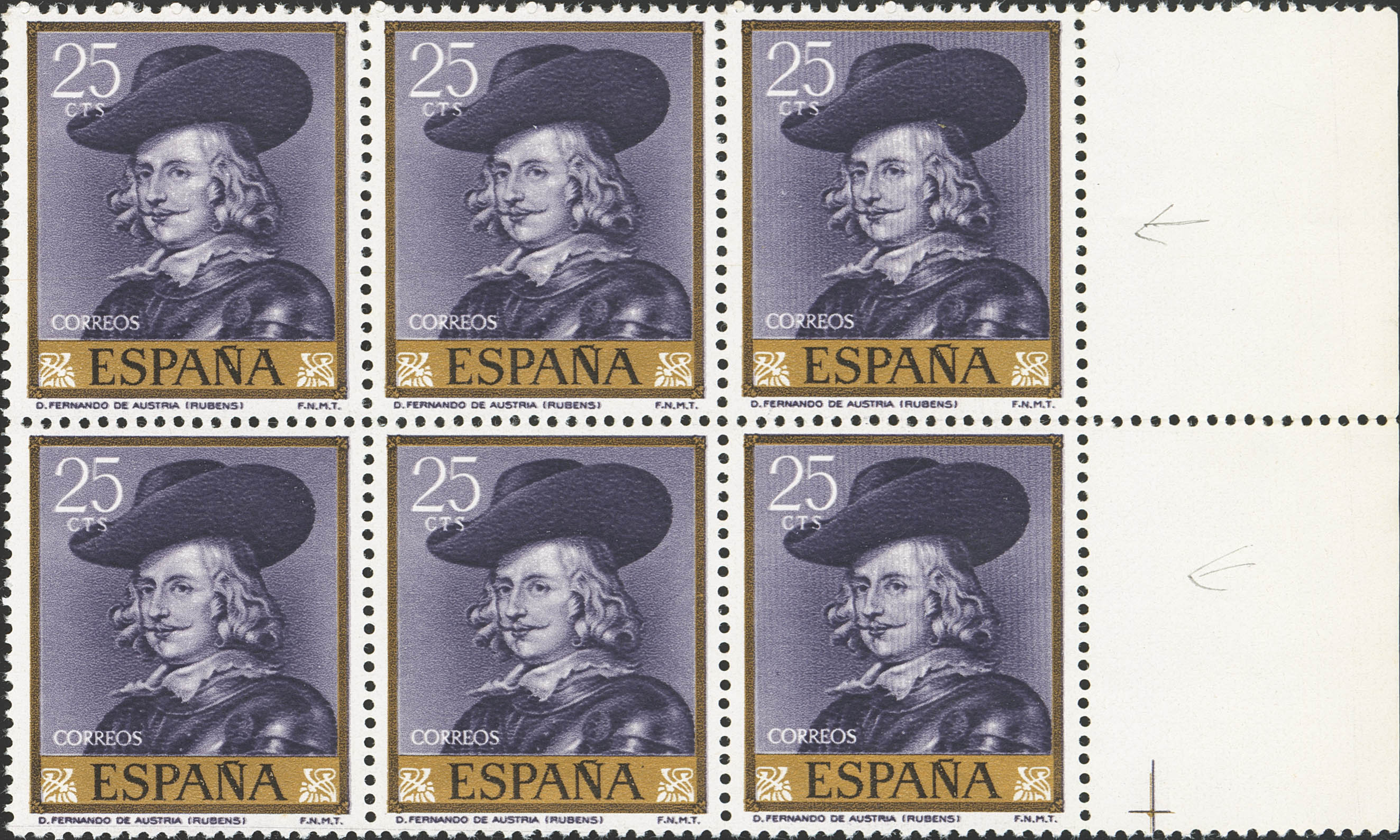 ★★ 1434(4), 1434ip(2). 1962. 25 cts violet black, block of six. Two stamps with vertically striped background. Magnificent.