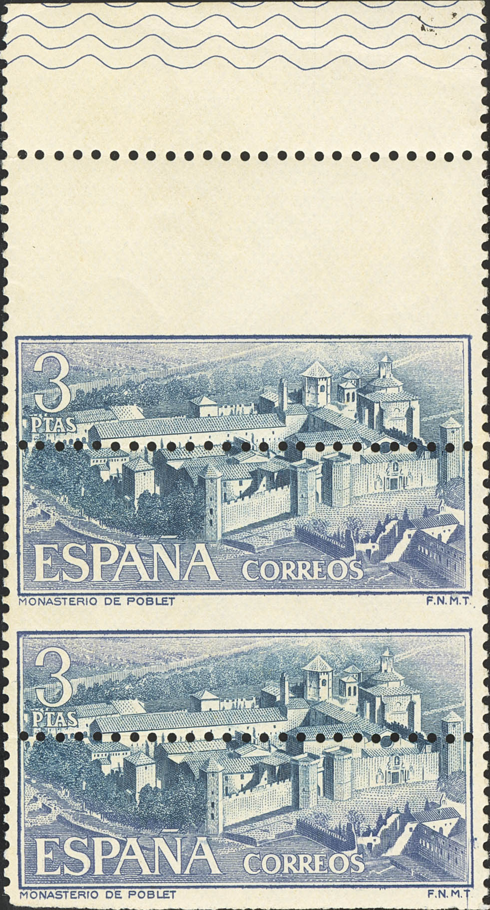★★ 1496dv(2). 1963. 3 pts blue, pair, leaf edge. OFFSET HORIZONTAL PERFORATION. MAGNIFICENT. Edifil 2021: +82 Euros