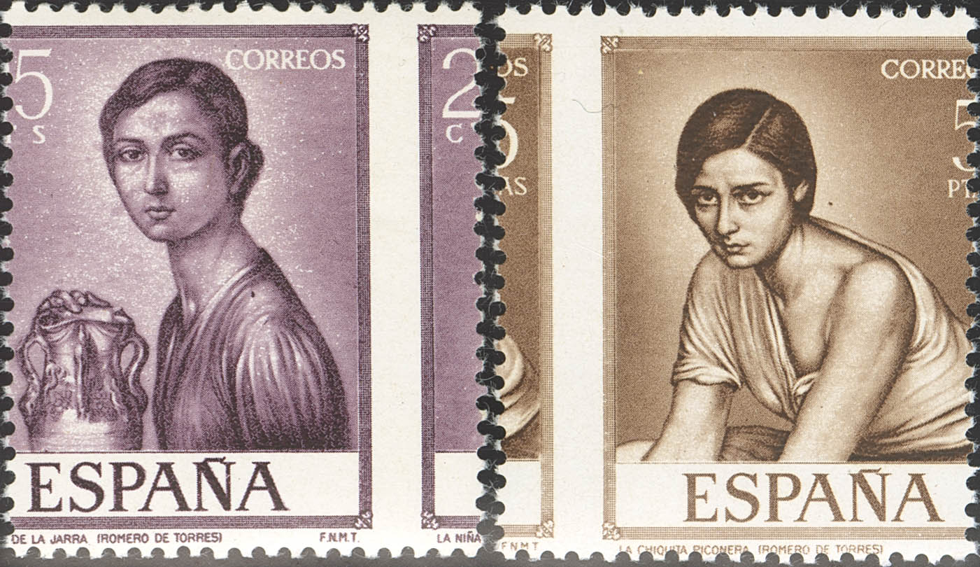 ★★ 1657dhf, 1665dhf. 1965. 25 cts burgundy and 5 pts chestnut. Variety OMITTED GOLD COLOR and DISPLACED DENT. MAGNIFICENT. Edifil 2025: 220 Euros