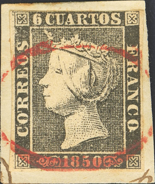 △ 1. 1850. 6 cuartos black (I-2), on fragment. Pre-philatelic postmark "O" (large), in red, from Vigo postage. MAGNIFICENT AND EXTREMELY RARE. Cert. GRAUS.