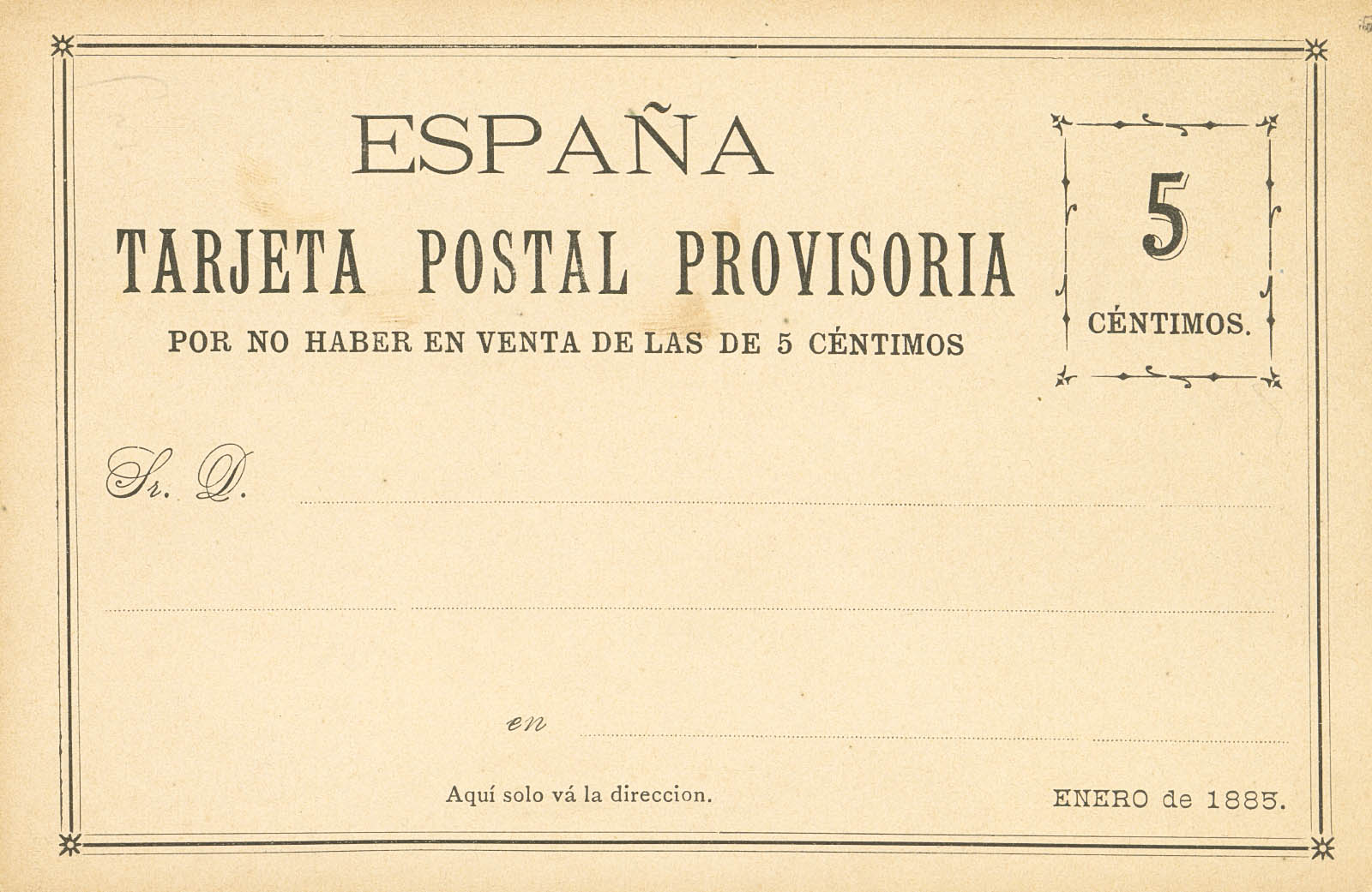 (★)1885. 5 cts black on Provisional Postcard. Legend "Since there are no 5 cts for sale". MAGNIFICENT AND EXTREMELY RARE.