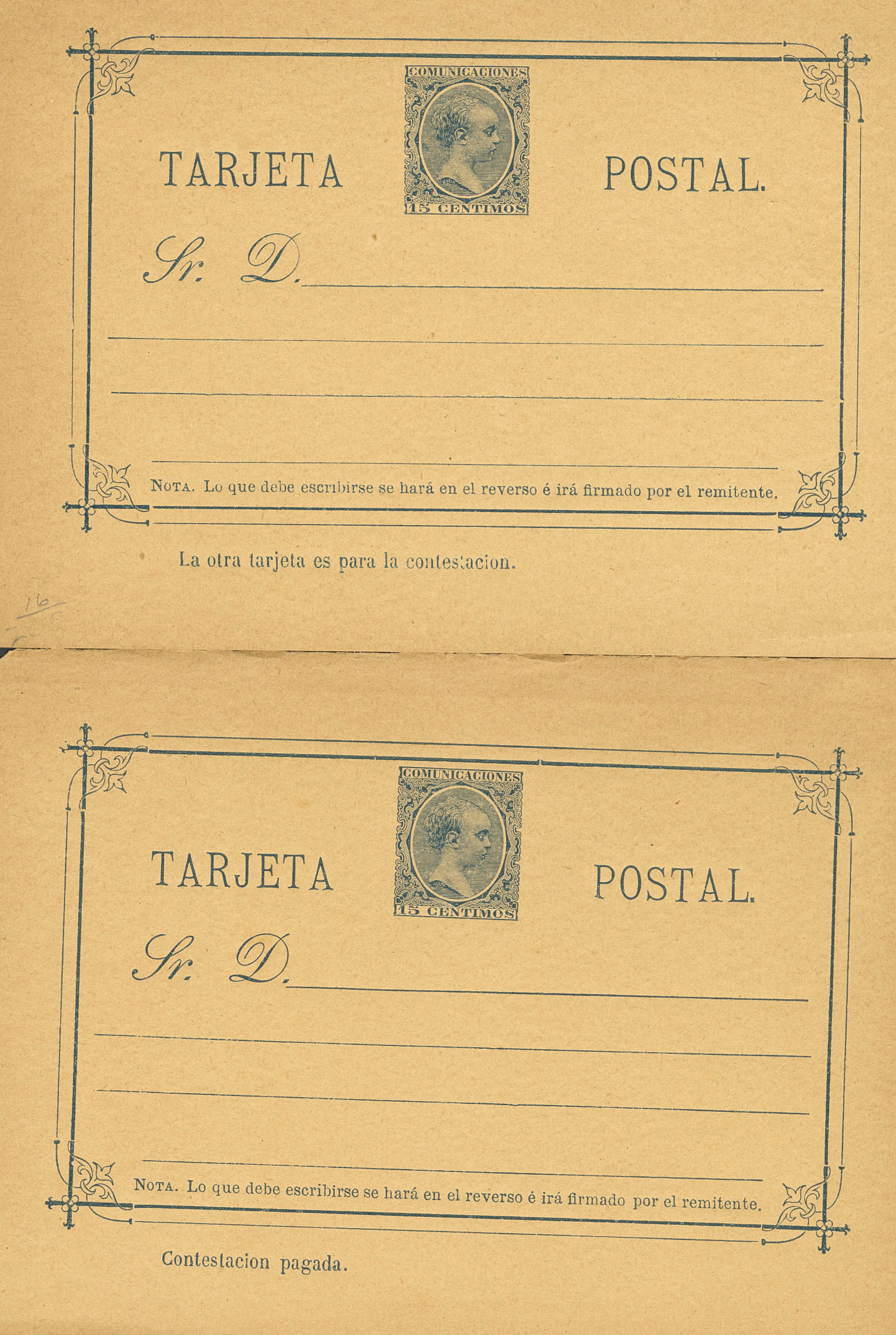 (★) EP20. 1889. 15 cts + 15 cts blue on Postal Stationery (divided), return. MAGNIFICENT. Edifil 2026: -86 Euros