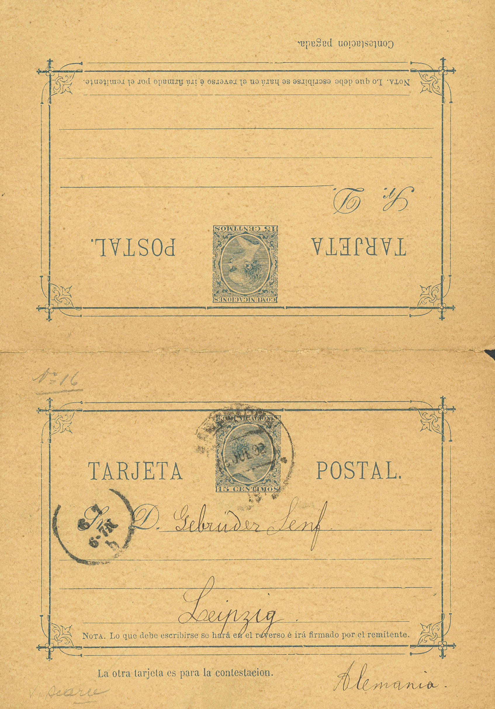 EP20. 1889. 15 cts + 15 cts blue envelope. Postal Stationery from Girona to Leipzig (Germany), postage only on the outbound journey. Arrival on the front. MAGNIFICENT. Edifil 2026: 153 Euros