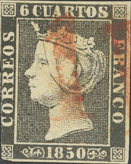 1A. 1850. 6 cuartos black (II-28). Pre-philatelic postmark 1¿R?, in red of unknown origin. MAGNIFICENT. Cert. GRAUS.