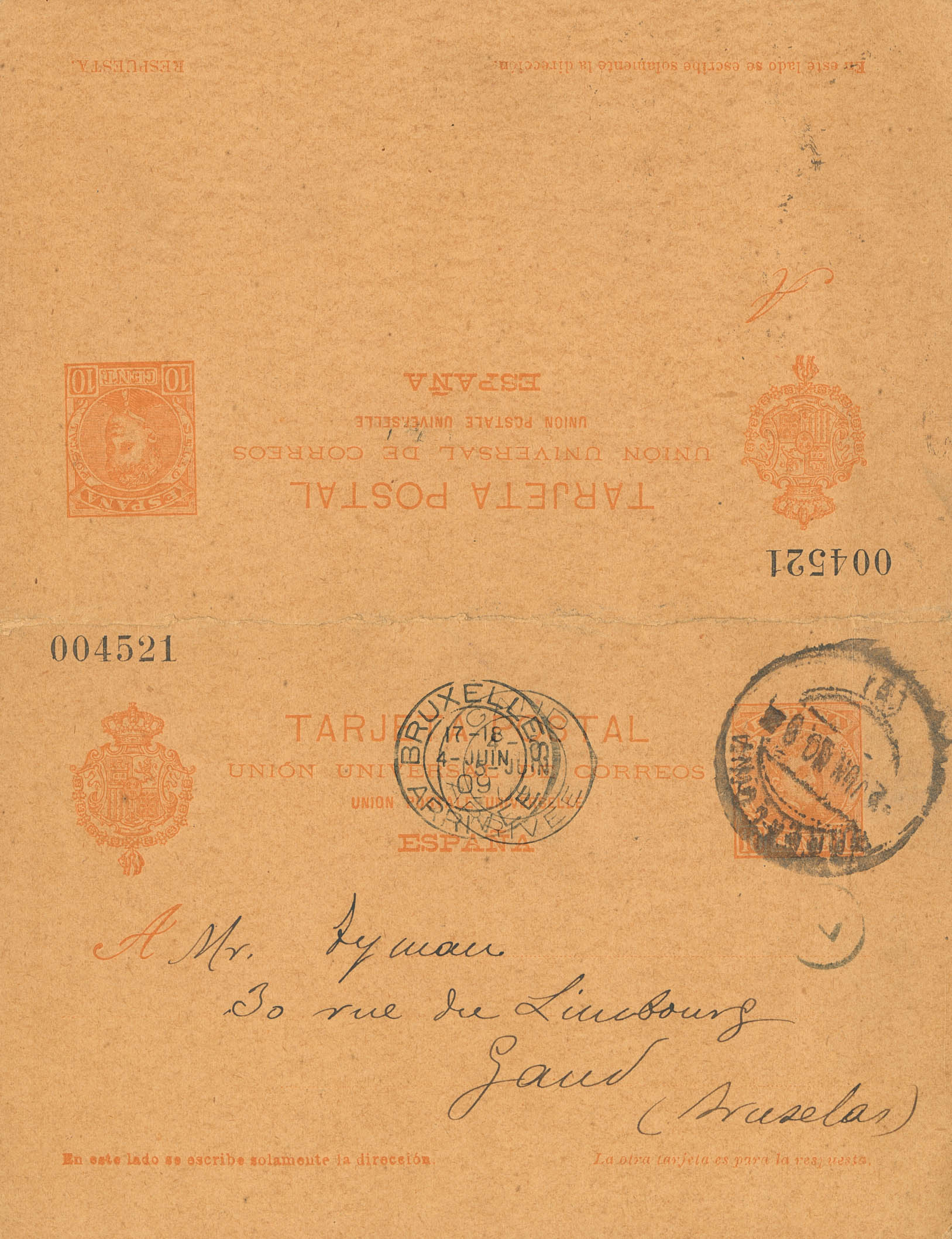EP41. 1909. 10 cts + 10 cts orange envelope. Postal Stationery from BAGoodELONA to BRUSSELS, circulated only on the outbound journey. MAGNIFICENT. Edifil 2026: 112 Euros
