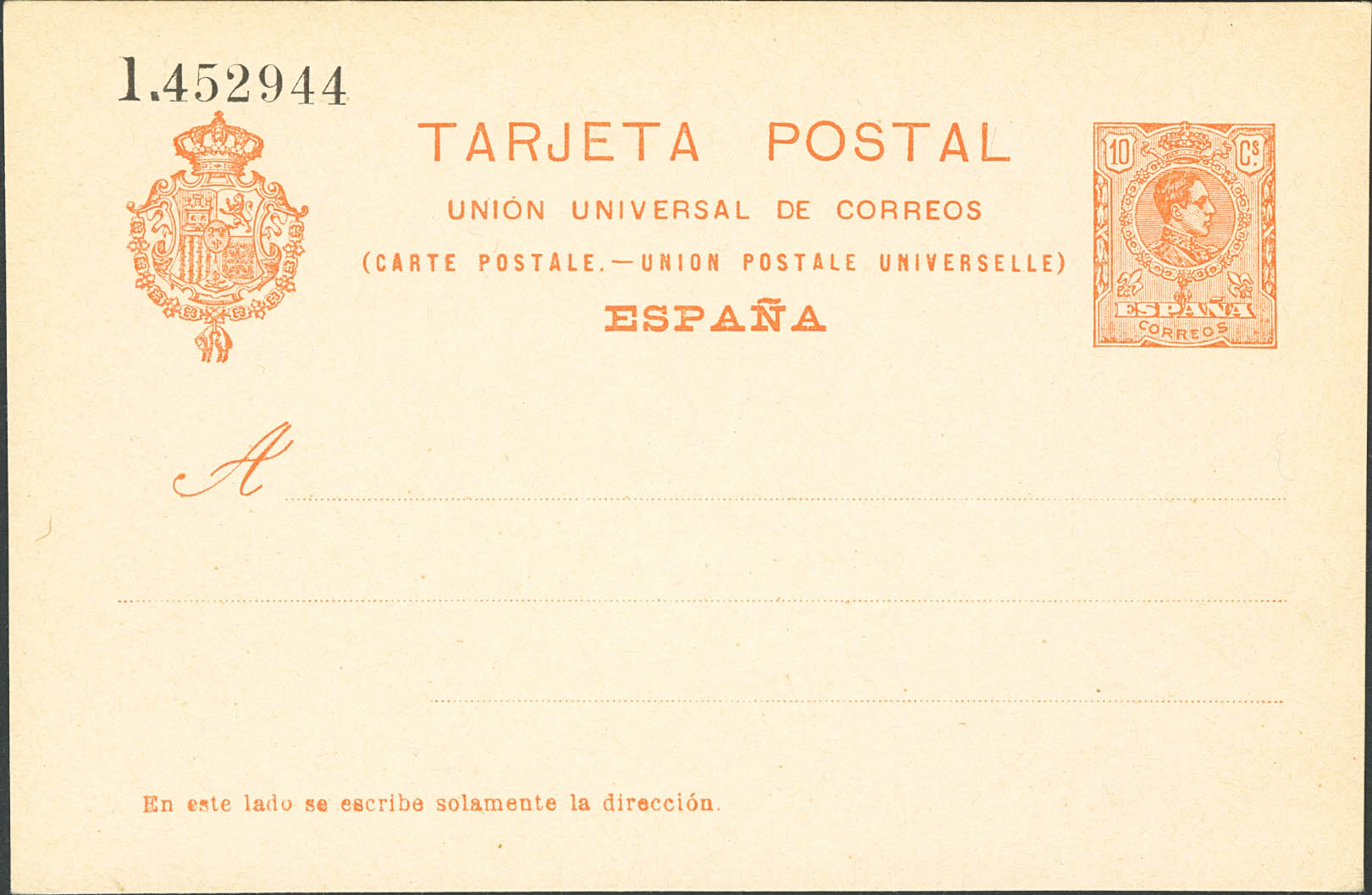 (★) EP53. 1910. 10 cts orange on Postal Stationery Card. MAGNIFICENT. Edifil 2025: 45 Euros