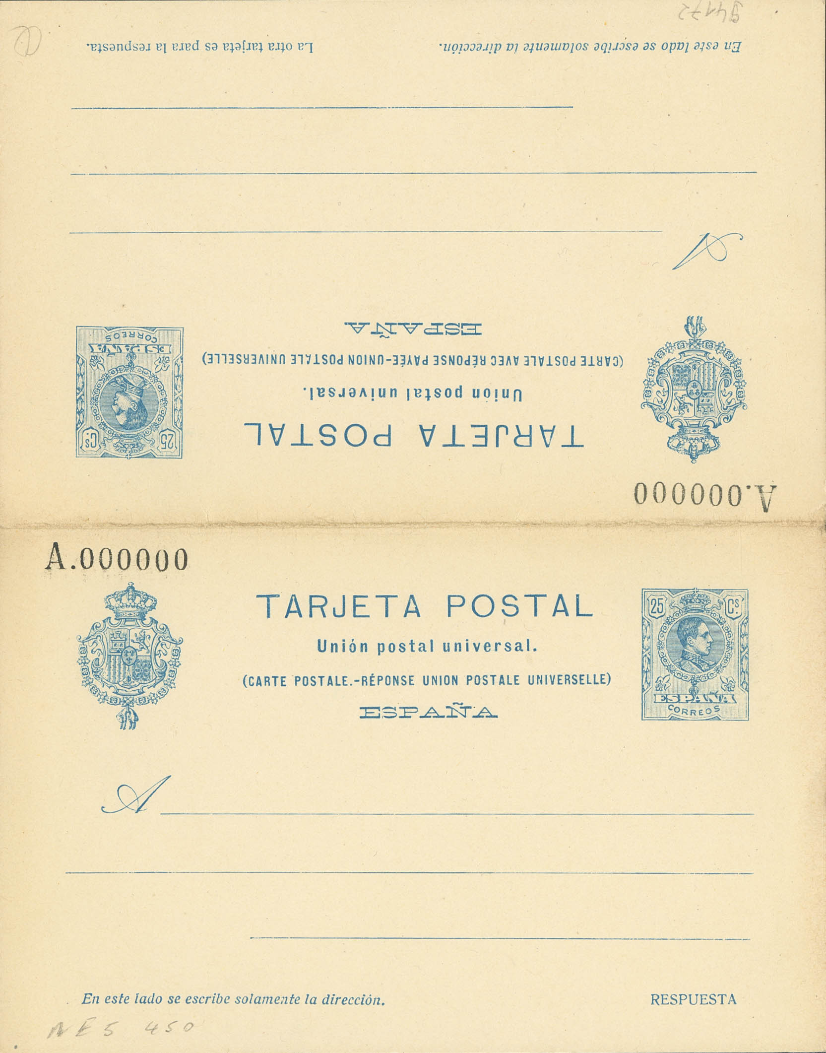 (★) EPNE5. 1916. 25 cts + 25 cts blue on UNISSUED Postal Stationery, return. MAGNIFICENT AND RARE. Edifil 2026: 525 Euros