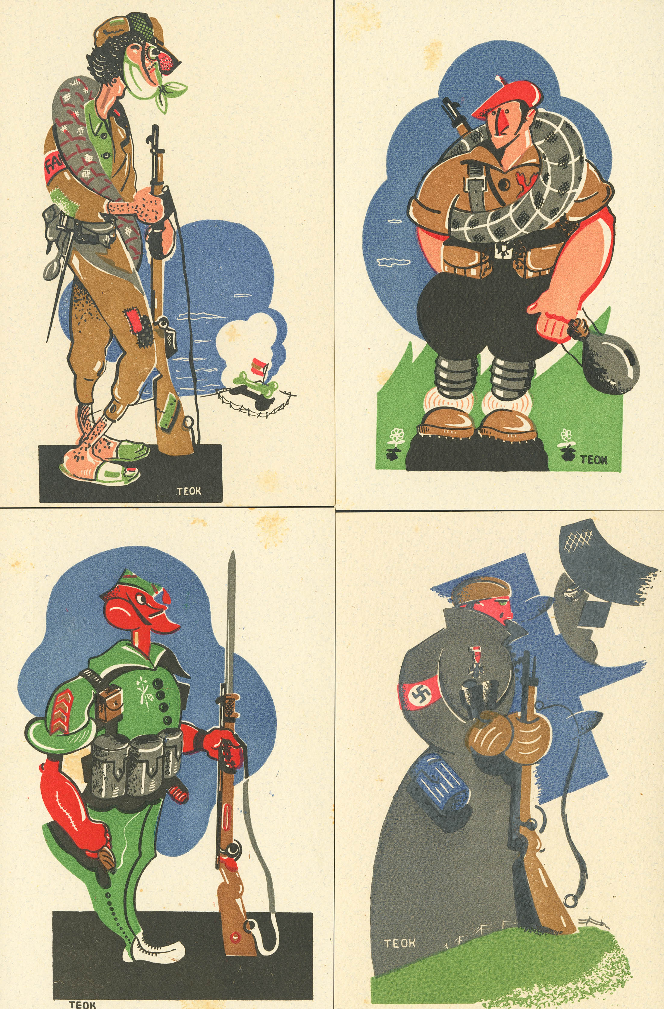 (★)(1937ca). Complete set of ten postcards by TEOK with caricatures of soldiers and a nurse from the Nationalist side (spots of age). BEAUTIFUL. (Allepuz 518/27)