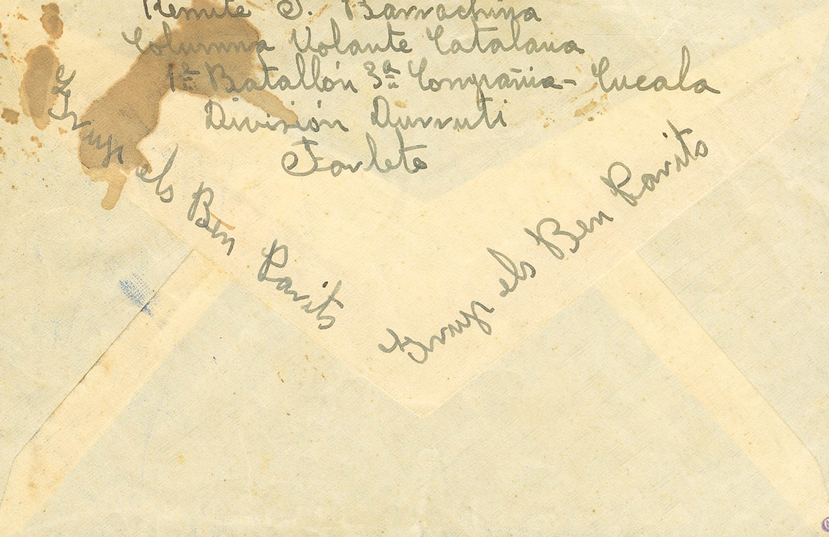(1936ca). BUJARALOZ (HUEUncirculatedA) to BAGoodELONA. On the front, it reads PEOPLE'S ARMY OF CATALONIA / FLYING COLUMN (DURRUTI DIVISION) / MAIL and DURRUTI COLUMN / BUJARALOZ FRONT / CENSORSHIP, in violet. MAGNIFICENT AND VERY RARE LETTER CORRESPONDING TO THE DURRUTI COLUMN. IT WAS AN ANAGoodHIST MILITIA FROM BAGoodELONA WHOSE INTENTION WAS TO TAKE ZARAGOZA. THIS MILITIA WAS ONE OF THE MOST IMPORTANT ON THE REPUBLICAN SIDE AND IN MAY 1937 BECAME THE 26TH DIVISION OF THE PEOPLE'S ARMY OF THE REPUBLIC.