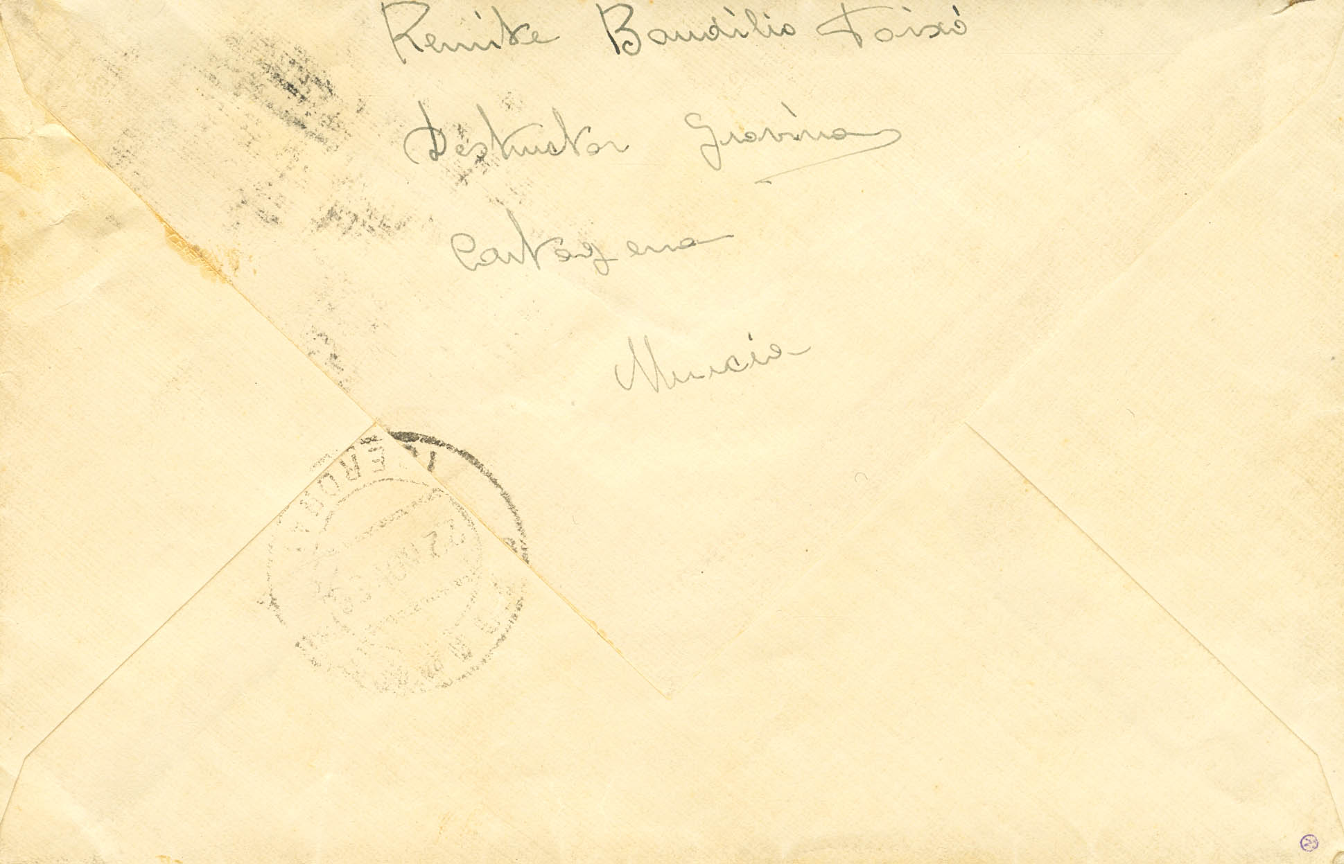 1939. CARTAGENA (MUGoodIA) to CADAQUES (GERONA). Franchise mark DESTRUCTOR GRAVINA / COMMAND, in violet. MAGNIFICENT AND RARE.