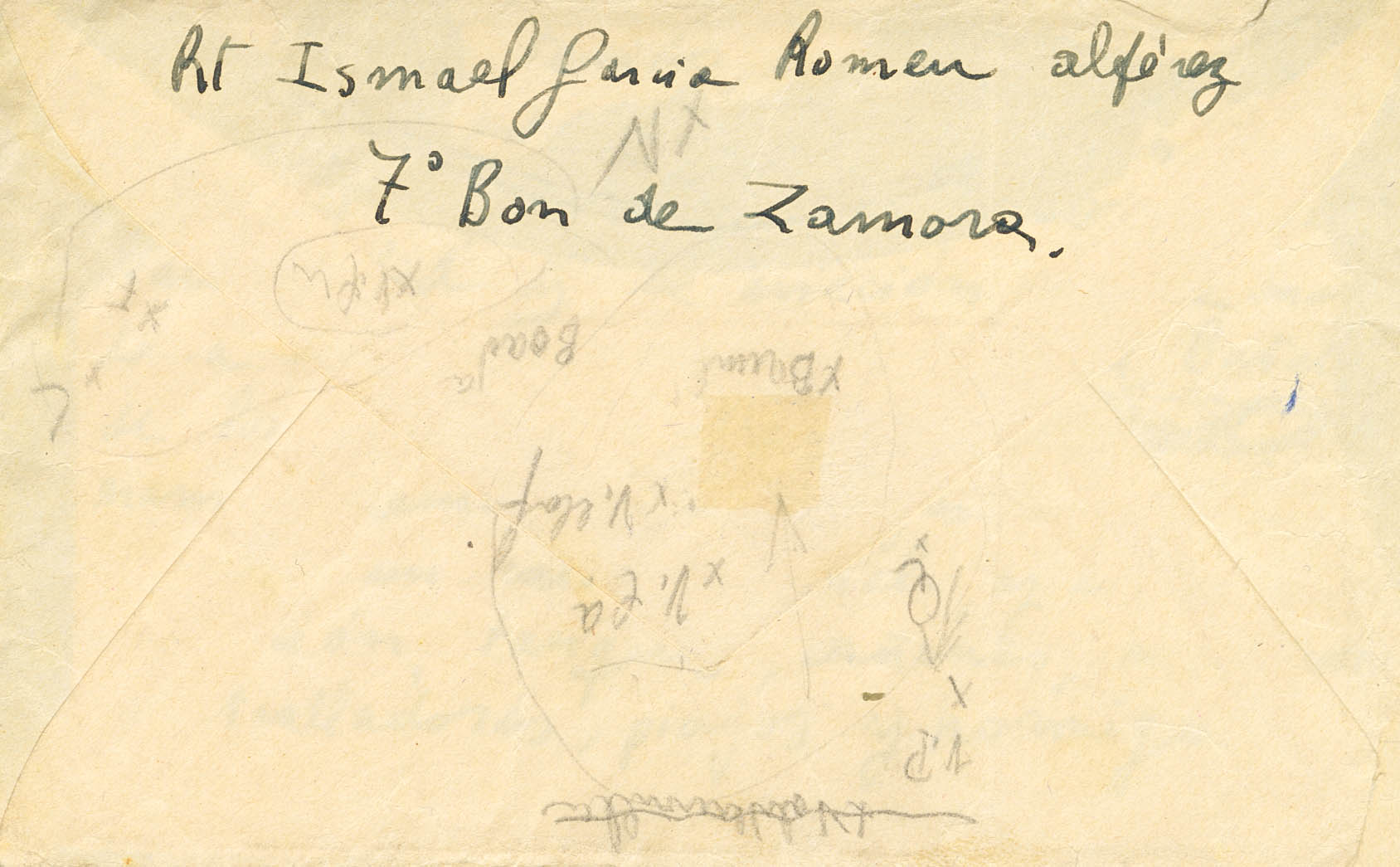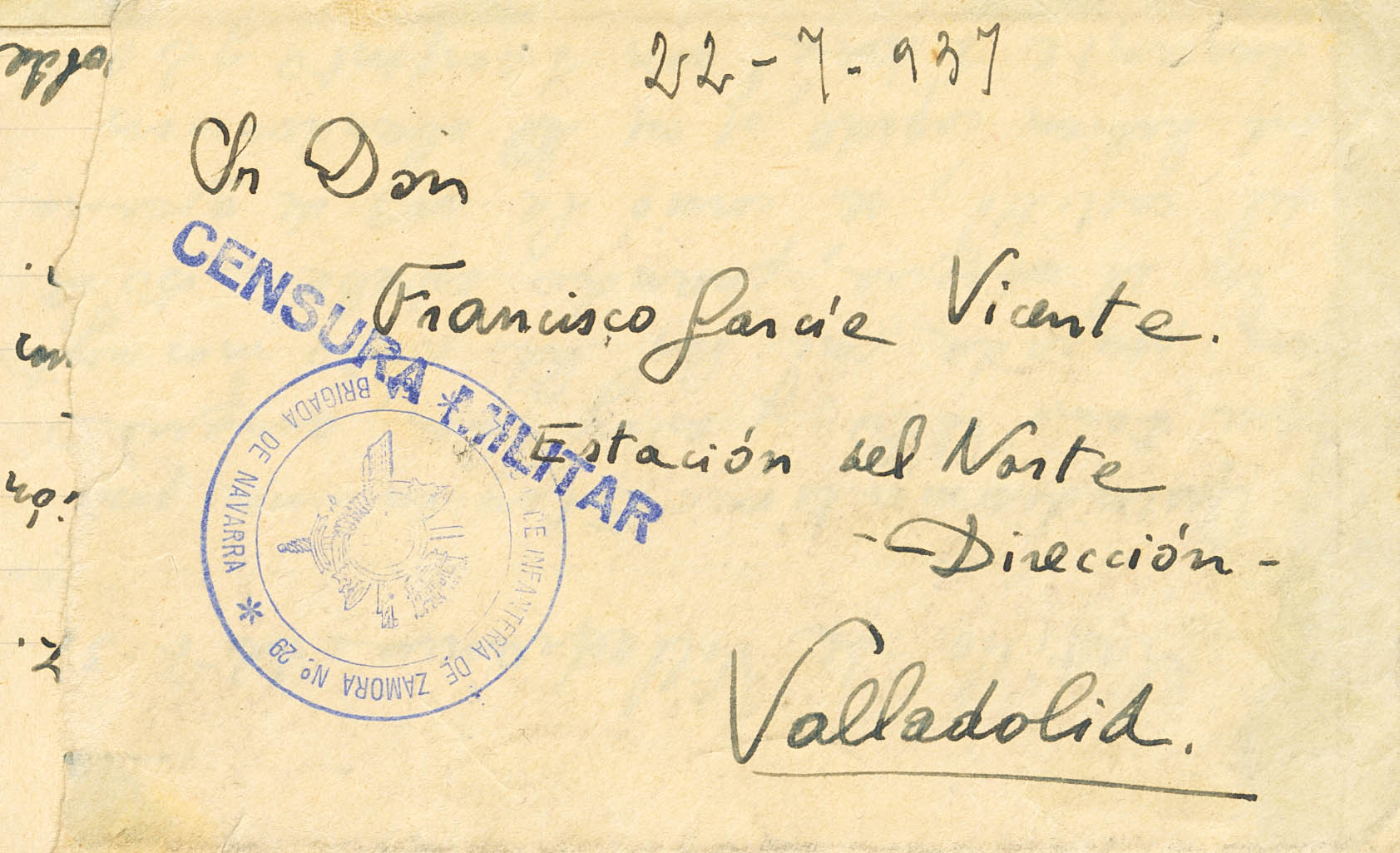 1937. VILLAFRANCA CASTLE (BRUNETE FRONT) to VALLADOLID, letter with internal text sent by Second Lieutenant Ismael García Romeu, who years later would enlist in the Blue Division and Blue Legion, where he would receive the most important decorations. Franchise mark 7th INFANTRY BONUS OF ZAMORA No. 29 / 5th BRIGADE OF NAVARRA, in violet. MAGNIFICENT AND RARE.