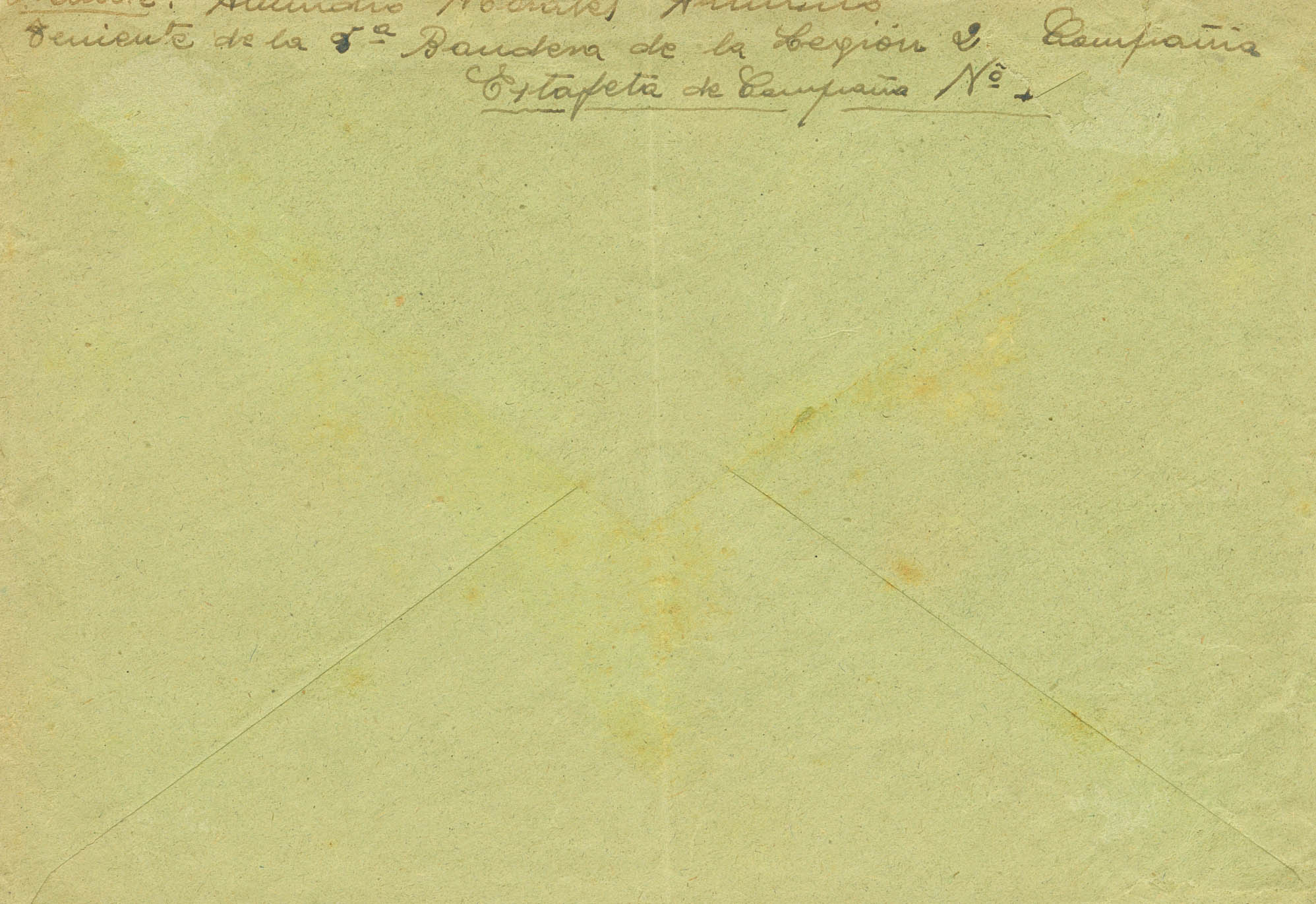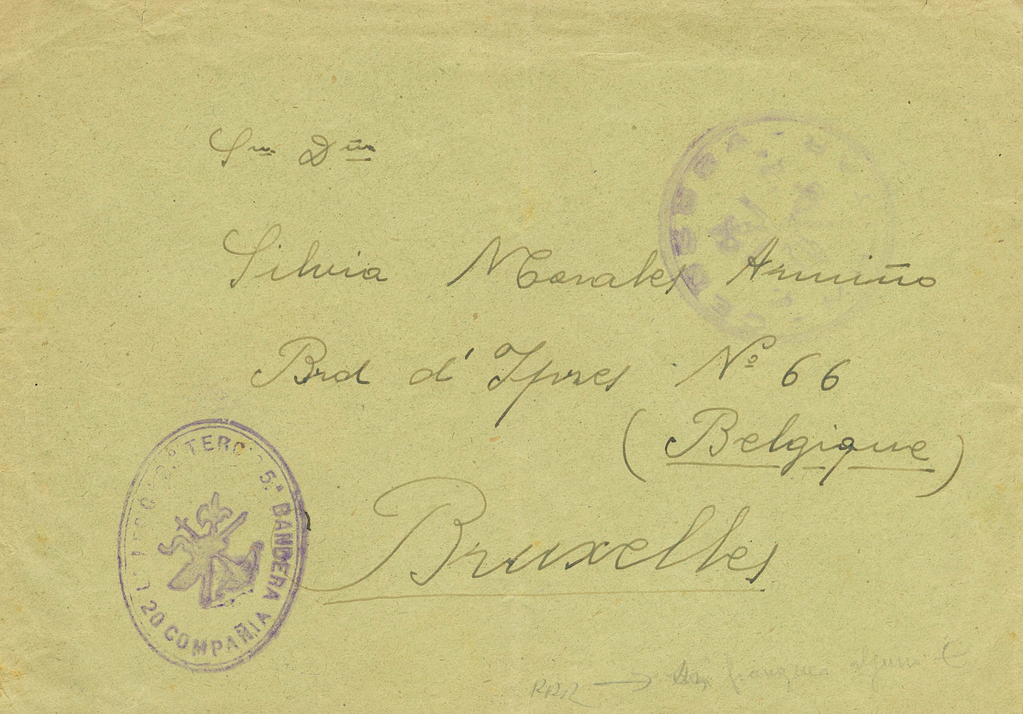 (1938ca). Addressed to BRUSSELS (BELGIUM). Franchise mark LA LEGION 2º TEGoodIO 5ª BANDERA / 20 COMPAÑIA, in violet. MAGNIFICENT AND EXTREMELY RARE.