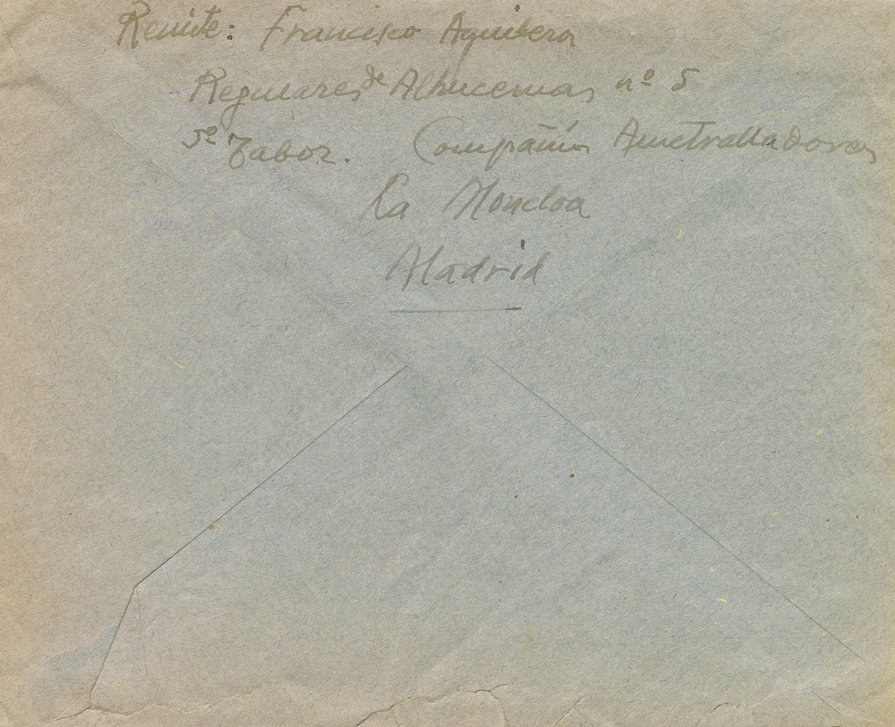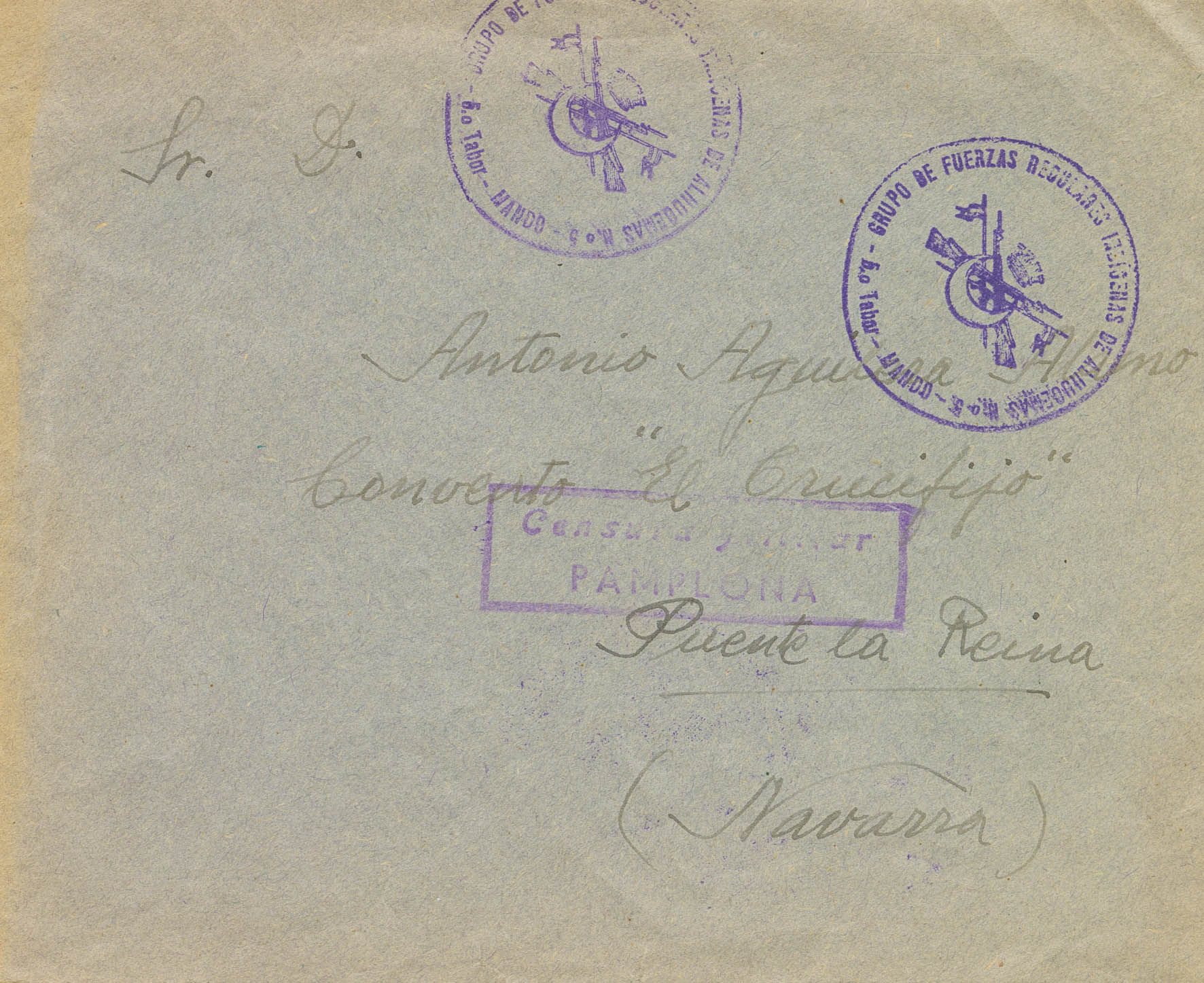 (1938ca). MADRID to PUENTE DE LA REINA. Franchise mark GRUPO DE FUERZAS REGULARES INDIGENAS DE ALHUCEMAS / 5º TABOR-MANDO, in violet. MAGNIFICENT AND RARE.