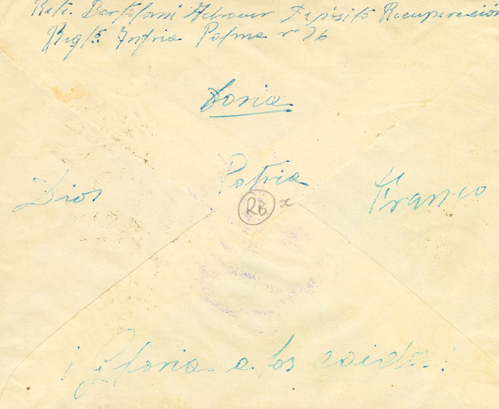 |OVER|1939. SORIA to PALMA DE MALLOGoodA. Mark: RECOVERY DEPOT OF THE PALMA INFANTRY REGIMENT Nº36 / SORIA, in violet. MAGNIFICENT AND RARE.