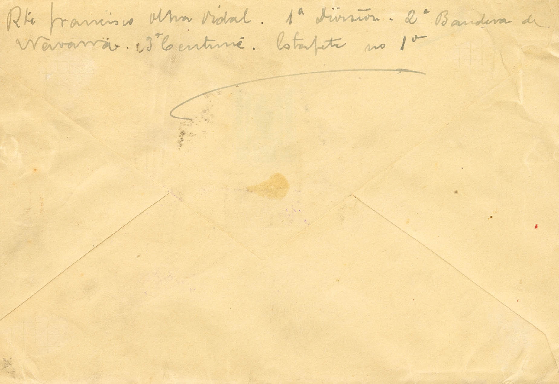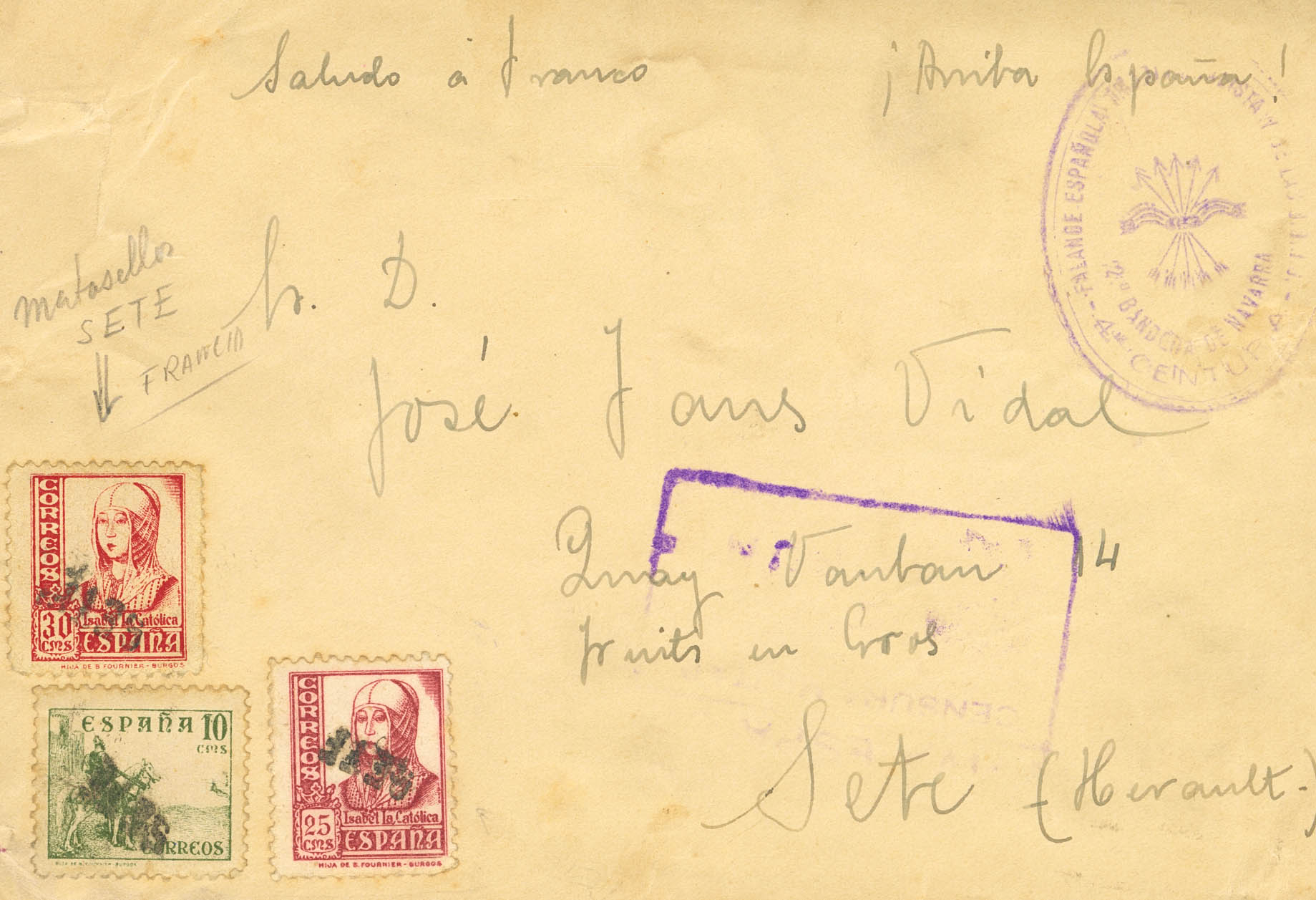 817, 822, 823. (circa 1939). 10 cts green, 25 cts carmine, and 30 cts pink. Addressed to SETE (FRANCE). Postmark SETE, applied at destination, and on the front, the mark FALANGE ESPAÑOLA Y TRADICIONALISTA DE LAS JONS / 2ª BANDERA DE NAVARRA / 4ª CENTURIA, in violet. MAGNIFICENT AND RARE.