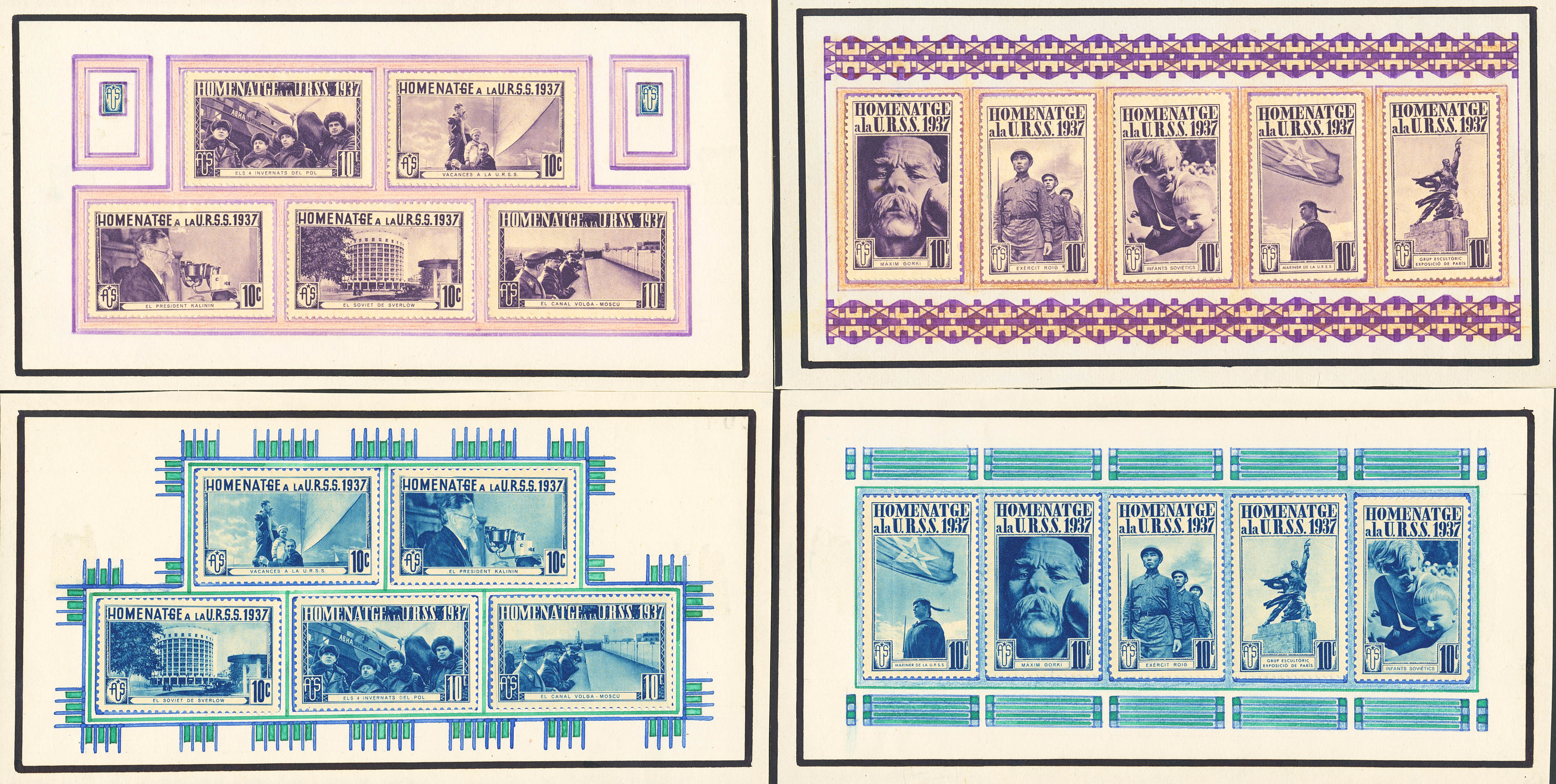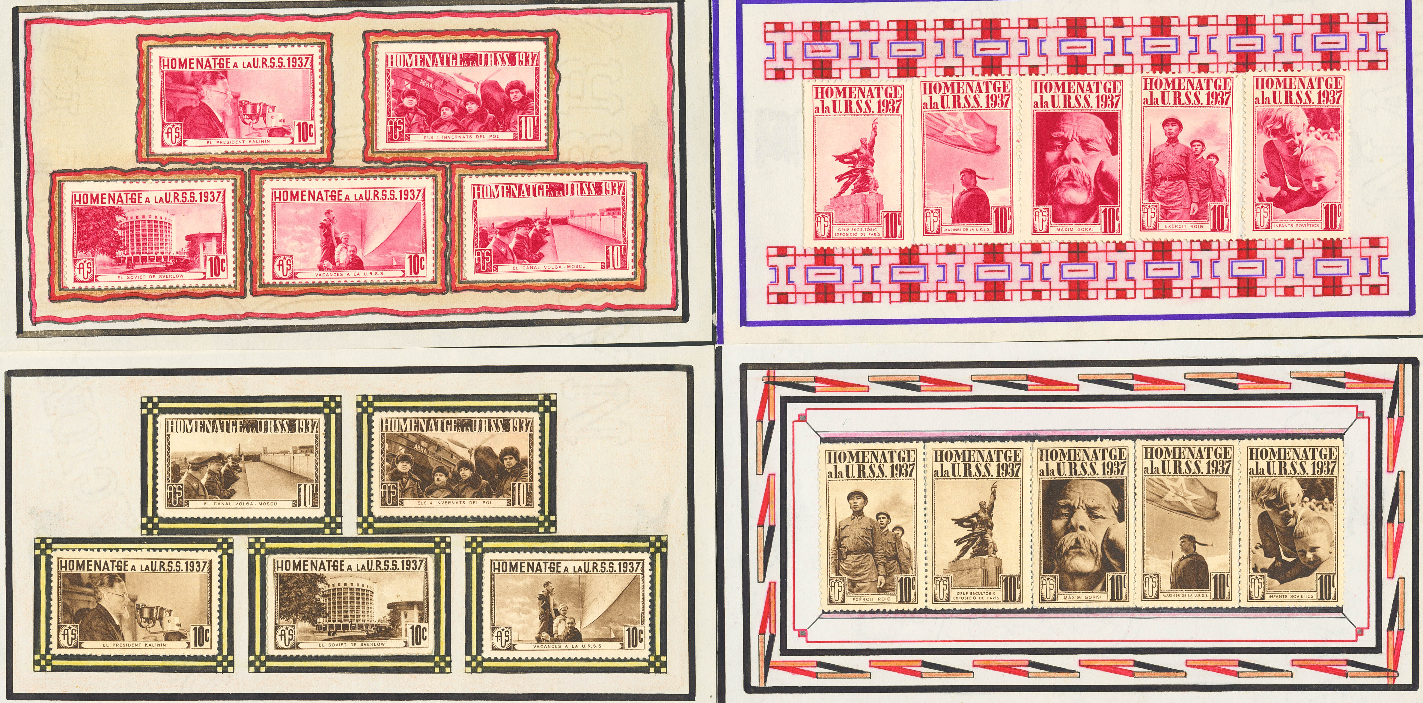 1937. Four complete series, in sepia, violet, blue, and red. MAGNIFICENT HOMAGE TO THE USSR. (Guillamón 1739/48A, 1739/48B, 1739/48C, 1739/48D)