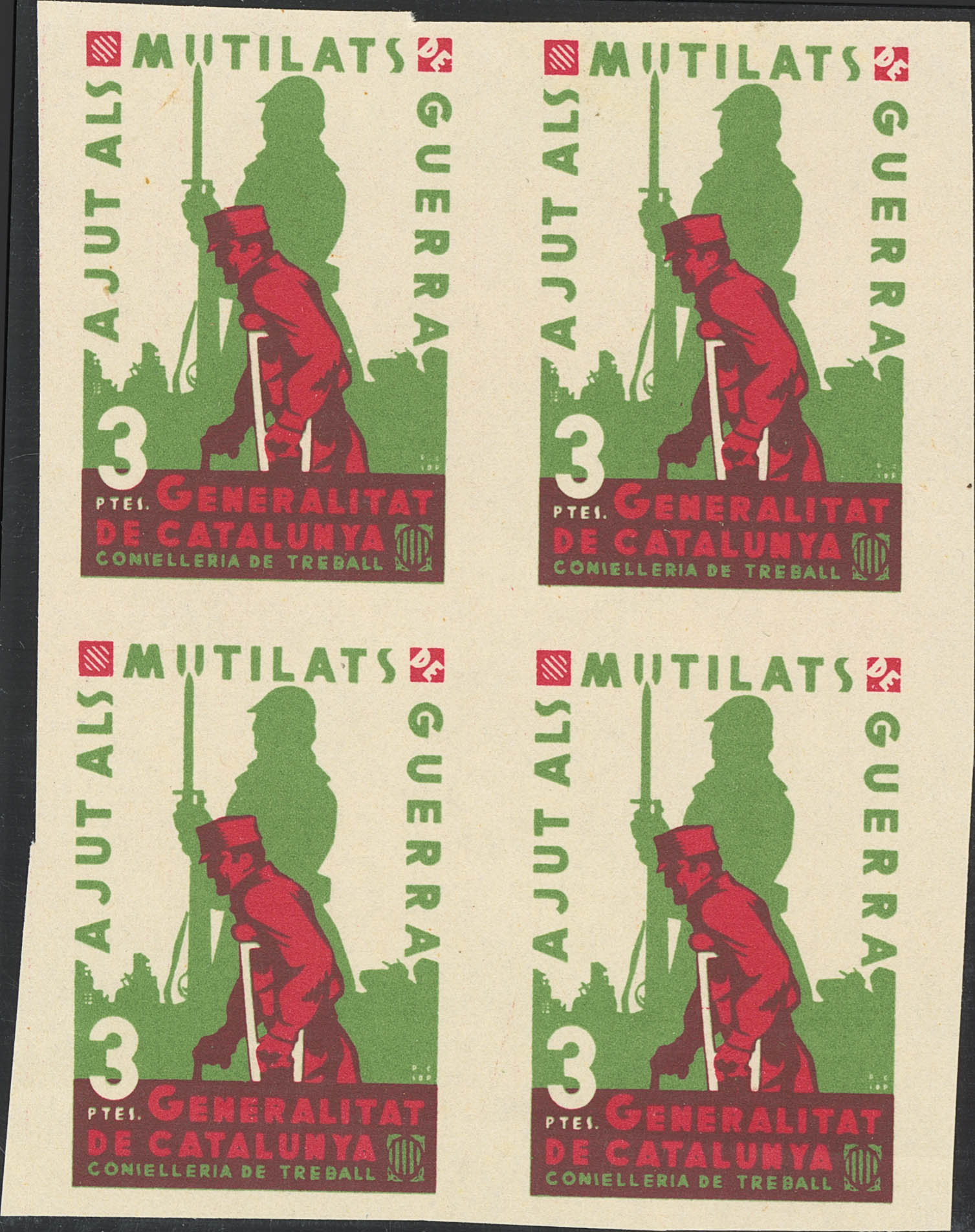 (★)1937. 3 sts carmine and green, block of four UNTOOTHED. TREBALL COUNSELING AJUT ALS WAR MUTILATS. MAGNIFICENT. (Guillamón 2142)