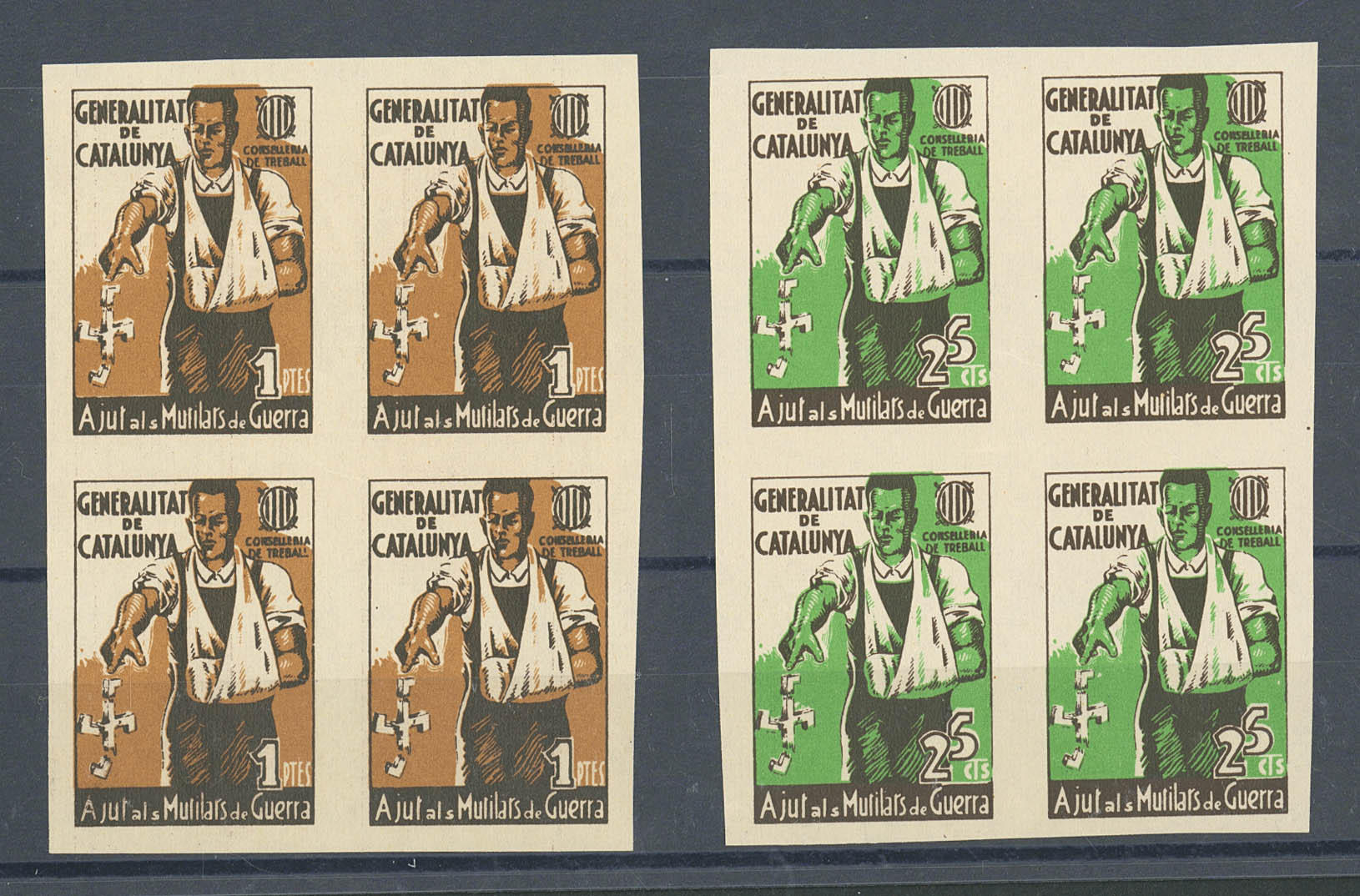 (★)1937. Complete series, block of four UNTOOTHED. TREBALL COUNSELING AJUT ALS WAR MUTILATS. MAGNIFICENT. (Guillamón 2145/46)