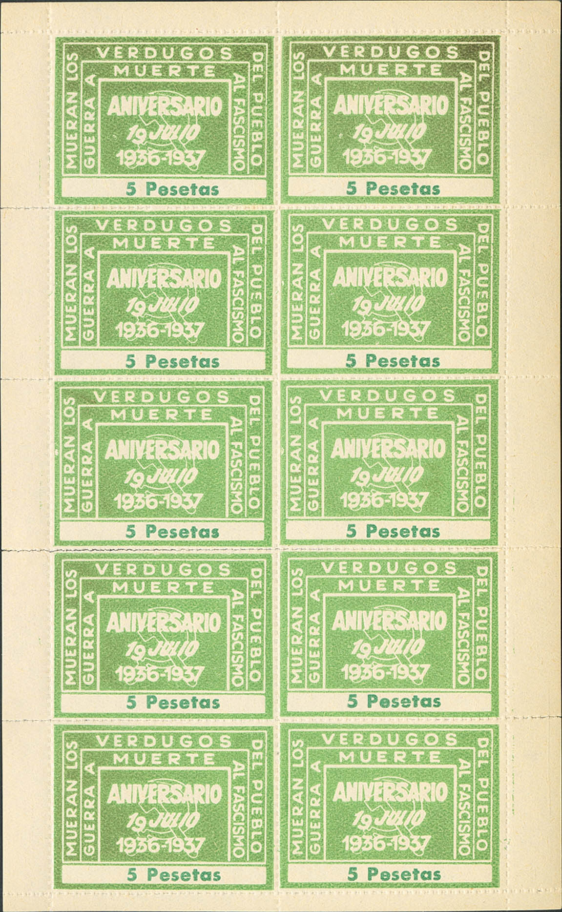 1937. 5 pts green, minisheet of ten panels. DEATH TO THE EXECUTIONERS OF THE PEOPLE. MAGNIFICENT AND VERY RARE, NOT CATALOGED IN GUILLAMON.