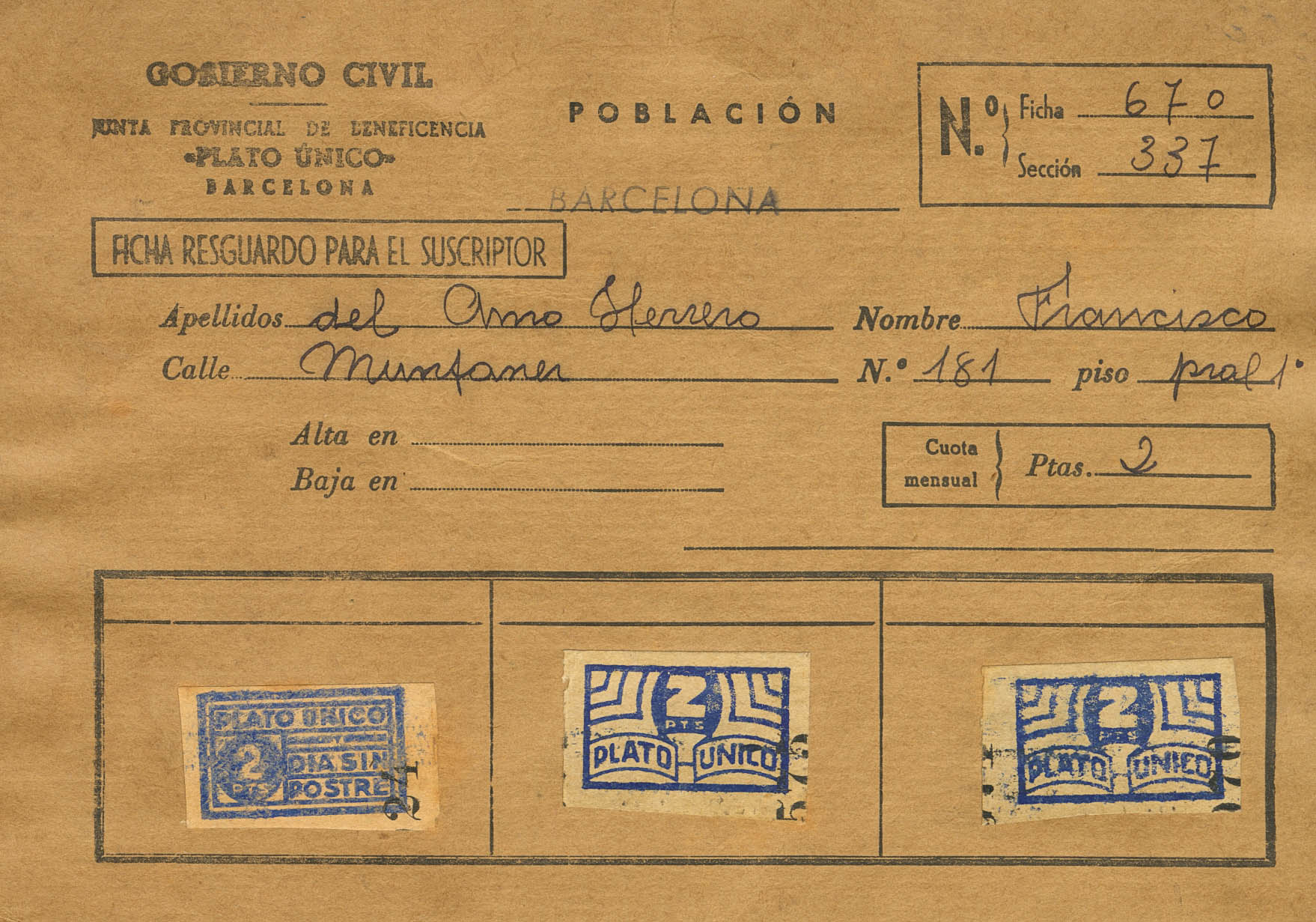 △(1940ca). 2 pts blue ONE DISH NO DESSERT DAY and 2 pts ultramarine ONE DISH, two stamps, on Subscriber Card. MAGNIFICENT.