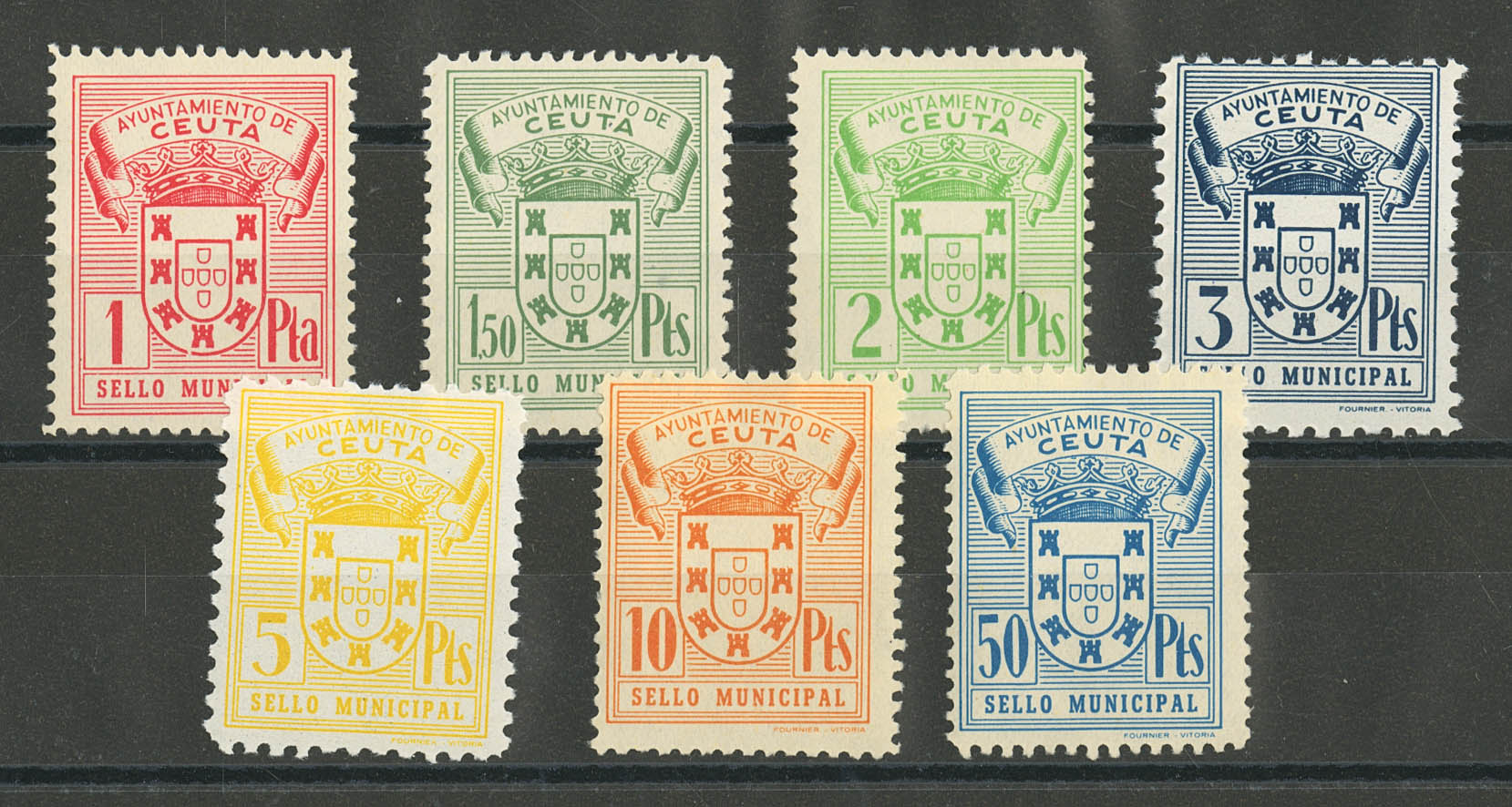 ★★(1939ca). Complete series, seven values. CEUTA. MUNICIPAL STAMP. MAGNIFICENT.