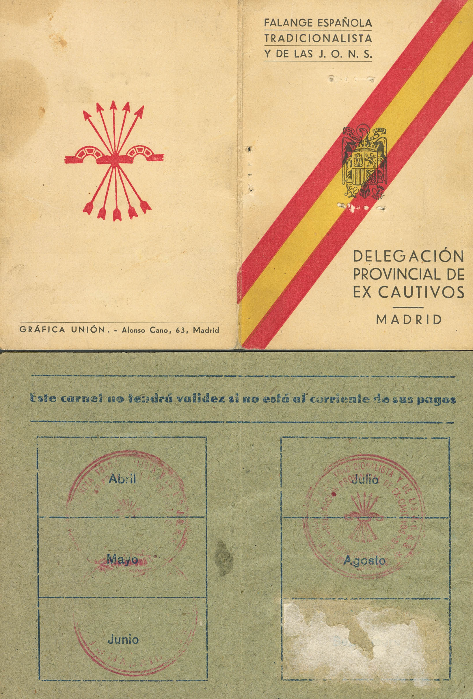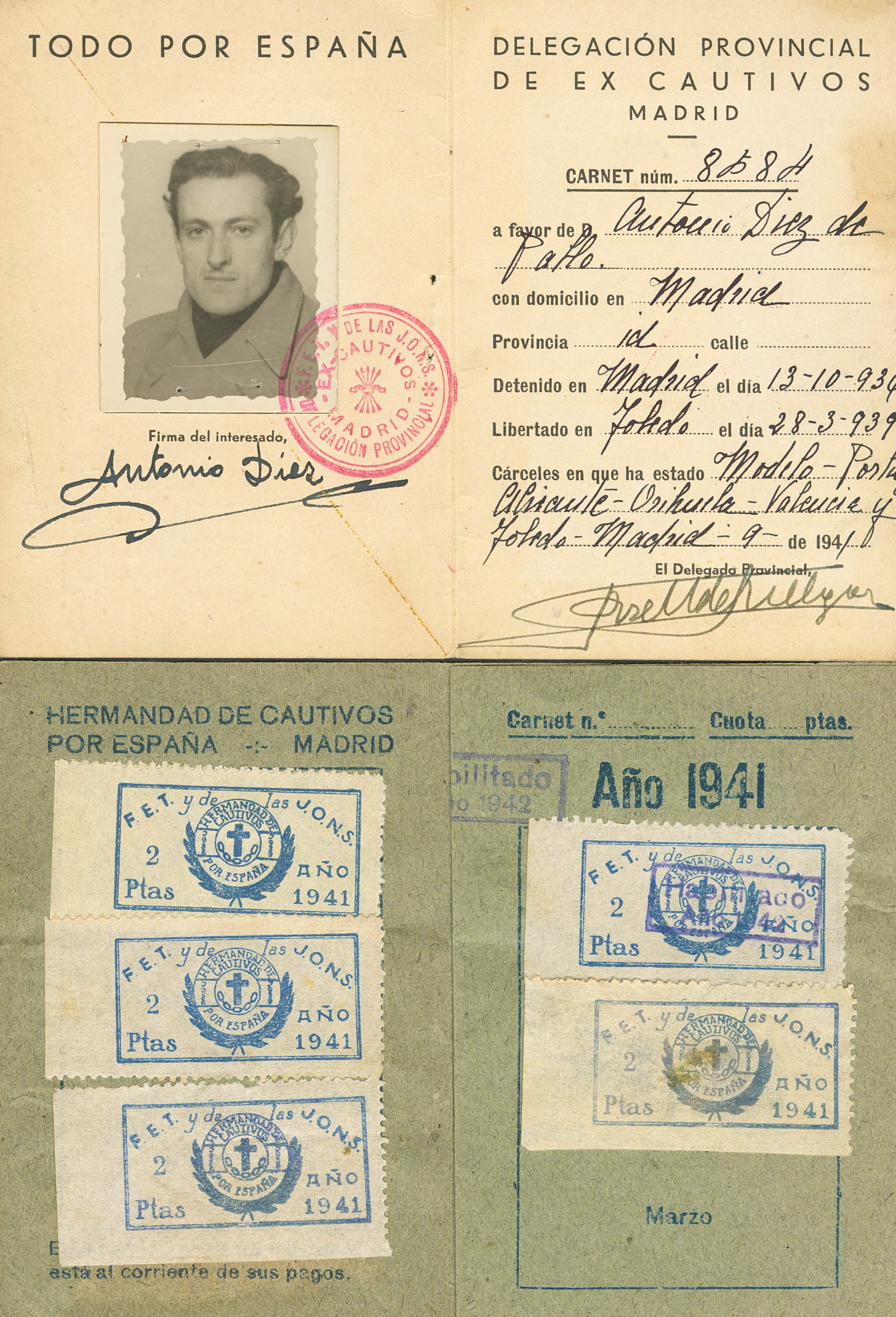 1941. Complete membership card of the PROVINCIAL DELEGATION OF EX-CAPTIVES of the TRADITIONALIST SPANISH FALANGE and the JONS with four 2-point blue vignettes of the BROTHERHOOD OF CAPTIVES. MAGNIFICENT AND VERY RARE, UNREVIEWED VISUAL.