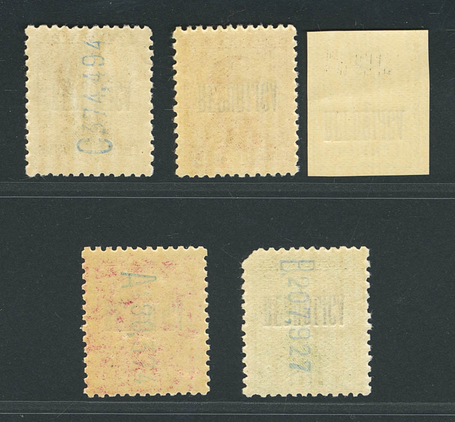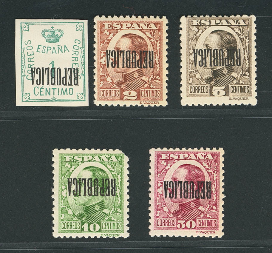★★ 5/13hi. 1931. Complete series, five values (10 cts green, defect in upper right corner). REVERSED OVERPRINT. MAGNIFICENT. Edifil 2017: 114 Euros