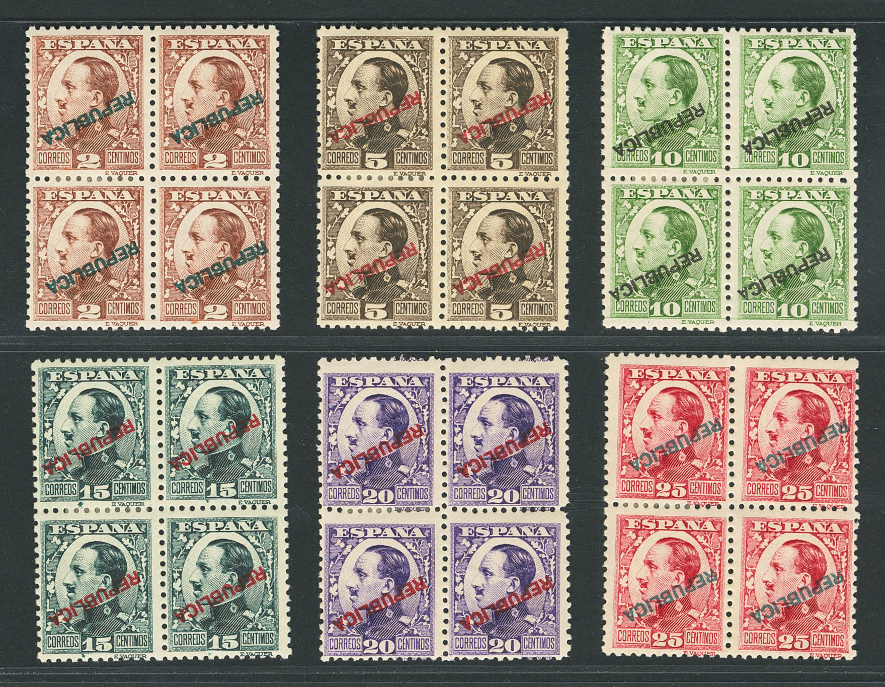★★/★ 2/7hi(4). 1931. 2 cts, 5 cts, 10 cts, 15 cts, 20 cts, 25 cts, in blocks of four. REVERSED OVERLOAD. MAGNIFICENT. Edifil 2017: 336 Euros