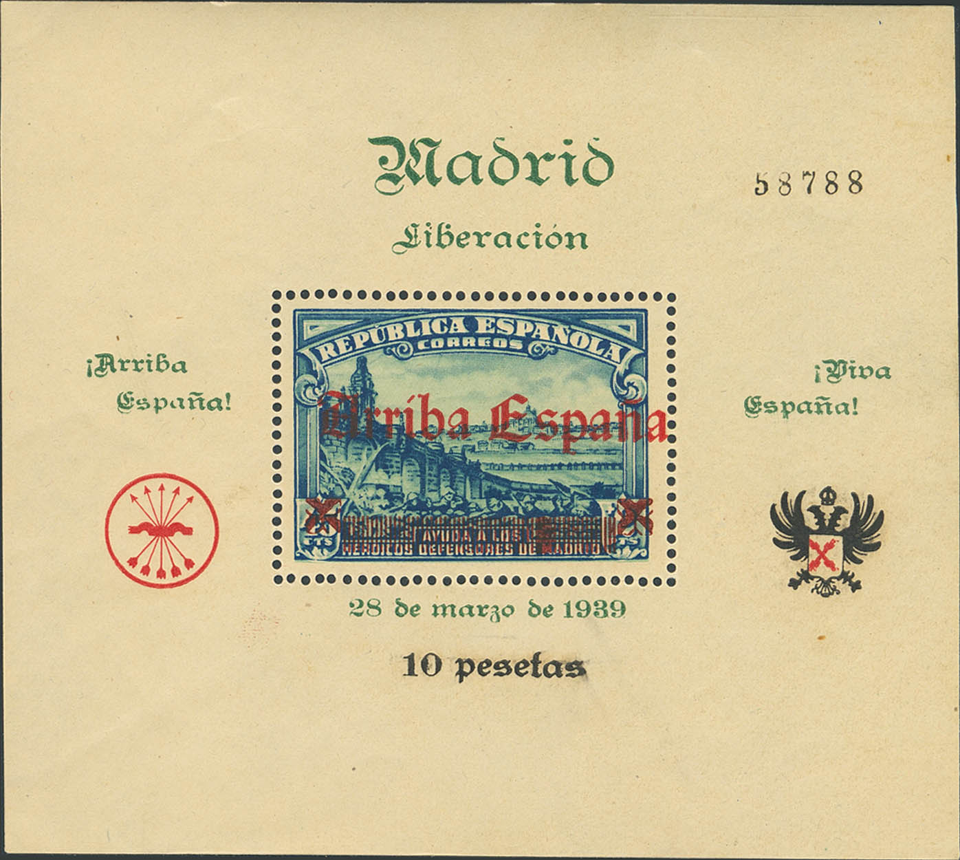 ★★ 54. 1939. 10 pts out of 45 cts + 2 pts blue, block sheet. MAGNIFICENT AND EXTRAORDINARILY RARE, ONLY FIFTY SHEETS ARE KNOWN, ESPECIALLY IN THIS EXCEPTIONAL QUALITY. Cert. CEM.