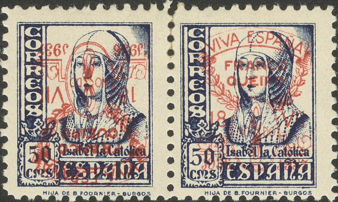 ★ 57hphi, 66hphi. 1937. 1 ct green and 50 ct blue, in pairs. ONE REVERSED OVEGoodHARGE STAMP. MAGNIFICENT.