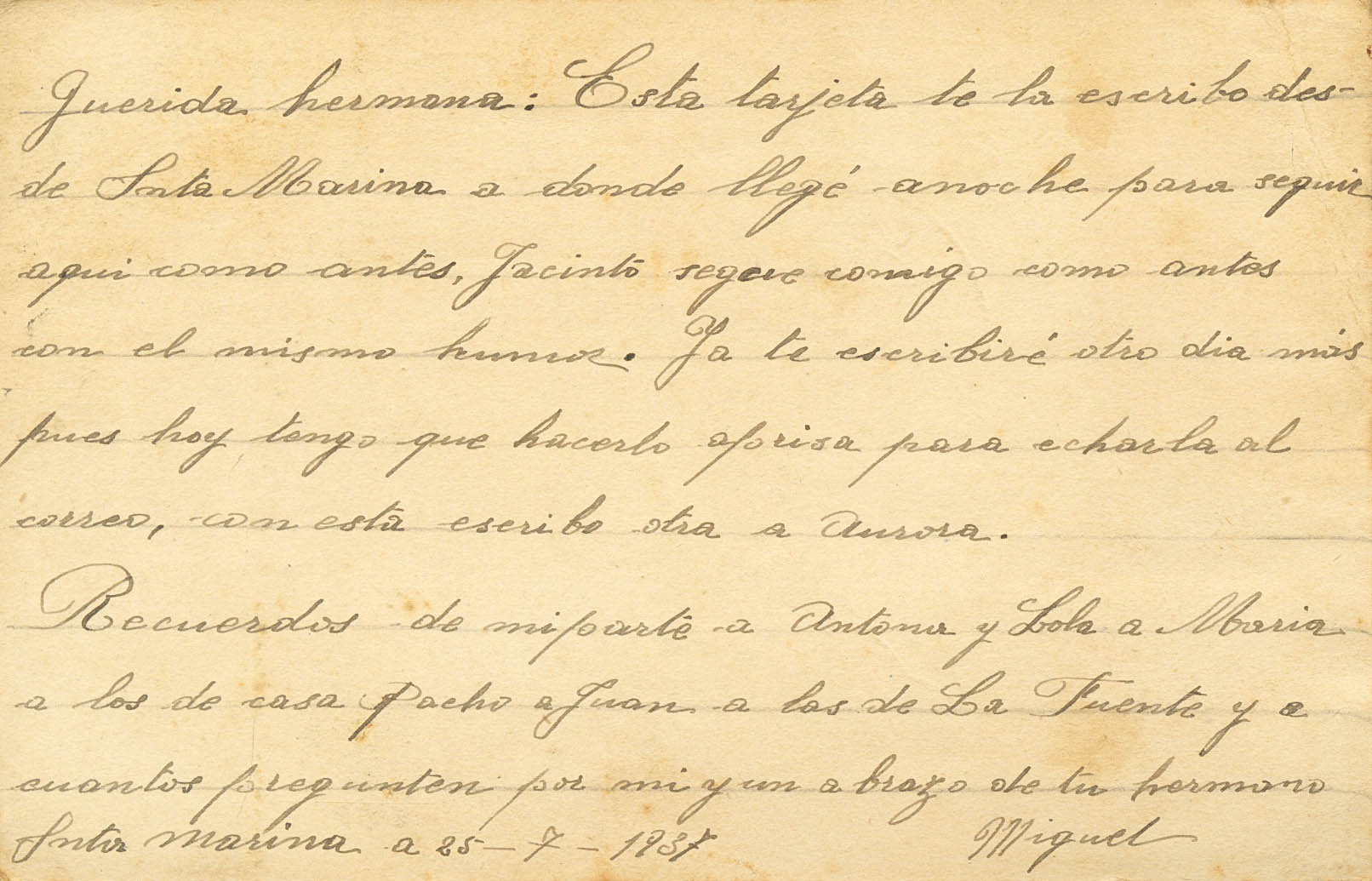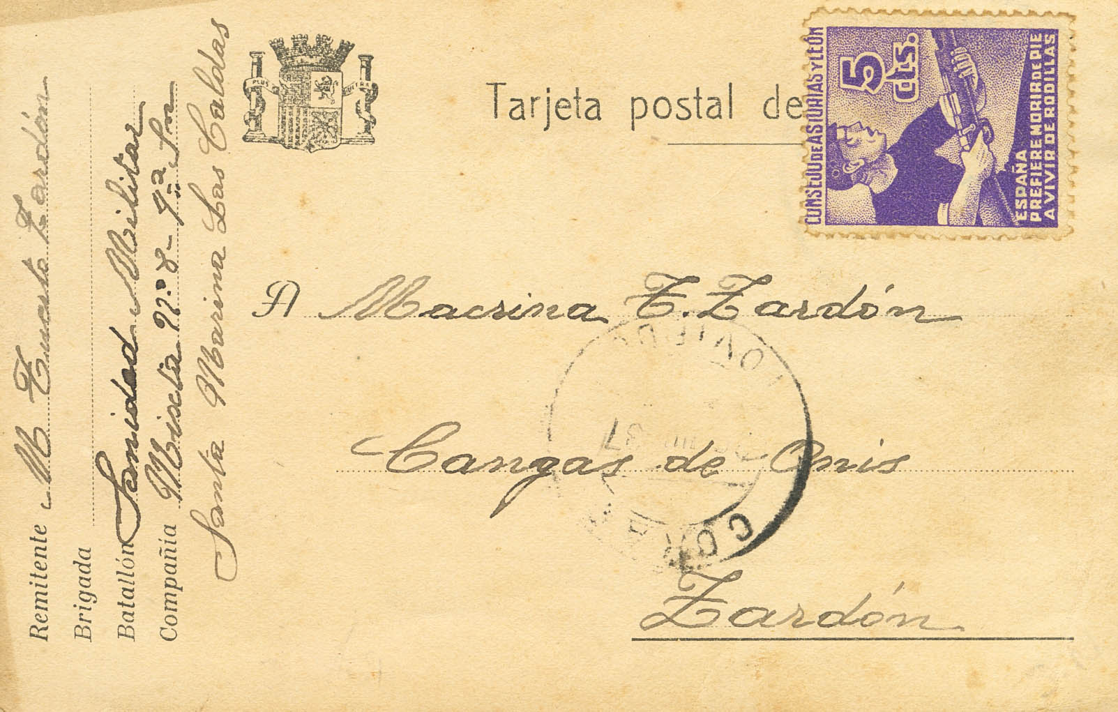 2. 1937. 5 cts violet. Postcard from SANTA MARINA (CANTABRIA) to ZARDON (ASTURIAS). MAGNIFICENT AND RARE, ESPECIALLY INTERESTING AS IT DEPICTS A SOLDIER FROM THE MEDICAL BATTALION.