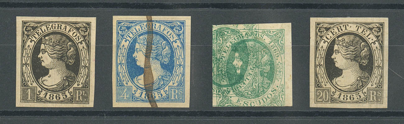 (★)/ 5/6P, 8P, 29P. 1865. Set of four stains of the 1 real black, 4 reales blue (ink streak) and 20 reales black of 1865 and 2 escudos green of 1869. MAGNIFICENT AND RARE.