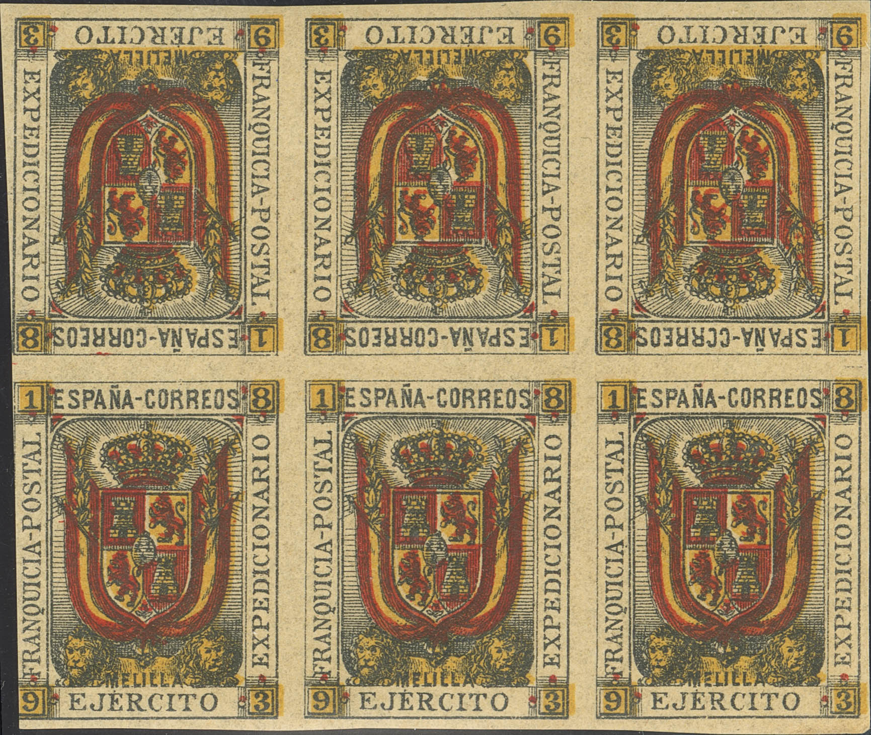 ★★ 1iias(3). 1893. No value, black, red and yellow, block of six with three palindromic pairs (one with a fair margin). MAGNIFICENT.