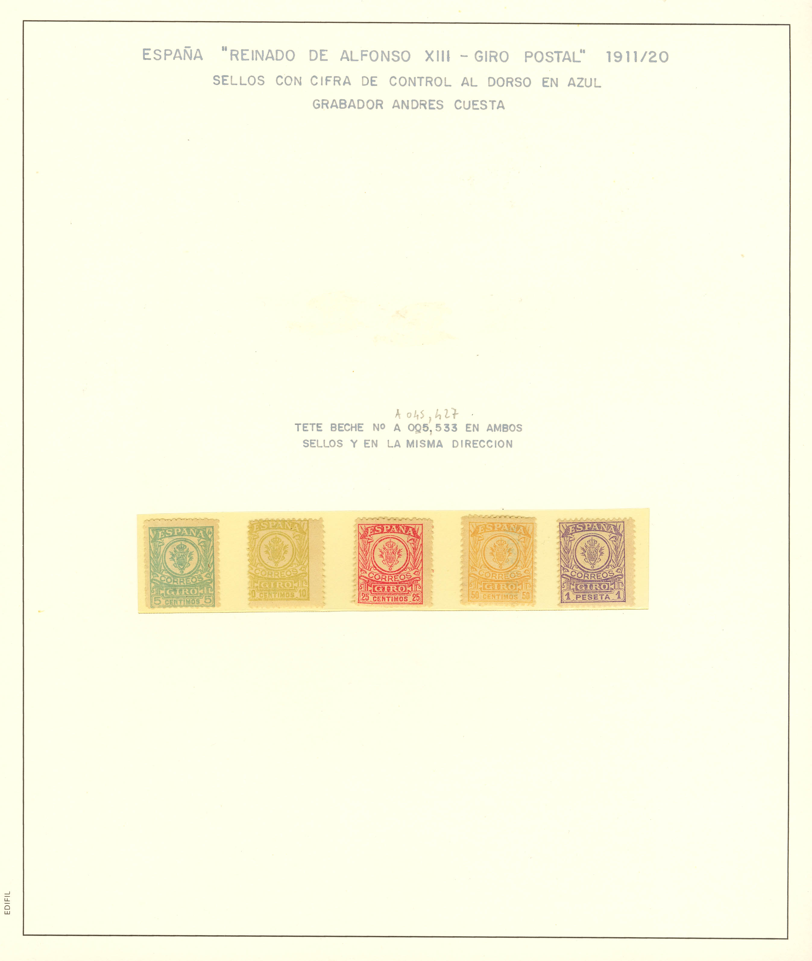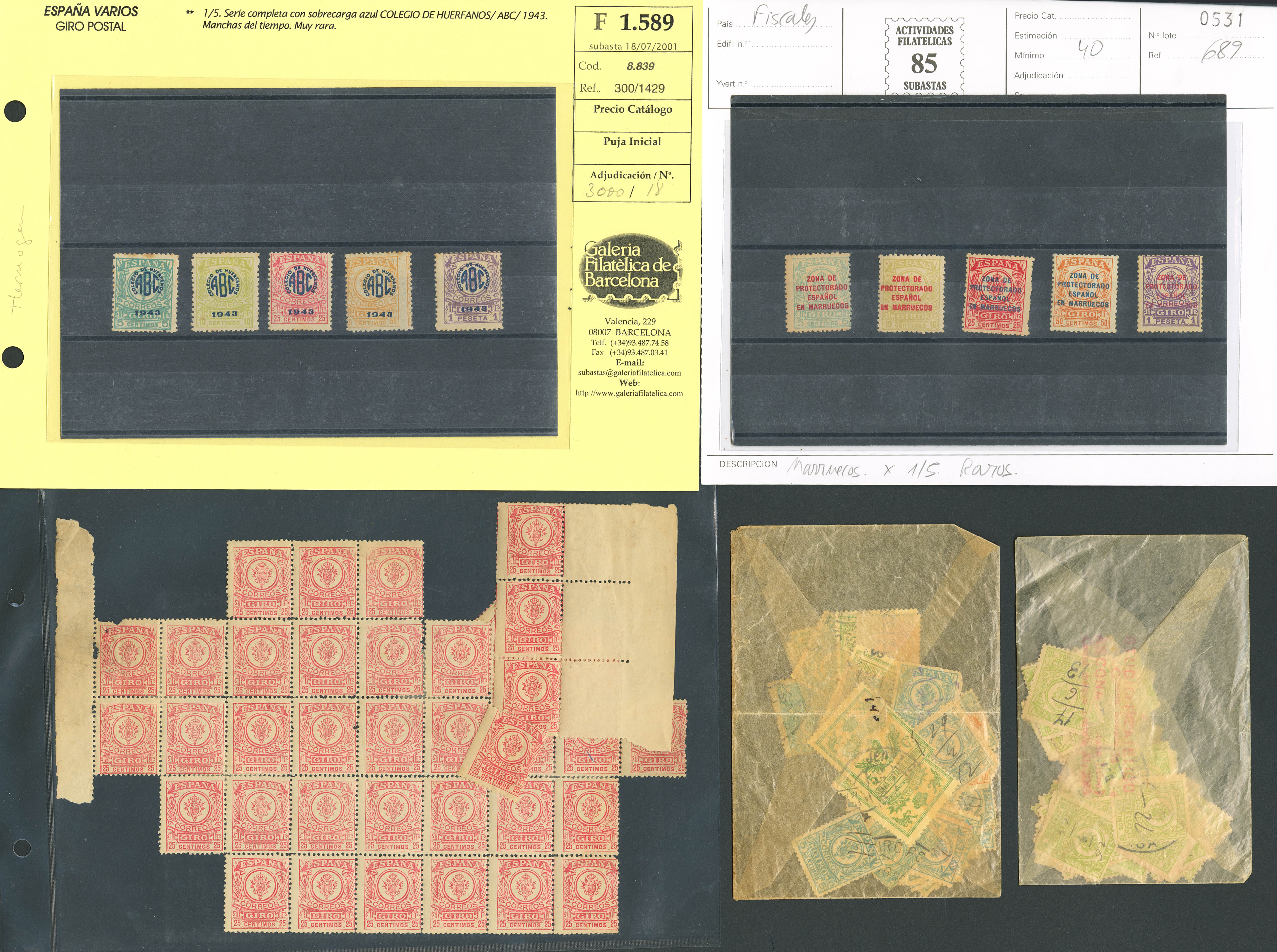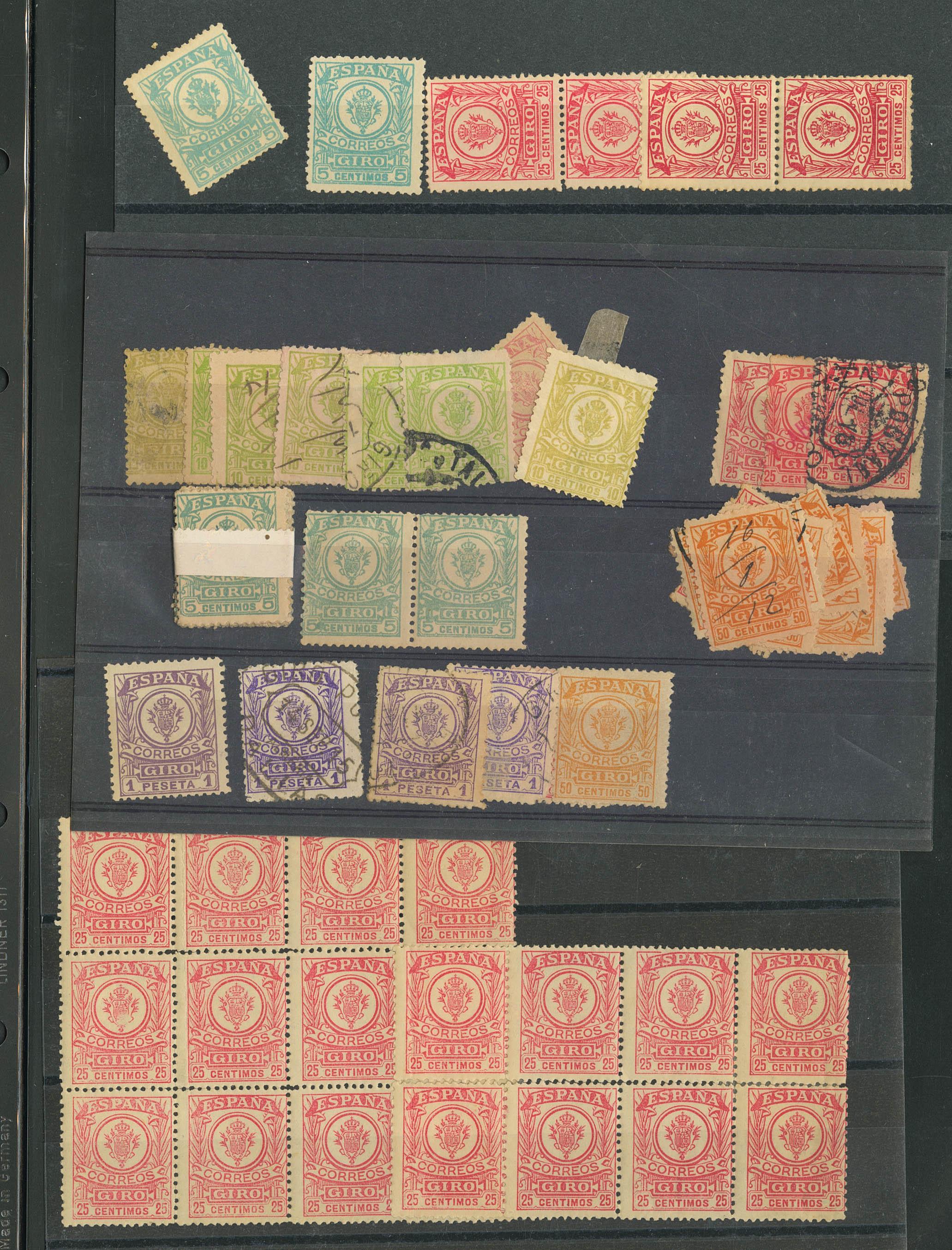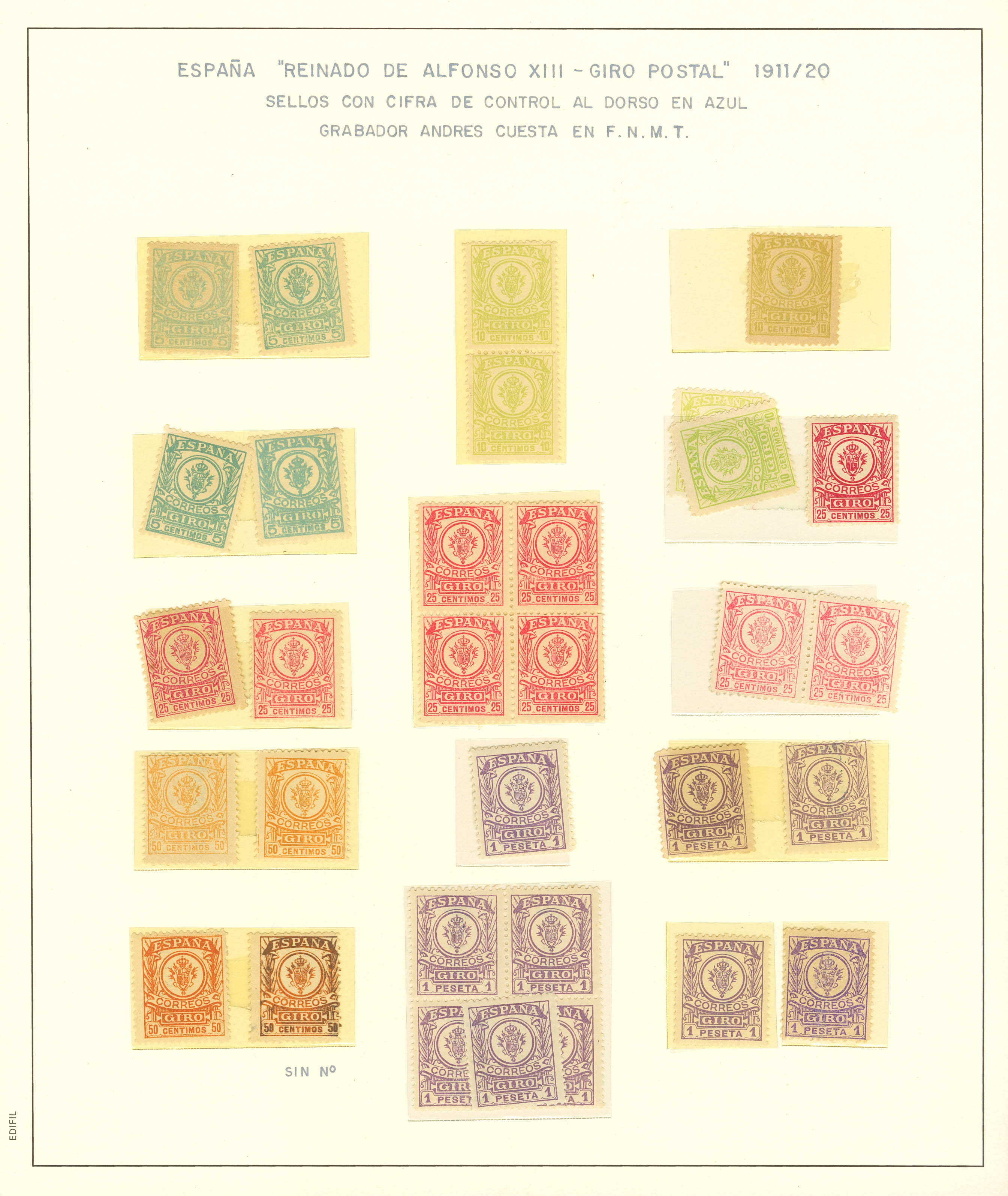 English ★/1911. Spectacular study set of the 1911 postal money order issue, in mint and used condition, including color variants, blocks, and two palindromic (mint and used) 10-cent green-yellow notes, plus a money order document, a series with a Morocco overprint, and another with a 1943 Orphanage/AFine overprint. A MAGNIFICENT AND RARE SET. ESSENTIAL FOR EXAMINATION. Ex-Alemany.